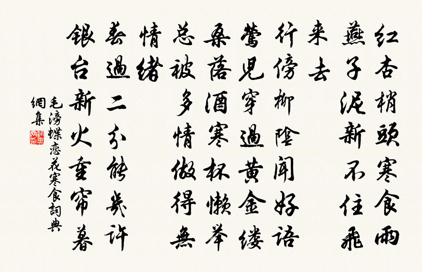 紅杏梢頭寒食雨。燕子泥新,不住飛來去。