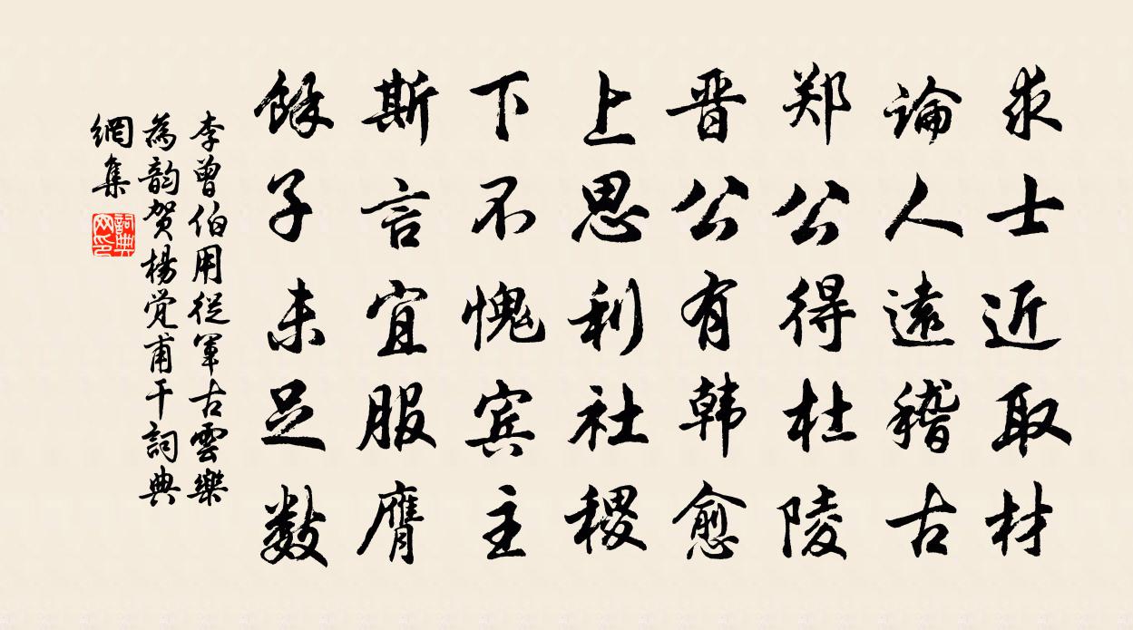 詩詞名句歷史字典書法欣賞書法字典國語詞典說文解字康熙字典古漢語字典標 題 作 者 詩 句 用從軍古雲樂為韻賀楊覺甫乾作者:李曾伯 朝代:宋代原文求士近取材,論人遠稽古。鄭公得杜陵,晉公有韓愈。上思利社稷,下不愧賓主。斯言宜服膺,餘子未足數。詩詞問答問:《用從軍古雲樂為韻賀楊覺甫乾》的作者是誰?答:李曾伯問:該詩寫於哪個朝代?答:宋代書法欣賞用從軍古雲樂為韻賀楊覺甫乾書法作品詩詞推薦暑雨陸游〔宋代〕草茂水長蛙群鳴,窪深路壤人斷行。故侯老退守瓜壟,翠蔓黃花偏眼明。句王龜〔唐代〕珠箔卷繁星,金樽瀉月明。晨興魏野〔宋代〕夜長乞待得晨興,躭睡童猶喚不應。燒葉爐中無宿火,讀書閣下有殘燈。臨階短髮梳和月,傍岸衰容洗帶冰。料得歸途次韻黃彥平〔宋代〕湘桃亦作春風面,與拭中原淚眼看。舊染天香悲麥秀,續書王夢失槐安。偈傾一百六十九首釋智朋〔宋代〕頭頂天,腳踏地。開口吃飯,鼻孔出氣。死盡活,活盡死。百尺竿頭更進一步,未夢見衲僧巴鼻。達磨迢迢西來,寄題萬元享舍人園享七景倚苕楊萬里〔宋代〕何處苕溪好,請君來倚樓。西山也驩喜,奔走入簾鉤。鷓鴣天(薛公肅家席上作·七之七)陸游〔宋代〕南浦舟中兩玉人。誰知重見楚江濱。憑教後苑紅牙版,引上西川綠錦茵。才淺笑,卻輕嚬。淡黃楊柳又催春。情知黔中酬同院韋判官李頻〔唐代〕平生同所為,相遇偶然遲。各著青袍後,無歸白社期。江流來絕域,府地管諸夷。新地都無事,從公且賦詩。讀徐道暉集徐璣〔宋代〕悟得玄虛理,能令句律精。生前惟瘦苦,身後得名清。朋友裒錢葬,先生有筆評。林頭舊題名,苔蘚帶雲生。賦友授徒趙友直〔宋代〕孤竹清風迥,尼壇化雨淋。群英公樂育,何必羨華簪。和陳贊善致仕還京口徐鉉〔唐代〕海門山下一漁舟,中有高人未白頭。已駕安車歸故里,尚通閨籍在龍樓。泉聲漱玉窗前落,江色和煙檻外流。今日挽何南坡王柏〔宋代〕刻苦工夫真實心,一言體用已全陳。聖賢斷續三千載,伯仲漸摩八十春。保護斯文勤且讓,作成吾黨敬而親。我來白雲歌送劉十六歸山李白〔唐代〕楚山秦山皆白雲,白雲處處長隨君。長隨君,君入楚山里,雲亦隨君渡湘水。湘水上,女蘿衣,白雲堪臥君早歸。昨幸甚得見子玉教授丈得一論其說出於訂頑克度正〔宋代〕新泉瀹茗瀛詩魂,繙閱如飛徹曉昏。是石無瑕終是石,莫教抱璞退聲冤。弈棋二首呈任公漸黃庭堅〔宋代〕偶無公事客休時,席上談兵校兩棋。心似蛛絲游碧落,身如蜩甲化枯枝。湘東一目誠甘死,天下中分尚可持。誰謂病間寄郡中文士許渾〔唐代〕盧橘含花處處香,老人依舊臥清漳。心同客舍驚秋早,跡似僧齋厭夜長。風卷翠簾琴自響,露凝朱閣簟先涼。明朝和圓通禪老韻二首袁燮〔宋代〕新詩的皪綴明璣,道行清通照碧溪。塵絆無因到蘭若,聊將兩絕當留題。晨興書所見葛紹體〔宋代〕等閒日月任西東,不管霜風著鬢蓬。滿地翻黃銀杏葉,忽驚天地告成功。呈李贛州四首趙蕃〔宋代〕安否每難問,姓名今得通。久憂埋積雪,大喜得春風。與世故多識,如公能幾同。既欣還有感,愁對海棠叢。寄屠存博仇遠〔宋代〕三年塵土白鬚眉,擬向西湖濯客衣。林下杜鵑猶勸去,海邊鷗鳥亦知幾。及瓜將得葵丘代,存菊須尋栗里歸。見說名句推薦一粥一飯,當思來處不易;半絲半縷,恆念物力維艱。朱柏廬《朱子家訓·全文》 梁園日暮亂飛鴉,極目蕭條三兩家。岑參《山房春事二首》 世業事黃老,妙年孤隱淪宋之問《始安秋日》 子不能治子之身,惡能治國政。墨子《墨子·48章 公孟》 有功於前,有敗於後,不為損刑。有善於前,有過於後,不為虧法。商鞅《商君書·賞刑》 善惡到頭終有報,只盼來早與來遲。佚名《增廣賢文·上集》 湖南為客動經春,燕子銜泥兩度新。杜甫《燕子來舟中作》 白雲回望合,青靄入看無。王維《終南山》 三月休聽夜雨,如今不是催花。張炎《清平樂·采芳人杳》 一騎紅塵妃子笑,無人知是荔枝來。杜牧《過華清宮絕句三首》