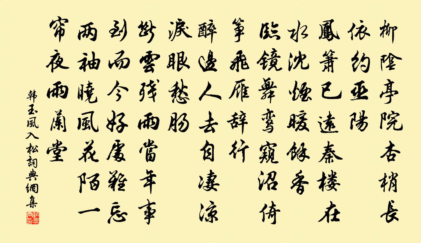 詩詞名句歷史字典書法欣賞書法字典國語詞典說文解字康熙字典古漢語字典標 題 作 者 詩 句 風入松作者:韓玉 朝代:宋代風入松原文柳陰亭院杏梢長。依約巫陽。鳳簫已遠秦樓在,水沈煙暖餘香。臨鏡舞鸞窺沼,倚箏飛雁辭行。醉邊人去自淒涼。淚眼愁腸。斷雲殘雨當年事,到而今、好處難忘。兩袖曉風花陌,一簾夜雨蘭堂。詩詞問答問:風入松的作者是誰?答:韓玉問:風入松寫於哪個朝代?答:宋代問:風入松是什麼體裁?答:詞韓玉風入松書法欣賞風入松書法作品詩詞推薦偈頌九首釋如淨〔宋代〕西湖湖裡水,南山山上雲。天台拄杖子,相見笑忻忻。晉陰山廟馬之純〔宋代〕相君一日到郊坰,步騎俄逢十數兵。拂曉見來殊隱約,中宵夢此極分明。陰山血食當知我,晉帝南巡適從行。事既落花李商隱〔唐代〕高閣客竟去,小園花亂飛。參差連曲陌,迢遞送斜暉。腸斷未忍掃,眼穿仍欲歸。芳心向春盡,所得是沾衣。感興利登〔宋代〕寂寂臥空晝,憂懷忽無端。攬衣亂西澗,復此凌西山。春事已無多,半消霜霰間。狂風更甚雨,時蔽江南天。寒草送金城公主適西蕃武平一〔唐代〕廣化三邊靜,通煙四海安。還將膝下愛,特副域中歡。聖念飛玄藻,仙儀下白蘭。日斜征蓋沒,歸騎動鳴鸞。【正宮】綠麼遍喬吉〔元代〕自述不占龍頭選,不入名賢傳。時時酒聖,處處詩禪,煙霞狀元,江湖醉仙,笑談便是編修院。留連,批風抹月四奉和九日幸臨渭亭登高應制得枝字韋安石〔唐代〕重九開秋節,得一動宸儀。金風飄菊蕊,玉露泫萸枝。 睿覽八紘外,天文七曜披。臨深應在即,居高豈忘危。鄴北旅中懷友人寇準〔宋代〕浮世多塵事,悠悠難定期。夢闌懷遠夜,秋盡望鄉時。道在應無悶,風澆自業詩。何當歸釣渚,搘肘一沉思。讀范文正公神道碑有感佚事陳傅良〔宋代〕武侯不可致,玄德造其廬。公在衰絰中,乃上時政書。維時君臣定,事與草昧殊。出處千載同,豈必名跡如。行伍雉丁謂〔宋代〕雉操揚琴奏,名翬拂扇塵。其文伊洛地,厥貢越裳人。幾為郎官集,還因今邑馴。山樑時飲啄,媒翳莫朝親。芰荷香万俟詠〔宋代〕小瀟湘。正天影倒碧,波面容光。水仙朝罷,間列綠蓋紅幢。吹風細雨,盪十頃、浥浥清香。人在水精中央。霜綃螢強至〔宋代〕幸藉炎蒸力,因遷腐草蹤。清宵能自照,暗室肯相容。雨巷幽光晦,風簾亂點重。臨書方汝賴,惟恐有鳴蛬。江神子令劉志淵〔元代〕曩甘聰黜體還隳。索玄機。守謙卑。地久天長,迤邐志遲疑。法弱馬顛亡羈勒,風花陣,恣賓士。縱橫熟境意熙熙小勞劉克莊〔宋代〕性不耐閒懶,小勞方小佳。鋸沉成薄片,末麝入新芽。送英公大師歸終南盧岳〔宋代〕擬息遊方興,蘿龕近翠微,幾程勞夜夢,一錫向秋歸。月彩籠清磬,嵐光潤紫衣。重尋溪上路,楓葉下岩扉。芍藥(元和中知制誥寓直禁中作)韓愈〔唐代〕浩態狂香昔未逢,紅燈爍爍綠盤籠。覺來獨對情驚恐,身在仙宮第幾重。相見歡·落花如夢淒迷納蘭性德〔清代〕落花如夢淒迷,麝煙微,又是夕陽潛下小樓西。愁無限,消瘦盡,有誰知?閒教玉籠鸚鵡念郎詩。今上初登極歲送皇甫孝廉赴選(孝廉即故大夫之子)皎然〔唐代〕行應會府春,欲勸及芳辰。北極天文正,東風漢律新。少年逢新地,歡笑別情親。況是勛庸後,恩榮襲爾身。夏日題鄭谷江上納涼館皎然〔唐代〕迢遙山意外,清風又對君。若為於此地,翻作路岐分。別館琴徒語,前洲鶴自群。明朝天畔遠,何處逐閒雲。古意謝崔楊州辟七首洪咨夔〔宋代〕攕攕兒女手,申旦軋機杼。織成遍地錦,翠鳳濕花露。三年卷篋中,背立泣不遇。持歸付刀尺,晝線金針度。名句推薦人稟七情,應物斯感,感物吟志,莫非自然。劉勰《文心雕龍·明詩》 女為君子儒,無為小人儒。孔子弟子《論語·雍也篇》 黃華自與西風約,白髮先從遠客生。元好問《秋懷》 樓前綠暗分攜路,一絲柳、一寸柔情。吳文英《風入松·聽風聽雨過清明》 形在江海之上,心存魏闕之下劉勰《文心雕龍·神思》 惟有兩行低雁,知人倚、畫樓月。范成大《霜天曉角·梅》 春衫著破誰針線,點點行行淚痕滿。黃公紹《青玉案·年年社日停針線》 君在陰兮影不見,君依光兮妾所願。傅玄《車遙遙篇》 風雨送春歸,飛雪迎春到。 * 《卜運算元·詠梅》 坐蔭從容煩暑退,清心恍惚微香觸。陸容《滿江紅·詠竹》