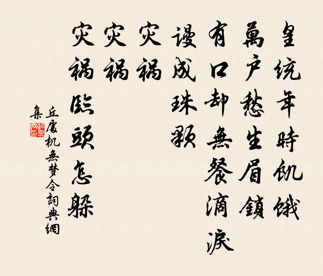 詩詞名句歷史字典書法欣賞書法字典國語詞典說文解字康熙字典古漢語字典標 題 作 者 詩 句 無夢令作者:丘處機 朝代:元代無夢令原文皇統年時飢餓。萬戶愁生眉鎖。有口卻無餐,滴淚謾成珠顆。災禍。災禍。災禍臨頭怎躲。詩詞問答問:無夢令的作者是誰?答:丘處機問:無夢令寫於哪個朝代?答:元代問:無夢令是什麼體裁?答:詞丘處機無夢令書法欣賞無夢令書法作品詩詞推薦閱秦紀二首孫嵩〔宋代〕泰岳聊逃雨,湘山偶阻風。伐樹仍封樹,元無罪與功。次林和靖先生梅韻葉茵〔宋代〕世上群芳未敢妍,獨將春色占南園。生來清質十分瘦,肯受紅塵一點昏。東閣詩成慶動興,西湖仙去謾招魂。使須宮詞王仲修〔宋代〕蒙金衫子鬱金黃,愛拍伊州入側商。人道飛瓊元自瘦,娉婷偏稱窄衣裳。又再用韻和趙汝騰〔宋代〕後期採菊約新酬,笑指西風帽戀頭。陸羽久仙泉水在,紫芝何代寺峰留。霞邊野霧供吟嘯,澤畔歸鴻免嘆愁。愧乏晚歸徐鉉〔唐代〕暑服道情出,煙街薄暮還。風清飄短袂,馬健弄連環。水靜聞歸櫓,霞明見遠山。過從本無事,從此涉旬間。緣識宋太宗〔宋代〕煩惱浮生業,愚迷智自通。根塵如不染,識照曩緣空。偈頌一百三十六首釋惟一〔宋代〕這裡如大火聚,近之則燎卻面門。直饒佛到來,未免退身有分。記仙女三絕董嗣杲〔宋代〕屈曲闌乾月半規,藕花香淡水漪漪。分明一夜文姬夢,只有青團扇子知。夜寒陸游〔宋代〕斗帳重茵香霧重,膏粱那可共功名。三更騎報河冰合,鐵馬何人從我行。壽史刑使趙汝騰〔宋代〕岷峨儲英賢,一例皆家食。公亦淹海角,麾節猶赫奕,七閩政多幸,福星照南極。輕裘鎮鈴閣,使斧光衛戟。門弧句鍾克俊〔宋代〕自許有身埋漢土,終憐無淚哭秦廷。幽棲陸游〔宋代〕閒人了無事,地僻稱幽棲。(左臼右市)米留雞食,移琴避燕泥。桐生窗欲暗,筍長徑還迷。不作容車計,門閭盡展掃先塋袁說友〔宋代〕寂寞千松老,縈紆一水通。重來驚鬢雪,遺恨滿春風。拱木人何在,傷心淚已窮。羇懷不成寐,月落半山空。戲示子舍二首曹勛〔宋代〕八八光陰又四春,同柈殊少去年人。不妨諸子頻修供,莫厭擊鮮休說貧。生查子司馬遷〔兩漢〕裙長步漸遲,扇薄羞難掩。鞋褪倚郎肩,問路眉先斂。踏青南陌回,倚醉開嬌靨。今夜更同行,忍笑勻妝臉。早秋寄題天竺靈隱寺賈島〔唐代〕峰前峰後寺新秋,絕頂高窗見沃洲。人在定中聞蟋蟀,鶴從棲處掛獼猴。山鍾夜渡空江水,汀月寒生古石樓。心憶中{左氵右霝}泉舊在揚子江心今題金山寺井曰林景熙〔宋代〕蜀波萬里與淮連,揚子江心浪折天。陸羽當年亦奇士,驪龍蟄處識名泉。金鰲背上汲清泠,僧說龍移遠脈靈。若定偶書孔武仲〔宋代〕暮上高樓聽村笛,清風寥寥吹澤國。蒼山莽野百戰地,美木陰林四時色。浩蕩坤乾萬里中,風光盡屬漁樵客。侄孫子淵新居落成二首戴復古〔宋代〕結屋鄰蒼海,開門面翠屏。堂前萱草綠,壽母鬢絲青。禮樂陳樽俎,詩書立戶庭。一時勤卜築,百世享康寧。過內官孫可久別叢賦贈石延年〔宋代〕南北沾河潤,幽深在禁城。疊山知遠意,辭俸買間名。閉戶斷蛛網,折花移鳥聲。誰人識高趣,朝野石渠生。名句推薦不信妾腸斷,歸來看取明鏡前。李白《長相思三首》 香霧雲鬟濕,清輝玉臂寒。杜甫《月夜》 樸實渾厚,初無甚奇,然培子孫之元氣者,必此人也。王永彬《圍爐夜話·第十九則》 水至清則無魚,人太急則無智。佚名《增廣賢文·上集》 衰蘭送客鹹陽道,天若有情天亦老。李賀《金銅仙人辭漢歌》 當路誰相假,知音世所稀孟浩然《留別王侍御維/留別王維》 澄江平少岸,幽樹晚多花。杜甫《水檻遣心二首》 連天衰草,望斷歸來路。李清照《點絳唇·閨思》 杏花無處避春愁,也傍野煙發韓元吉《好事近·汴京賜宴聞教坊樂有感》 卻下水晶簾,玲瓏望秋月。李白《玉階怨》