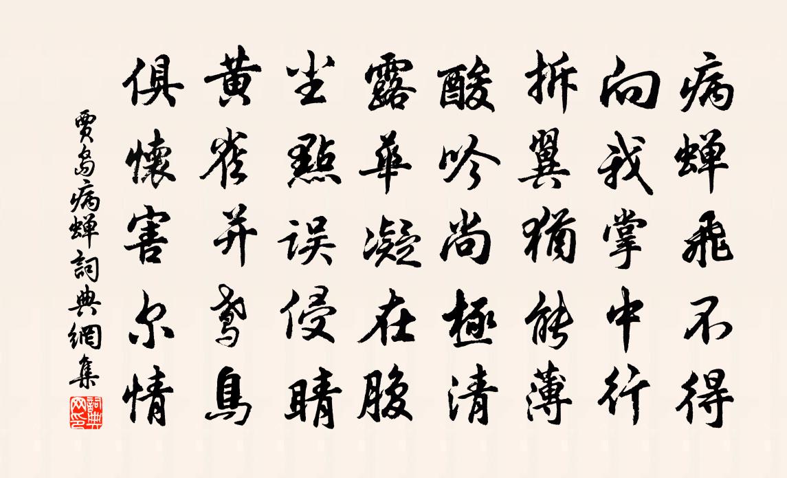 詩詞名句歷史字典書法欣賞書法字典國語詞典說文解字康熙字典古漢語字典標 題 作 者 詩 句 病蟬作者:賈島 朝代:唐代病蟬原文病蟬飛不得,向我掌中行。拆翼猶能薄,酸吟尚極清。露華凝在腹,塵點誤侵睛。黃雀並鳶鳥,俱懷害爾情。詩詞問答問:病蟬的作者是誰?答:賈島問:病蟬寫於哪個朝代?答:唐代問:病蟬是什麼體裁?答:五律問:賈島的名句有哪些?答:賈島名句大全賈島病蟬書法欣賞病蟬書法作品注釋全唐詩:卷573-36詩詞推薦與諸同僚偶會賦八題登賞心亭蘇頌〔宋代〕秦淮接長江,活活流不已。高亭出城角,四面盡湍水。山川孤雲飛,檻閣清風起。望遠何所思,故人在千里。臨邛計次魏自言六世祖破荒先生晚居景陵因葬度正〔宋代〕如何袖手伏山岩,頃刻猶能草百函。胸次宏規標眾正,筆端勁氣磔群讒。行看雲漢翻鴻羽,更喜秋風送馬銜。南國再用前韻賦蘇軾〔宋代〕樂天霜鬢如霜菅,始知謝遣素與蠻。我兄綠髮蔚如故,已了夢幻齊人間。蛾眉勸酒聊爾耳,處仲太忍茂弘孱。三杯望思台強至〔宋代〕一朝木偶發深宮,父子恩隳晻曖中。不見戾園埋恨處,至今草木有悲風。溪上宋祁〔宋代〕溪上玩秋水,使人意自清。烈烈回飈餘,鱗鱗夕浪生。有魚可垂餌,有蒲可芼羹。況值新酒熟,鮭菜辛鹹並。興來重九考罷試卷書呈同院諸公二首鄧忠臣〔宋代〕題遍朱簽棟宇充,燈窗長聽景陽鍾。昏眵直要金篦刮,黎瘦都如飯顆逢。文律自隨星斗變,月評應合士人從。了無秋日與天章侍講王原叔曾明仲正言余安道三學宋祁〔宋代〕長廊盡北到禪扃,宴坐林間共褫纓。秋氣只知雙鶴唳,塵喧已去一牛鳴。晨鐘暮磬無時歇,翠竹黃花相間明。妙墨王廉使真山民〔宋代〕鼻祖名高三諫官,耳孫玉立又台端。氣增浙左霜威動,面帶終南山色寒。攬轡肯教狼臥地,歸班便合豸峨冠。公餘鹿苑寺周弼〔宋代〕分半作民棲,猶藏一曲溪。鵲窺蓮葉座,僧占菜花畦。白蠹魚銷粉,青乾獸剝泥。幸留唐刻在,相伴峻郎題。滿江紅秦觀〔宋代〕風雨蕭蕭,長途上、春泥沒足。謾回首、青山無數,笑人勞碌。山下粉粉梅落粉,渡頭淼淼波搖綠。想小園、寂寞題翠蛟亭李斗南〔宋代〕壯士傳觀山石間,腰頭寶劍祥光吐。摩挲醉眼叱海神,嫌殺蛟龍作妖舞。說謎三絕吳儆〔宋代〕奔波來往一生忙,方寸包藏不可量。用盡心機還骨立,為他人作嫁衣裳。丙戌五月朔閒坐偶成陳著〔宋代〕石火光中見歲華,溪雲深處寄生涯。詩書屋下無嬉具,桑竹窗前有美花。拗境日增多活愧,囂塵天與一貧遮。乾坤山居雜詩九十首曹勛〔宋代〕秋暑正炎酷,人不得以息。向晚注大雨,劇暑遂掃跡。蕭然物氣平,暫止火御職。上天常好生,一涼誠大德。送陸暢歸江南(暢娶董溪女)韓愈〔唐代〕舉舉江南子,名以能詩聞。一來取高第,官佐東宮軍。迎婦丞相府,夸映秀士群。鸞鳴桂樹間,觀者何繽紛。人事拜相第五十五文天祥〔宋代〕我來屬時危,朝野色枯槁。倚君金華省,不在相逢早。送周衍長官知遼州梅堯臣〔宋代〕二月遼陽去,遼陽草未生。春風吹鬍沙,捲起黃雲平。土人耕耨晚,種黍何時成。塞地寒且薄,百役子宜輕。子湖有狗上取人頭中取人心下取人足釋慧遠〔宋代〕子湖有狗取人足,舞罷饒君三兩曲。玉{左革右登}金鞍挽莫回,夜來依舊蘆花宿。偈頌八十五首釋妙倫〔宋代〕面面相對,心心相知。人情若好,吃水也肥。次法石寺即事韻胡仲弓〔宋代〕近郊來往熟,馴犬向人迎。半是吟將老,何時隱得成。月明山景合,潮落海痕生。歸路霜鍾外,微聞三數聲。名句推薦不見去年人,淚濕春衫袖。歐陽修《生查子·元夕》 草鋪橫野六七里,笛弄晚風三四聲。呂岩《牧童》 唯有長江水,無語東流。柳永《八聲甘州·對瀟瀟暮雨灑江天》 絡緯秋啼金井闌,微霜淒淒簟色寒。李白《長相思·其一》 擬借寒潭垂釣,又恐鷗鳥相猜,不肯傍青綸。蘇舜欽《水調歌頭·滄浪亭》 庭軒寂寞近清明,殘花中酒,又是去年病。張先《青門引·春思》 京國多年情盡改,忽聽春雨憶江南。虞集《聽雨》 乖僻自是,悔誤必多;頹惰自甘,家道難成。朱柏廬《朱子家訓·全文》 父兮生我,母兮鞠我。佚名《蓼莪》 君子貴其身而後能及人,是以有禮。左丘明《左傳·昭公·昭公二十五年》