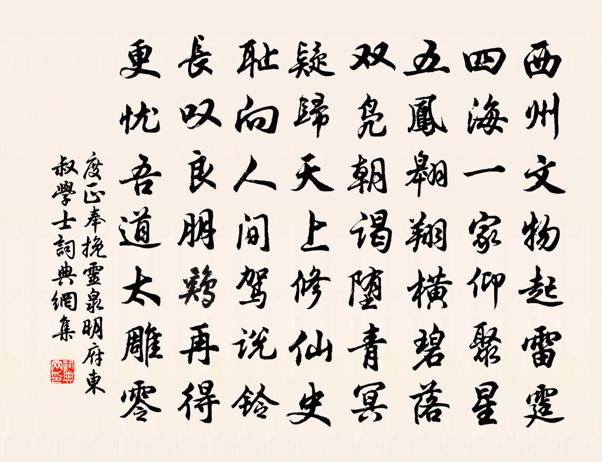 詩詞名句歷史字典書法欣賞書法字典國語詞典說文解字康熙字典古漢語字典標 題 作 者 詩 句 奉挽靈泉明府東叔學士作者:度正 朝代:宋代奉挽靈泉明府東叔學士原文西州文物起雷霆,四海一家仰聚星。五鳳翱翔橫碧落,雙鳧朝謁墮青冥。疑歸天上修仙史,恥向人間駕說鈴。長嘆良朋雞再得,更憂吾道太雕零。詩詞問答問:奉挽靈泉明府東叔學士的作者是誰?答:度正問:奉挽靈泉明府東叔學士寫於哪個朝代?答:宋代度正奉挽靈泉明府東叔學士書法欣賞奉挽靈泉明府東叔學士書法作品詩詞推薦梅花喜神譜爛熳二十八枝宋伯仁〔宋代〕足下一封書,子卿歸自虜。雖曰誑單于,孤忠傳萬古。寄新息王令藏春塢秦觀〔宋代〕令尹才高寺為空,歲時行樂與民同。旋開小塢藏春色,更制新聲寫土風。客向樽前忘爾汝,路穿花去失西東。無言初夏閒居陸游〔宋代〕煮酒青梅次第嘗,啼鶯乳燕占年光。蠶收戶戶繅絲白,麥熟村村搗麥香。民有褲襦知歲樂,亭無桴鼓喜時康。未嘗去冬鄭剛中〔宋代〕去冬竹瓦迎新雪,曾下珠璣到酒盤。正月便回春意暖,五更微帶雁聲寒。門諳寂寞何須翟,鬢就衰殘豈是潘。祗有勿言魯酒薄為史端叔作也端叔同寮於越未終更喻良能〔宋代〕同寮雖雲多,交友未易結。臭味一小異,肝膽便楚越。君侯宰相子,風度何翩翩。四偕計吏貢,春銓復襃然。一見送吳鍊師歸王屋張籍〔唐代〕玉陽峰下學長生,玉洞仙中已有名。獨戴熊須冠暫出,唯將鶴尾扇同行。煉成雲母休炊爨,已得雷公當吏兵。卻到讀江總傳鄭文寶〔宋代〕行人慵過景陽宮,宮畔離離禾黍風。庭玉有花空怨白,井蓮無步莫愁紅。吟詩功業才雖大,亡國君臣道最同。爭忍謝人送白山茶花二首張鎡〔宋代〕韻勝初聞不記年,偶逢俄在軟紅邊。山礬不遇南昌老,爭得嘉名亞水仙。乙巳邵武建寧夜坐書呈諸公陳普〔宋代〕鶺鴒翡翠各毛衣,未有絲麻亦衣皮。白書不冠對妻子,要令天地撤方維。因仰山氣毬頌釋重顯〔宋代〕四大假合非虛妄,儱儱侗侗為二相。東西南北不相知,留與衲僧作榜樣。汾陰十首真宗〔宋代〕博厚流形,秉險成德。柔順利正,直方維則。明祗格思,素汾之側。祗載吉蠲,宸心翼翼。宗忠簡留守司二劄家書吾友三帖贊岳珂〔宋代〕人心大義,不作不奮。楚漢之間,較者尺寸。翼翼京邑,九聖所都。時方多艱,天下之樞。勢進則張,狙詐作使。逆旅陸游〔宋代〕秋晚南山行,小蹇就店秣。我亦念少休,無奈市兒聒。嗟爾亦坐飢,錙銖苦爭奪。其心計亦厭,陷溺無自脫。我欲郊廟歌辭。晉昭德成功舞歌。武功舞歌二首佚名〔唐代〕撥亂資英主,開基自晉陽。一戎成大業,七德煥前王。炎漢提封遠,姬周世祚長。朱干將玉戚,全象武功揚。睿算答僧釋遇安〔宋代〕欲識曹溪旨,雲飛前面山。分明真實個,不用別追攀。南鄉子(和元規)張繼先〔宋代〕無奈這群迷。味色聲中若系羈。盡任改頭兼換面,何悲。不染伊時不管伊。春去又秋兮。莫遣空逾十二時。好把自鷓鴣天元好問〔金代〕好夢初驚百感新。誰家歌管隔牆聞。殘燈收罷空明月,臘雪消融更暮雲。鶯有伴,雁離群。西窗寂寞酒微醺。春寒雨後郭印〔宋代〕氣候西南異,山川自一方。暑殘秋更熱,雨過夜初涼。燈火容緗帙,詩書有錦囊。更深猶不寐,暗露襲衣裳。踏雲行 次重陽韻馬鈺〔元代〕因遇風仙,頭分丫角。從今陡頓忘形殼。攀援愛念上心來,被予慧照先知覺。景滅澄明,道光遙邈。爐中露就靈靈女冠子孫光憲〔唐代〕蕙風花芝露,壇花際殘香輕度。蕊珠花,苔點分圓碧,桃花踐破紅。品流巫峽外,名籍紫微中。真侶墉城會,夢魂名句推薦闌風伏雨催寒食,櫻桃一夜花狼藉。納蘭性德《菩薩蠻·闌風伏雨催寒食》 風吹古木晴天雨,月照平沙夏夜霜。白居易《江樓夕望招客》 溪谷少人民,雪落何霏霏!曹操《苦寒行》 去來江口守空船,繞船月明江水寒。白居易《琵琶行 / 琵琶引》 閒坐悲君亦自悲,百年多是幾多時。元稹《遣悲懷三首·其三》 霜風漸欲作重陽,熠熠溪邊野菊香。蘇軾《捕蝗至浮雲嶺山行疲苶有懷子由弟二首·其二》 凡出軍行師,或遇沮澤、圮毀之地,宜倍道兼行速過,不可稽留也。佚名《百戰奇略·第四卷·澤戰》 為善則流芳百世,為惡則遺臭萬年。程登吉《幼學瓊林·卷三·人事》 積薄而為厚,聚少而為多劉向《戰國策·秦四·或為六國說秦王》 湛湛長江去,冥冥細雨來。杜甫《梅雨》