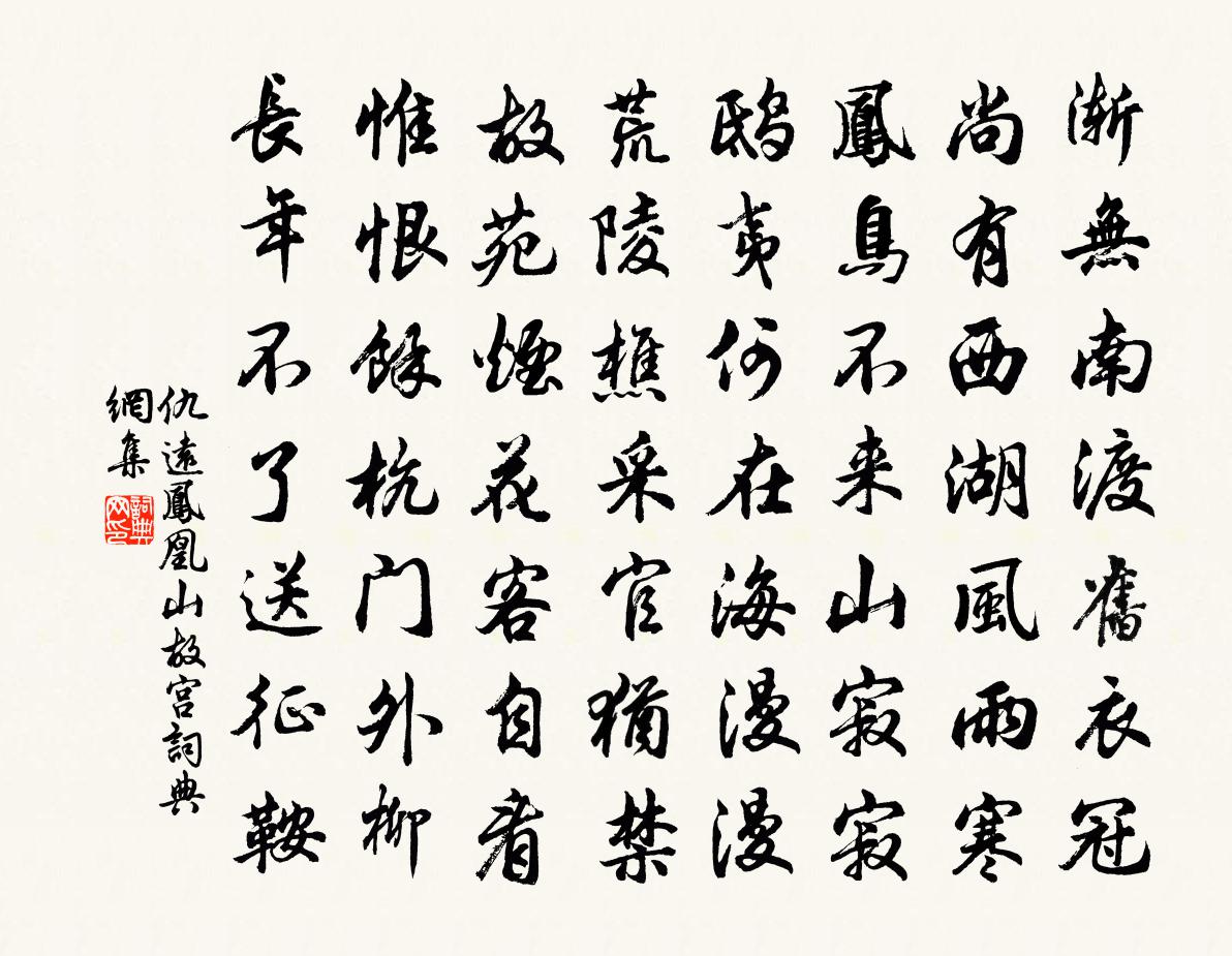 詩詞名句歷史字典書法欣賞書法字典國語詞典說文解字康熙字典古漢語字典標 題 作 者 詩 句 鳳凰山故宮作者:仇遠 朝代:宋代鳳凰山故宮原文漸無南渡舊衣冠,尚有西湖風雨寒。鳳鳥不來山寂寂,鴟夷何在海漫漫。荒陵樵採官猶禁,故苑煙花客自看。惟恨餘杭門外柳,長年不了送征鞍。詩詞問答問:鳳凰山故宮的作者是誰?答:仇遠問:鳳凰山故宮寫於哪個朝代?答:宋代仇遠鳳凰山故宮書法欣賞鳳凰山故宮書法作品詩詞推薦送僧釋文珦〔宋代〕空山草木秋,相送古原頭。倦客難為別,寒蛩替說愁。舊房深翠壁,歸路隔滄洲。後夜多明月,相思為上樓。漁家傲侯置〔宋代〕過盡百花芳草滿。柳絲舞困闌乾暖。柳外鞦韆裙影亂。人逐伴。舊家心性如今懶。斗帳寶香凝不散。黃昏院落鶯聲山居述懷薛嵎〔宋代〕山瓢動瀑冰,一枕曲肱清。未遇勤求日,非沽隱逸名。梅邊月在水,寒夜酒如兵。悟得乘除數,貧中心自平。【南呂】四塊玉_雪湖和人韻趙善慶〔元代〕雪湖和人韻近水堤,臨山寺,竹外橫斜兩三枝,樓前談詠無多事。白戰詩,白薴詞,白玉卮。中秋登青原台鄭作肅〔宋代〕去年中秋節,鄭州正弄兵。羽檄方四馳,酒觴難一傾。今年當此日,往事久已平。不但櫜弓矢,又復見豐登。桂魄用尊字韻寄胡約之汪晫〔宋代〕芙蓉經晚對高軒,何日論文共一尊。祗作古詩十九首,不消柱史五千言。一聲南雁霜華重,連夜西風不葉翻。自嘆句董儼〔宋代〕白雲深處訪禪扉,一簇樓台鎖翠微。夜聽劉昭遠彈琴王之道〔宋代〕河陰高轉月光流,露腳斜飛夜氣收。焦尾冷含三尺水,悲風彈破一庭秋。廣陵別後多新操,子敬亡來絕舊遊。欲洗南歌子王吉昌〔元代〕洞鎖猿馴靜,韁收馬不顛。氣凝神聚契空圓。浩劫雲收,長傲自家天。皓月清風爽,祥光罩瑞蓮。木人石女共談玄木蘭花/玉樓春佚名〔宋代〕蓂開五葉。正是瑤池逢誕節。昨夜觀星。南極邊頭婺女明。家鄰九曲。壽比群仙何待祝。滿勸金鍾。但問蟠桃幾度寄題蘭陵郡齋梅露堂曾協〔宋代〕蘭陵為郡更齊梁,地望卓犖聞四方。清班詵詵儲材良,相踵往佩太守章。憲公遺愛初未忘,當時瑞露今名堂。於茲武陵春侯善淵〔元代〕一葉梧桐窗外落,金菊出疏籬。策杖昂簪信步移。迷我曲江池。鶴駕匆匆歸舊路,回首赴仙期。雲映青童笑問伊。韓知合輓詩虞儔〔宋代〕一品真王裔,先朝長主孫。華途聲烈在,上合典刑存。閭里群知敬,朝廷愈覺尊。天胡嗇之壽,莫返九原魂。乙巳秋暮獨酌陸游〔宋代〕山陰老道士,寄情魚鳥中。幽戶綠蘿月,孤舟白苹風。豈無小瓮熟,尊杓誰與同?邂逅得知心,一見嘆猶龍。李處士山居王維〔唐代〕君子盈天階,小人甘自免。方隨鍊金客,林上家絕巘。背嶺花未開,入雲樹深淺。清晝猶自眠,山鳥時一囀。初到績溪視事三日出城南謁二祠游石照偶成四蘇轍〔宋代〕石門南出眾山巔,沃壤清溪自一川。老令舊諳田事樂,春耕正及雨晴天。可憐鞭撻終無補,早向叢祠乞有年。歸告邊游錄戍卒言於濆〔唐代〕二十屬盧龍,三十防沙漠。平生愛功業,不覺從軍惡。今來客鬢改,知學彎弓錯。赤肉痛金瘡,他人成衛霍。目斷梁鞞舞歌 明之君 四沈約〔南北朝〕治兵戰六獸。為邦命九官。靈蛇及瑞羽。分素復銜丹。望就踰軒頊。鏗鏘掩鹹護。九尾擾成羣。八象鳴相顧。象天雪中三絕陳起〔宋代〕一天和氣到柴門,檻內蘭芽也玉溫。靜炷衙香誰與伴,慈悲大士共黃昏。和無咎奉答文潛戲贈蔡肇〔宋代〕鄭子詞鋒魯孟勞,刜鍾剸玉盡鉛刀。風流陶謝枝梧困,擊節期君仆命騷。名句推薦井中之無大魚也,新林之無長木也。呂不韋《呂氏春秋·覽·有始覽》 藏巧於拙,用晦而明,寓清於濁,以屈為伸。陳繼儒《小窗幽記·集醒篇》 當時明月在,曾照彩雲歸。晏幾道《臨江仙·夢後樓台高鎖》 盤饈蒟醬實,歌雜竹枝辭司馬光《送張寺丞覲知富順監》 信言不美,美言不信。老子《老子·德經·第八十一章》 窮年憂黎元,嘆息腸內熱。杜甫《自京赴奉先縣詠懷五百字 / 自京赴奉先詠懷五百字》 吾聞馬周昔作新豐客,天荒地老無人識。李賀《致酒行》 鳳凋碧柳愁眉淡,露染黃花笑靨深。晏幾道《鷓鴣天·九日悲秋不到心》 明朝事與孤煙冷,做滿湖、風雨愁人。吳文英《渡江雲三犯·西湖清明》 幾度紅窗,誤認鳴鑣。斷腸風月可憐宵。蔡伸《一剪梅·堆枕烏雲墮翠翹》