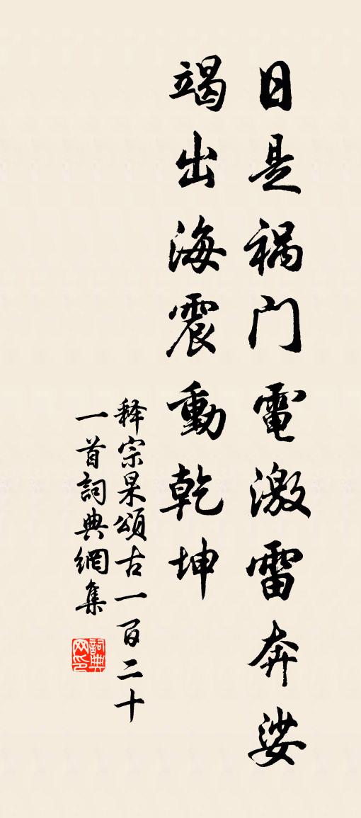 詩詞名句歷史字典書法欣賞書法字典國語詞典說文解字康熙字典古漢語字典標 題 作 者 詩 句 頌古一百二十一首作者:釋宗杲 朝代:宋代頌古一百二十一首原文日是禍門,電激雷奔。娑竭出海,震動乾坤。詩詞問答問:頌古一百二十一首的作者是誰?答:釋宗杲問:頌古一百二十一首寫於哪個朝代?答:宋代釋宗杲頌古一百二十一首書法欣賞頌古一百二十一首書法作品詩詞推薦菩薩蠻(壽昌甫生朝)韓淲〔宋代〕今年是處梅花早。分明開到章泉好。兄弟壽杯同。暗香明月風。風流文物舊。春意枝枝透。兒侄定飛軒。衣冠與世宣政殿退朝晚出左掖(掖門在兩旁如人之臂掖)杜甫〔唐代〕天門日射黃金榜,春殿晴曛赤羽旗。宮草微微承委佩,爐煙細細駐遊絲。雲近蓬萊常好色,雪殘鳷鵲亦多時。侍臣紅麻頭賈似道〔宋代〕紅麻秉性敵剛強,赤項紅班腳{外囗內昆}長。翅紫牙灣如桑剪,諸蟲交口便難當。和李才甫先輩快閣五首黃庭堅〔宋代〕長江淡淡吞天去,甲子隨波日日流。萬事轉頭同墮甑,一身隨世作虛舟。酹江月 登古容城有感,城陰則靜修劉先生故安熙〔元代〕天山巨網,盡牢籠、多少中原人物。趙際燕陲空老卻,千仞岩岩蒼壁。古柏蕭森,高松偃蹇,不管飛冰雪。慕膻群喜雨和史司直二首吳潛〔宋代〕檐溜終宵稍慰心,更須三日始為霖。雲雷尚覺經綸狹,暑雨猶疑咨怨深。不假溟鯤能激水,何須垤鸛解知陰。回頭避難周姓家席地而眠偶成陳著〔宋代〕夜宿山家謝主翁,安排席藁地爐東。枕頭就借支機石,帕額聊防箭隙風。酒瓮下眠添古話,牛衣中臥有時通。老吾寄趙信州一叔二首趙蕃〔宋代〕官梅親手種,山閣聽僧修。授簡慚吾事,登高企勝流。葭莩元有托,桑梓近臨州。愧我資身拙,從公但食謀。薛侍御處乞靴李群玉〔唐代〕越客南來夸桂麖,良工用意巧縫成。看時共說茱萸皺,著處嫌無鴝鵒鳴。百里奚身悲甚似,五羊皮價敢全輕。日於為鄭菊山賦斗室薛嵎〔宋代〕居然真樂地,跬步亦徜徉。大器何曾局,修程未易量。中天就躔象,吾道即宮牆。萬斛泉源在,非徒志秕糠。天仙子 淥水亭秋夜納蘭性德〔清代〕水浴涼蟾風入袂,魚鱗觸損金波碎。好天良夜酒盈樽,心自醉,愁難睡,西南月落城烏起。句可朋〔唐代〕來多不似客,坐久卻垂簾。虹收千嶂雨,潮展半江天。詩因試客分題僻,棋為饒人下著低。傷心盡日有啼鳥,獨步玩松竹滕岑〔宋代〕馬目在屋南,龍峰在屋北。南為山所障,北半露山色。賴有竹與松,足供予燕息。竹乃前贈栽,種自別墅得。松長故襄師陳端明輓詩劉克莊〔宋代〕公昔加黃鉞,堂堂國勢尊。邊人開此戶,索虜祭南門。軍冊甲寅報,炊煙戊己屯。吳兒勿輕議,公論在襄樊。部曲和普公賦東園十題其四待月亭梅堯臣〔宋代〕明月過三五,飛出滄海遲。佳人望清夜,隔樹光離離。不須磔蝦蟆,寒魄自有虧。景祐釋奠武成王六首佚名〔宋代〕神機經武,隆周之宇。表海分封,邁燕超魯。耽耽齋貌,俎豆有序。薦福邦家,維師尚父。石頭城遇盧明府丈薛師心〔宋代〕浮生蹤跡似浮雲,把酒論交對夕曛。十載師門稱畏友,一朝吏事誦神君。口中高論人間少,名下宏詞海內聞。此會盆池鄭獬〔宋代〕綠髮柔莎碧甃連,湛如蛟穴貯寒泉。誰將寶鏡遺在地,照見浮雲浸破天。數鬣游魚才及寸,一層綠荇小於錢。待將漁家傲李昴英〔宋代〕重著夾羅猶怯冷。隔簾拜祝團圓鏡。取片龍涎安古鼎。香閣靜。橫窗寫出梅花影。寒鵲顫枝飛不定。回紋刺就更籌奉和顏使君真卿修《韻海》畢會諸文士東堂重校皎然〔唐代〕外學宗碩儒,游焉從後進。恃以仁恕廣,不學門欄峻。著書裨理化,奉上表誠信。探討始河圖,紛綸歸海韻。親承名句推薦問相思、他日鏡中看,蕭蕭發。嚴羽《滿江紅·送廖叔仁赴闕》 斷香殘酒情懷惡。西風催襯梧桐落。李清照《憶秦娥·詠桐》 肅肅花絮晚,菲菲紅素輕。杜甫《春遠 / 春運》 情共天涯秋黯,朱橋鎖深巷。吳文英《解蹀躞·醉雲又兼醒雨》 夸而有節,飾而不誣劉勰《文心雕龍·誇飾》 人孰無親,罪人慎察其宗。來俊臣《羅織經·固榮卷第六》 今宵樓上一尊同。雲濕紗窗。辛棄疾《一剪梅·中秋元月》 夜合花開香滿庭,夜深微雨醉初醒。竇叔向《夏夜宿表兄話舊》 浪花有意千里雪,桃花無言一隊春。李煜《漁父·浪花有意千里雪》 雁起青天,數行書似舊藏處。吳文英《齊天樂·與馮深居登禹陵》