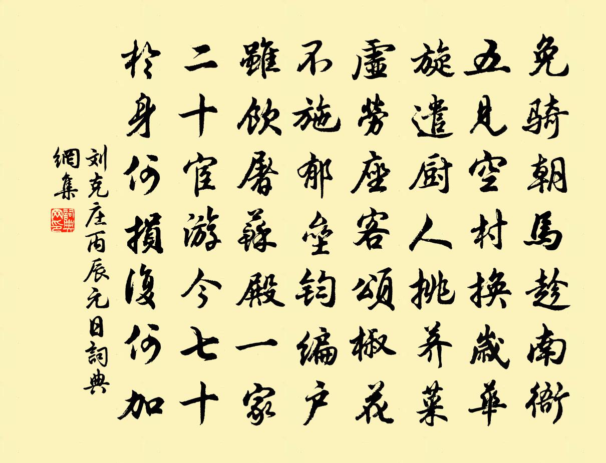 詩詞名句歷史字典書法欣賞書法字典國語詞典說文解字康熙字典古漢語字典標 題 作 者 詩 句 丙辰元日作者:劉克莊 朝代:宋代丙辰元日原文免騎朝馬趁南衙,五見空村換歲華。旋遣廚人挑薺菜,虛勞座客頌椒花。不施鬱壘鈞編戶,雖飲屠蘇殿一家。二十宦遊今七十,於身何損復何加。詩詞問答問:丙辰元日的作者是誰?答:劉克莊問:丙辰元日寫於哪個朝代?答:宋代問:劉克莊的名句有哪些?答:劉克莊名句大全劉克莊丙辰元日書法欣賞丙辰元日書法作品詩詞推薦送王總卿李流謙〔宋代〕北風號霜脫群木,送客東門車萬軸。城中人家作兒啼,若為四角生華轂。公今未上九天上,身雖去此猶在蜀。邊頭如夢令向子諲〔宋代〕水之法,乃神仙術也。其香著人不滅,名曰薌林秋露。李長吉詩亦云:“山頭老桂吹古香。”戲作二闋,以貽好事甲戌正月十四日書所見來日驚蟄節張元乾〔宋代〕老去何堪節物催,放燈中夜忽奔雷。一聲大震龍蛇起,蚯蚓蝦蟆也出來。和伯氏胡宏〔宋代〕風高吹散日邊雲,綠水初回沙際春。逝者如斯長不住,汨羅愁絕笑靈均。三月三日勤政樓侍宴應制王維〔唐代〕彩仗連宵合,瓊樓拂曙通。年光三月里,宮殿百花中。不數秦王日,誰將洛水同。酒筵嫌落絮,舞袖怯春風。天保偈釋曇華〔宋代〕五百力士揭石義,萬仞崖頭撒手行。十方世界一團鐵,虛空背上白毛生。詠史八首朝鮮婦蒲壽宬〔宋代〕白首攜一壺,亂流去何之。婦呼吻欲裂,彼乃昏不知。箜篌彈復彈,河水風瀰瀰。扶南曲歌詞五首王維〔唐代〕〔通典云:武德初,因隋舊制,奏九部樂,四曰扶南。唐書禮樂志云:天寶樂曲,皆以邊地名。自河西至者,有扶清商怨·庭花香信尚淺晏幾道〔宋代〕庭花香信尚淺。最玉樓先暖。夢覺春衾,江南依舊遠。回紋錦字暗翦。漫寄與、也應歸晚。要問相思,天涯猶自短惜別詩宋白〔宋代〕年來又惜別清塵,故國榮過喜風新。竹葉莫辭千日酒,梅花惟寄一枝春。苦心曾未拋黃卷,得路終期近紫宸。不待大慈環峰和尚贊釋紹曇〔宋代〕肚腸深,用白粘賊翳睛藥,定滄海舶指南針。出智門蓮化,換人鼻孔。握大慈苕箒,掃世煙塵。忘忌諱,絕疏親。薛中丞白居易〔唐代〕百人無一直,百直無一遇。借問遇者誰,正人行得路。中丞薛存誠,守直心甚固。皇明燭如日,再使秉王度。奸豪雨後有便價寄所盤丘葵〔宋代〕雨中正相憶,偶爾有來鴻。情況今何苦,新吟想漸工。近聞惠連病,似與長卿同。何日蒼榕下,開筵水面紅。歸嵩山作王維〔唐代〕清川帶長薄,車馬去閒閒。流水如有意,暮禽相與還。荒城臨古渡,落日滿秋山。迢遞嵩高下,歸來且閉關。士穎弟作真率會次韻樓鑰〔宋代〕何羨祖希情好隆,朱陳累世意交通。舅甥巾屨頻相接,兄弟樽罍喜更同。參坐幸容攻愧子,主盟全賴適齋翁。日來江氏家藏仁宗皇帝墨跡贊黃庭堅〔宋代〕昭陵仁聖,與天同功。不刻不雕,萬國文明。日月照臨,無有隱側。一滴之雨,澤及萬物。簡言易從,易言易知。謝叔子陽丈惠詩張明中〔宋代〕老子詩盟久廢閒,喜君步驟少陵壇。句敲金玉聲名遠,韻險車斜心膽寒。傾出囊中和月露,皎如盤底走珠丸。苦莍絕句六十四首張伯端〔宋代〕赫赤金丹一日成,古仙垂語實堪聽。若言九載三年者,儘是推延款日程。鎖宿省中,心氣大作,通昔不寐。得兩絕句楊萬里〔宋代〕絕恨詩人浪許痴,四更無睡只喔詩。老鈴枕手眠窗底,急雨顛風總不知。菩薩蠻(丁卯八月九日鵬飛集作)郭應祥〔宋代〕秋堂積雨新涼入。今宵雅趁鵬飛集。勁翮會高風。功名亥睡中。筆頭元有準。快寫平生蘊。何日捷書來。重陽把名句推薦驛路侵斜月,溪橋度曉霜。呂本中《南歌子·驛路侵斜月》 知章騎馬似乘船,眼花落井水底眠杜甫《飲中八仙歌》 驛寄梅花,魚傳尺素。秦觀《踏莎行·郴州旅舍》 凍雲宵遍嶺,素雪曉凝華。李世民《望雪》 親朋無一字,老病有孤舟。杜甫《登岳陽樓》 秋聲帶葉蕭蕭落,莫響城頭角!董士錫《虞美人·韶華爭肯偎人住》 笙歌散盡遊人去,始覺春空。歐陽修《採桑子·群芳過後西湖好》 疏籬曲徑田家小。雲樹開清曉。周邦彥《虞美人·疏籬曲徑田家小》 桂林風景異,秋似洛陽春。宋之問《始安秋日》 翠輦不來金殿閉,宮鶯銜出上陽花雍陶《天津橋望春》