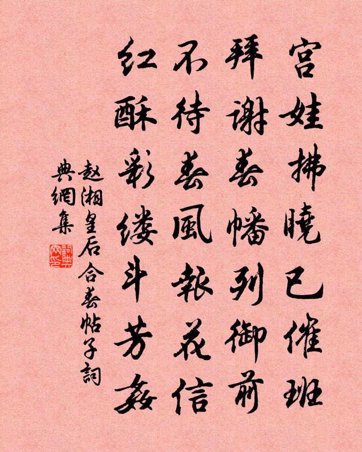 詩詞名句歷史字典書法欣賞書法字典國語詞典說文解字康熙字典古漢語字典標 題 作 者 詩 句 皇后合春帖子作者:趙湘 朝代:唐代皇后合春帖子原文宮娃拂曉已催班,拜謝春幡列御前。不待春風報花信,紅酥彩縷斗芳奸。詩詞問答問:皇后合春帖子的作者是誰?答:趙湘問:皇后合春帖子寫於哪個朝代?答:唐代趙湘皇后合春帖子書法欣賞皇后合春帖子書法作品詩詞推薦紅梅 其六王冕〔元代〕白日遲遲照窗戶,深院不知春幾許?紫簫聲轉香風回,隔簾踏動燕脂雨。安溪勸農詩勸種植陳宓〔宋代〕是處荒山欲接天,土膏如面草如氈。及時便種松杉子,遠計收功只十年。送司馬□拾五城聯句詩何遜〔南北朝〕隨風飄岸葉。行雨暗江流。居人會應返。空欲送行舟。偶題·相逢記得畫張耒〔宋代〕相逢記得畫橋頭,花似精神柳似柔。莫謂無情即無語,春風傳意水傳愁。新定途中杜牧〔唐代〕無端偶效張文紀,下杜鄉園別五秋。重過江南更千里,萬山深處一孤舟。再飲枕流和王景文韻曾協〔宋代〕乞得微官本為閒,生贈簿領積如山。鼎來佳客無陶謝,向後微言到孔顏。安得朱弦起秋思,預愁清淚落陽關。壯懷題梅花詩卷後黃庚〔宋代〕月香水影句清奇,除卻逋仙更有誰。吟骨春風吹不落,此翁已後絕無詩。悼許氏柔則劉黻〔宋代〕青青北山柏,蒼蒼南山松。屬彼冰雪姿,無言意趣同。造物何冥冥,摧以頭夜風。傷心復傷心,忍聽風中鍾。次韻和禮部盧侍郎(一作郎中,一本又多一極字)鄭谷〔唐代〕盧郎到處覺風生,蜀郡留連亞相情。亂後江山悲庾信,夜來煙月屬袁宏。夢歸蘭省寒星動,吟向莎洲宿鷺驚。未脫一葉落·一葉落李存勖〔五代〕一葉落,搴珠箔。此時景物正蕭索。畫樓月影寒,西風吹羅幕。吹羅幕,往事思量著。送黎德升出守眉州洪咨夔〔宋代〕霜隼健毛骨,冥鴻高羽翰。來遲懷去速,退易挽留難。文物聲明郡,中和孝友官。大馮棠蔭在,多放一分寬。同夫游秦王韞秀〔唐代〕路掃饑寒跡,天哀志氣人。休零離別淚,攜手入西秦。贈天台葉尊師方乾〔唐代〕莫見平明離少室,須知薄暮入天台。常時愛縮山川去,有夜自攜星月來。靈藥不知何代得,古松應是長年栽。先生良月二十一日郡庠置酒爐亭勞余出山且取子美陳著〔宋代〕蘭菊不競芳,鴻燕各有時。可以人不如,大哉義曰隨。題謝太尉養素堂曹勛〔宋代〕樂山雅望意雍容,養素璇題振道風。剩貯琴書供嘯詠,更新窗戶不青紅。數峰吳越登臨外,千里江山指顧中。玉碾壽春節進貫休〔唐代〕聖運關天紀,龍飛古帝基。振搖三蜀地,聳發萬年枝。出震同中古,承乾動四夷。恩頒新命廣,淚向舊朝垂。大寶高宗郊祀前廟朝享太廟三十首真宗〔宋代〕思文真宗,骨道之宗。憺威赫靈,遵制揚功。真符鼎來,告成登封。盛德百世,於昭無窮。入都席上答曼叔見送韓維〔宋代〕少乏四方誌,所懷在林丘。塵埃豈我事,義往不得留。進酒長亭上,離馬儼行輈。臨分子無慘,且復相從游。宿長蘆寺方丈范成大〔宋代〕塔廟新浮水,汀洲舊布金。聊恁一葦力,與障萬波侵。帆影窺門近,鐘聲出院深。夜闌雷破夢,欹枕聽潮音。句和凝〔唐代〕先生自舞琴。(《三樂達節》)波上人如潘玉兒,掌中花似趙飛燕。(《採蓮曲》,以上並見《樂書》)名句推薦荻花秋,瀟湘夜,橘洲佳景如屏畫。李珣《漁歌子·荻花秋》 風乍暖,日初長,裊垂楊。陳子龍《訴衷情·春遊》 密雲雙鳳,初破縷金團。米芾《滿庭芳·詠茶》 稻花香里說豐年。聽取蛙聲一片。辛棄疾《西江月·夜行黃沙道中》 料因循誤了,殘氈擁雪,故人心眼。張炎《解連環·孤雁》 東風惡,歡情薄。陸游《釵頭鳳·紅酥手》 何處秋風至?蕭蕭送雁群。劉禹錫《秋風引》 坡謂西湖,正如西子,濃抹淡妝臨鏡台。劉過《六州歌頭·寄稼軒承旨》 啼鶯舞燕,小橋流水飛紅。白樸《天淨沙·春》 客子光陰詩卷里,杏花訊息雨聲中。陳與義《懷天經智老因訪之》