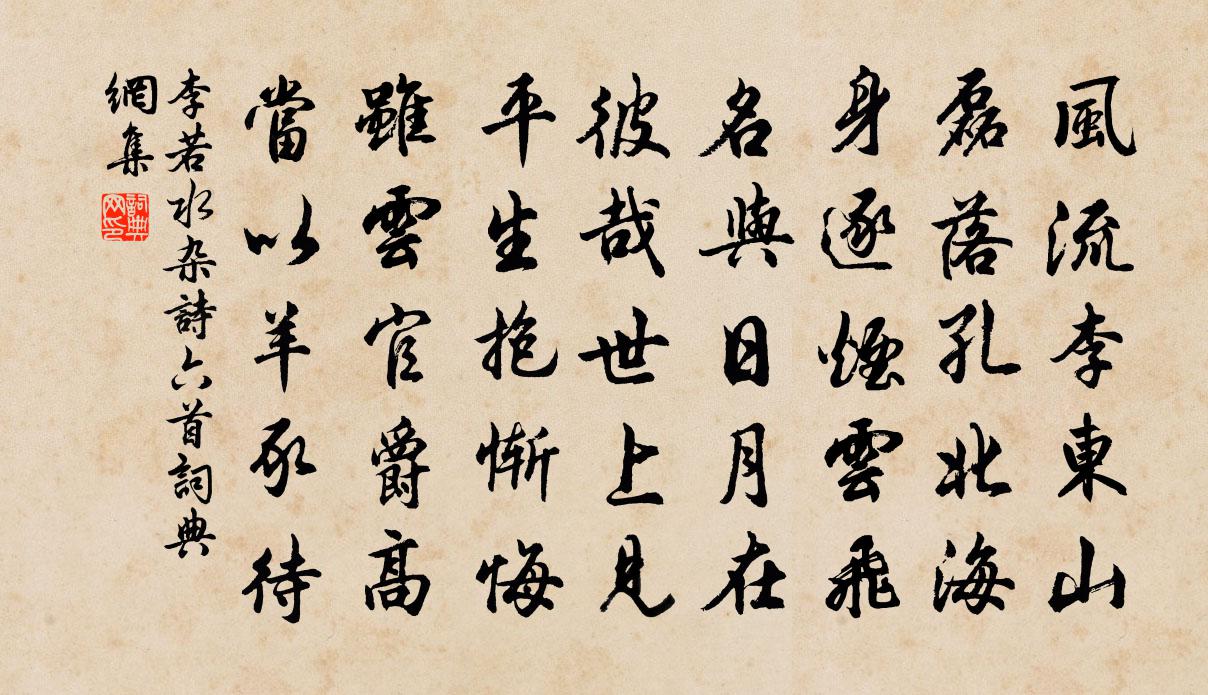 詩詞名句歷史字典書法欣賞書法字典國語詞典說文解字康熙字典古漢語字典標 題 作 者 詩 句 雜詩六首作者:李若水 朝代:宋代雜詩六首原文風流李東山,磊落孔北海。身逐煙雲飛,名與日月在。彼哉世上見,平生抱慚悔。雖雲官爵高,當以羊豕待。詩詞問答問:雜詩六首的作者是誰?答:李若水問:雜詩六首寫於哪個朝代?答:宋代李若水雜詩六首書法欣賞雜詩六首書法作品詩詞推薦浣溪沙(為楊姝作)李之儀〔宋代〕玉室金堂不動塵。林梢綠遍已無春。清和佳思一番新。道骨仙風雲外侶,煙鬟霧鬢月邊人。何妨沈醉到黃昏。吳歈一首送丘宗卿自平江移會稽贈壽老范成大〔宋代〕農圃規模昔共論,雲奎卜築又逢君。眉庵壽老長隨喜,好個拋梁伏願文。對應致語口號李曾伯〔宋代〕相對封人共祝堯,玉觴瀲灩酒浮椒。千山佳氣供紅旆,一道仁聲賴翠軺。南極爺祈天上壽,東風不隔海濱遙。恩濃清醒薛嵎〔宋代〕獨懷忠憤赴湘中,舉國昏昏志不同。漁父笑君君亦笑,煙波相望各西東。鄂渚除夜書懷來鵠〔唐代〕鸚鵡洲頭夜泊船,此時形影共悽然。難歸故國干戈後,欲告何人雨雪天。箸撥冷灰書悶字,枕陪寒席帶愁眠。自嗟游茅山二首李中〔唐代〕綠蘚深迎步,紅霞爛滿衣。洞天應不遠,鸞鶴向人飛。茅許仙蹤在,煙霞一境清。夷希何許叩,松徑月空明。冬日陸游〔宋代〕短景匆匆過,新寒亹亹來。客游聊戲耳,世事亦悠哉!綠動連村麥,香吹到處梅。錦城花柳窟,歸去看春回。辛未中元記夢夢與一僧談世事良久問答中有凡五邁〔宋代〕盤中有止水,歷歷見鬚眉。能定乃能慶,人心固如斯。至誠本如神,聖賢不吾欺。鳴鶴方在陰,共子輒和之。天未西江月(賦丹桂)辛棄疾〔宋代〕宮粉厭塗嬌額,濃妝要壓秋花。西真人醉憶仙家。飛珮丹霞羽化。十里芬芳未足,一亭風露先加。杏腮桃臉費鉛華漁家陸游〔宋代〕江上漁家水蘸扉,閒雲片片傍苔磯。釣收鷺下虛舟立,橋斷僧尋別徑歸。海近岡巒多迤邐,天寒霧雨正霏微。羊裘痛哭行王冕〔元代〕雨淋日炙四海窮,經綸可是真英雄。岐豐禾黍泣寒露,鹹陽草木來悲風。京邦大官飫酒肉,村落饑民無粒粟。東魯【雙調】沉醉東風_秋夜旅思二張可久〔元代〕秋夜旅思二十五點秋更鼓聲,千三百里水館郵程。青山去路長,紅樹西風冷。百年人半紙虛名,得似璩源閣上僧,解佩令王哲〔元代〕金郎察察。玉娘揠揠。堪同壽、方年二八。住在何方,一居水,一居山北。入離門、坎戶皆*。時時相拉。頻頻搜送鞠評事宰蘭溪王禹偁〔宋代〕東下蘭溪數十程,幾多山水入圖經。科名舊捷仙人桂,縣界遙看婺女星。琴院靜籠江樹綠,敕樓高對海峰青。三年賀新郎(兵後寓吳)蔣捷〔宋代〕深閣簾垂繡。記家人、軟語燈邊,笑渦紅透。萬疊城頭哀怨角,吹落霜花滿袖。影廝伴、東奔西走。望斷鄉關知何狼丁謂〔宋代〕出必彰明盛,來當表慶隆。野心知楚子,疐尾見周公。仲德牽衣惠,烏孫飼乳功。金行鍾粹白,冬獻莫雷同。同安權縣林丞和餘二首趁韻答之劉克莊〔宋代〕頗聞四境有弦聲,雉傍人飛犬不驚。在處棠陰應勿伐,等閒花判亦流行。掞庭子盍摛新藻,絕廩□□□落英。台府宴山亭/燕山亭王之道〔宋代〕微雨斑斑,暈濕海棠,漸覺燕脂紅褪。遲日短垣,嬌怯和風,搖曳一成春困。玉軟酴酥,扶不起、晚妝慵整。愁恨游熙六年端午帖子詞皇帝合六首崔敦詩〔宋代〕避暑深宮消永晝,函風廣殿起涼秋。宸心未愜高明適,志在山東二百州。偈頌二十一首釋堅璧〔宋代〕玉象吞獅子,泥牛上繡鞍。御樓觀射獵,不是刈茆田。名句推薦離多最是,東西流水,終解兩相逢。晏幾道《少年游·離多最是》 天子居未央,妾侍卷衣裳。李白《秦女卷衣》 客自長安來,還歸長安去。李白《金鄉送韋八之西京》 天地不仁,以萬物為芻狗;聖人不仁,以百姓為芻狗。老子《老子·道經·第五章》 林深藏卻雲門寺,回首若耶溪。張可久《人月圓·會稽懷古》 漁父天寒網罟凍,莫徭射雁鳴桑弓。杜甫《歲晏行》 欲寄彩箋兼尺素,山長水闊知何處?晏殊《蝶戀花·檻菊愁煙蘭泣露》 酷暑天,葵榴發,噴鼻香十里荷花。白樸《得勝樂·夏》 瑕不掩瑜、瑜不掩瑕戴聖《禮記·聘義》 主貴多變,國貴少變。國多物,削;主少物,強。商鞅《商君書·去強》