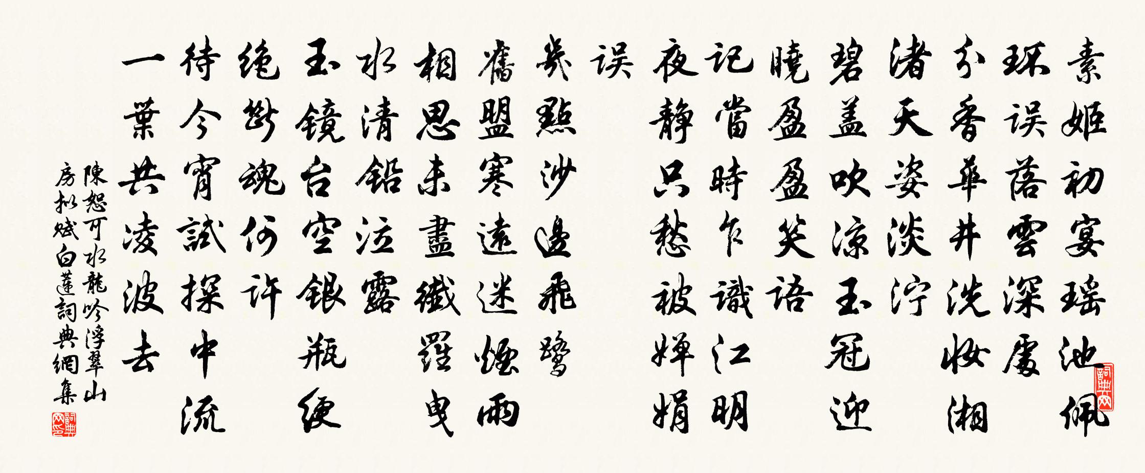 詩詞名句歷史字典書法欣賞書法字典國語詞典說文解字康熙字典古漢語字典標 題 作 者 詩 句 水龍吟(浮翠山房擬賦白蓮)作者:陳恕可 朝代:宋代原文素姬初宴瑤池,佩環誤落雲深處。分香華井,洗妝湘渚,天姿淡濘。碧蓋吹涼,玉冠迎曉,盈盈笑語。記當時乍識,江明夜靜,只愁被、嬋娟誤。幾點沙邊飛鷺。舊盟寒、遠迷1*1煙雨。相思未盡,纖羅曳水,清鉛泣露。玉鏡台空,銀瓶綆絕,斷魂何許。待今宵試探,中流一葉,共凌波去。詩詞問答問:《水龍吟(浮翠山房擬賦白蓮)》的作者是誰?答:陳恕可問:該詩寫於哪個朝代?答:宋代問:該詩是什麼體裁?答:詞書法欣賞水龍吟(浮翠山房擬賦白蓮)書法作品詩詞推薦苦雨張耒〔宋代〕春淺天尚寒,雨多聲入夜。幽人不出門,坐惜梅花謝。庭竹未抽萌,酴醾將覆架。芳時喜病癒,淺酌供情話。趨世雁湖先生揆初在旦某以家藏唐畫熾盛光如來像程公許〔宋代〕十方世界香水海,如微塵數無邊億,諸佛各以本誓願,遍坐道場作饒益。稽首兩足熾盛光,具有廣大神通力。剛風頌證道歌證道歌釋印肅〔宋代〕有無俱遣不空空,空本無空針不容。阿彌陀佛真金色,相好無邊我等同。望春山王應麟〔宋代〕群峰西南起還伏,湖上丹丘立於獨。神仙寓跡山水間,不在幽深在清淑。松潭水暖龍欲起,蕙帳人空鶴自宿。飛雲曉別白居易〔唐代〕曉鼓聲已半,離筵坐難久。請君斷腸歌,送我和淚酒。月落欲明前,馬嘶初別後。浩浩暗塵中,何由見回首?題金山寺石堂李群玉〔唐代〕白波四面照樓台,日夜潮聲繞寺回。千葉紅蓮高會處,幾曾龍女獻珠來。過翻陽湖趙崇嶓〔宋代〕煙波三萬頃,著我木蘭船。望際疑無地,寰中別有天。長空孤鳥沒,四海一雲連。浩蕩平生意,南風正渺然。至日趙蕃〔宋代〕今年至日還為客,墮我侵尋老境中。照影不堪詩鬢禿,向人無復酒顏紅。石田茅屋鄉關異,官柳野梅時序同。試問謝福建提舉應仲實送新茶楊萬里〔宋代〕詞林應瑒繡衣新,天上茶仙月外身。解贈萬釘蒼玉胯,分嘗一點建溪春。三杯大道醺然後,七碗清風爽入神。聞道送費驤姚合〔唐代〕兄寒弟亦飢,力學少閒時。何路免為客,無門賣得詩。幾人攜酒送,獨我入山遲。少小同居止,今朝始別離。三段石曾極〔宋代〕凜然皇象法書存,重屋應無野火焚。割據英雄餘一念,斷碑千載尚三分。題西岩院吳宣德〔宋代〕幽村分野徑,勝地絕浮埃。殿閉煙霞靜,門臨水石開。日斜山影背,泉落雨聲來。故里經年別,只園首重回。句陳俊卿〔宋代〕吾方蹈孔孟,未暇師粲可。背面美人圖高啟〔明代〕欲呼回首不知名,背立東風幾許情。莫道畫師元不見,傾城雖見畫難成。出郊用劭農韻三首吳潛〔宋代〕怕見書空雁字連,可堪清淚落尊前。謾因上浣休閒日,出見初秋瑩淨天。人正慕羶爭似蟻,誰能換骨蛻如蟬。細思蓬戶陸游〔宋代〕蓬戶真堪設爵羅,歲時野老自相過。人情靜處看方見,詩句窮來得最多。枕上長歌時激烈,樽前一笑且婆娑。白頭歲夜安樂公主滿月侍宴應制杜審言〔唐代〕戚里生昌胤,天杯宴重臣。畫樓初滿月,香殿早迎春。睿作堯君寶,孫謀梁國珍。明朝元會日,萬壽樂章陳。挽京口使君豐郎中十首劉宰〔宋代〕殘胡失馭走群雄,人物爭歸掌握中。河洛祗今修舊貢,凌煙端合首群公。禪人並化主寫真求贊釋正覺〔宋代〕二儀之門,萬象之根。有無難議,青白不痕。借功承祖禰,了事付兒孫。採華香負蜜蜂股,齊物夢翻蝴蝶槐。即相白露章甫〔宋代〕烈日照平野,狂風吹槁苗。皇天無一雨,白露只明朝。世路多艱險,人心恐動搖。愁來唯有酒,聊以永今宵。名句推薦天朗氣清,惠風和暢王羲之《蘭亭集序 / 蘭亭序》 玉顏憔悴三年,誰復商量管弦。王建《宮中調笑·團扇》 江上春山遠,山下暮雲長。葛長庚《水調歌頭·江上春山遠》 見兔而顧犬,未為晚也;亡羊而補牢,未為遲也。劉向《戰國策·楚四·莊辛謂楚襄王》 餘霞散成綺,澄江靜如練。謝朓《晚登三山還望京邑》 講性命之學者,不可無經濟之才。王永彬《圍爐夜話·第二六則》 俄而未霰零,密雪下。謝惠連《雪賦》 錦江春色來天地,玉壘浮雲變古今。杜甫《登樓》 朝屯雪山下,暮宿青海旁。韋元甫《木蘭歌》 三千丈清愁鬢髮,五十年春夢繁華。喬吉《折桂令·客窗清明》