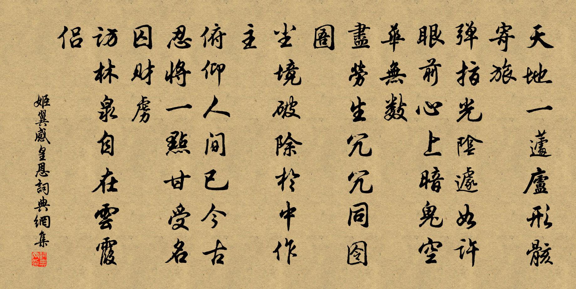 詩詞名句歷史字典書法欣賞書法字典國語詞典說文解字康熙字典古漢語字典標 題 作 者 詩 句 感皇恩作者:姬翼 朝代:元代感皇恩原文天地一蘧廬,形骸寄旅。彈指光陰遽如許。眼前心上,暗鬼空華無數。盡勞生冗冗、同囹圄。塵境破除,於中作主。俯仰人間已今古。忍將一點,甘受名囚財虜。訪林泉自在、雲霞侶。詩詞問答問:感皇恩的作者是誰?答:姬翼問:感皇恩寫於哪個朝代?答:元代問:感皇恩是什麼體裁?答:詞姬翼感皇恩書法欣賞感皇恩書法作品詩詞推薦王總卿生日二首魏了翁〔宋代〕上到青天更上頭,蜀人猶記舊得軺。安弦在昔猶危柱,掛壁於今倚大弨。棠樹留春便野茇,桂花和月引仙瓢。風雲蝶戀花張掄〔宋代〕絕想凝真天地表。九□□□,□□□□□。行處旌幢參羽葆。五雲隨□□□□。□□神仙春不老。煙□□□,□□鷓鴣天(重九日集句)黃庭堅〔宋代〕寒雁初來秋影寒。霜林風過葉聲乾。龍山落帽千年事,我對西風猶整冠。蘭委佩,菊堪餐。人情時事半悲歡。但將觀雪二首楊萬里〔宋代〕坐看深來尺許強,偏於薄暮發寒光。半空舞倦居然嬾,一點風來特地忙。落盡瓊花天不惜,封它梅蕊玉無香。倩誰桃源行(鳳棲梧三首)賀鑄〔宋代〕流水長煙何縹緲。詰□□□,□逗漁舟小。夾岸桃花爛□□。□□□□□□□。蕭閒村落田疇好。避地移家,□□和王東卿絕句四首陳與義〔宋代〕少年走馬洛陽城,今作江邊瓶錫僧。說與虎頭須畫我,三更月里影崚嶒。裴五白居易〔唐代〕莫怪相逢無笑語,感今思舊戟門前。張家伯仲偏相似,每見清揚一惘然。禁署早春晴望劉得仁〔唐代〕御林聞有早鶯聲,玉檻春香九陌晴。寒著霽雲歸紫閣,暖浮佳氣動芳城。宮池日到冰初解,輦路風吹草欲生。鴛侶到官三歲四首宋祁〔宋代〕儒帥非真帥,瓜時定幾時。丹心雖許壯,白髮不藏衰。罟密游鱗駭,山遙倦翼遲。歲成無奏最,準擬雁門踦。早春送宇文十歸吳竇鞏〔唐代〕春遲不省似今年,二月無花雪滿天。村店閉門何處宿,夜深遙喚渡江船。《日下舊聞考》題辭乾隆〔清代〕曾賦皇都與帝都,若茲形勝古今無。金遷元復其久矣,明築清修滋盛乎。御園法宮誠富此,返淳還朴益殷吾。論成墨梅高吉〔宋代〕識破宮妝色是空,香魂分付與東風。黑雲潑眼催詩急,著我江頭春暗中。送從叔士準赴任潤州司士盧綸〔唐代〕雲起山城暮,沈沈江上天。風吹建業雨,浪入廣陵船。久是吳門客,嘗聞謝守賢。終悲去國遠,淚盡竹林前。新秋池上曉望汪宗臣〔宋代〕淨值香來水北,殘蟬聲度橋東。清沚金鱗漾綠,夕陽白鷺翻紅。馬上晚吟白居易〔唐代〕人少街荒已寂寥,風多塵起重蕭條。上陽落葉飄宮樹,中渡流澌擁渭橋。出早冒寒衣校薄,歸遲侵黑酒全消。如今贈都雍元規田況〔宋代〕醒時莫憶醉時事,今日休言昨日非。池上風光宜共酹,勸君不要半酣歸。佳人歌宋伯仁〔宋代〕淡傳粉,淺畫眉,鬢邊休插桃花枝。白面郎君馬如箭,回頭再盼情依依。文君未識相如面,朱弦聲裹猶相戀,風流南海文天祥〔宋代〕朅來南海上,人死亂如麻。腥浪拍心碎,飆風吹鬢華。一山還一水,無國又無家。男子千年志,吾生未有涯。留別成父弟以貧賤親戚離為韻五首趙蕃〔宋代〕木落山有骨,水落河有津。扁舟所常經,大半跡已陳。身非鴻鵠舉,心乃鷗鷺親。勝處自屬我,塵事勿敗人。意難忘 妓楊韻卿以善歌求賦張翥〔元代〕高韻天成。問當時愛愛,得似卿卿。江梅風致別,楚蕙雪香清。花旎旎,月盈盈。寫不盡才情。把舊遊,名謳試數名句推薦傷心庾開府,老作北朝臣。司空曙《金陵懷古》 青春須早為,豈能長少年。孟郊《勸學》 夫大寒至,霜雪降,然後知松柏之茂也。劉安及其門客《淮南子·俶真訓》 不似春風逞紅艷,鏡前空墜玉人釵。司空圖《華下對菊》 鳥聲有悲歡,我愛口流血。孟郊《苦寒吟》 正單衣試酒,恨客里、光陰虛擲。周邦彥《六醜·落花》 明日復明日,明日何其多。錢福《明日歌》 力拔山兮氣蓋世。時不利兮騅不逝。項羽《垓下歌》 帶雨牡丹無氣力,黃鸝愁雨濕。汪莘《謁金門·簾漏滴》 不道愁人不喜聽。空階滴到明。万俟詠《長相思·雨》