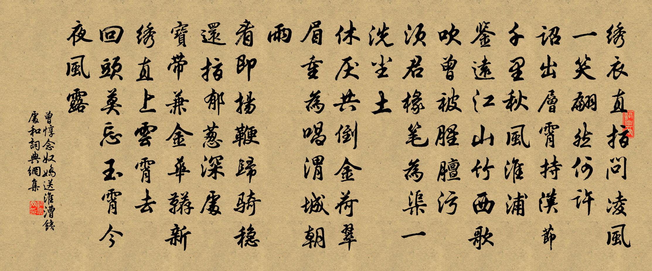 張寧〔明代〕一曲清商,人別後、故園幾度。想翠竹、碧梧風采,舊遊何處。三徑西風秋共老,滿庭疏雨春都過。看蒼苔、白石