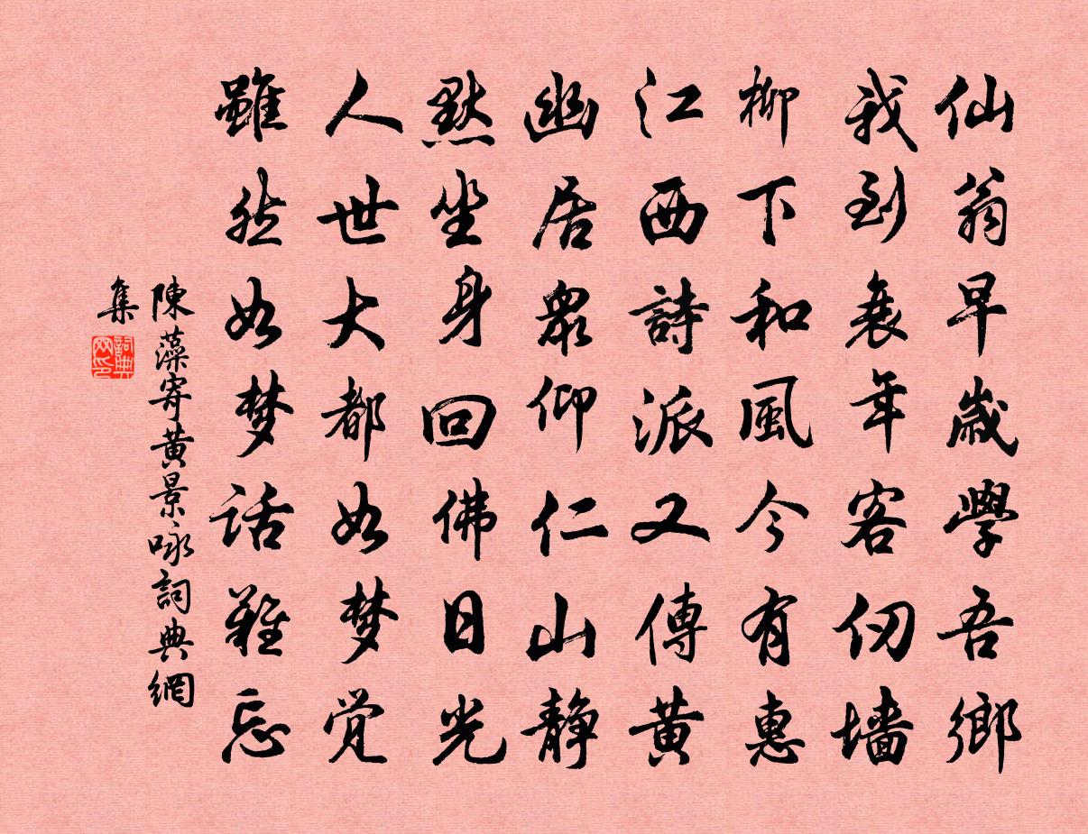 詩詞名句歷史字典書法欣賞書法字典國語詞典說文解字康熙字典古漢語字典標 題 作 者 詩 句 寄黃景詠作者:陳藻 朝代:宋代寄黃景詠原文仙翁早歲學吾鄉,我到衰年客仞牆。柳下和風今有惠,江西詩派又傳黃。幽居眾仰仁山靜,默坐身回佛日光。人世大都如夢覺,雖然如夢話難忘。詩詞問答問:寄黃景詠的作者是誰?答:陳藻問:寄黃景詠寫於哪個朝代?答:宋代陳藻寄黃景詠書法欣賞寄黃景詠書法作品詩詞推薦七夕鄭文振席上姬有楚雲者為作三弄方岳〔宋代〕帝子經年別,秋風遠客情。斷雲含宿雨,古木落寒聲。河漢低逾潤,江潮夜未平。巫雲莫吹笛,吾意正淒清。尋芳草·蕭寺記夢納蘭性德〔清代〕客夜怎生過。夢相伴、綺窗吟和。薄嗔佯笑道,若不是恁淒涼,肯來么。來去苦匆匆,準擬待、曉鐘敲破。乍偎人代作五首項安世〔宋代〕蒼龍元住五雲東,此日黃昏卻正中。琴瑟銅壺添水箭,翩翻珠戶記桑蓬。上弦月色如銀白, * 光似燭紅。歲歲宿坡書事黃彥平〔宋代〕擬裁垂柳待棲烏,招買風光計已疏。只有碧蘆馴白鳥,擊愁縈恨不關渠。中秋龍輔〔宋代〕寂寂中秋夜,含情出玉閨。河長看雁遠,月皎覺雲低。歲杪用韻二首洪咨夔〔宋代〕日月磨心緒,風霜染鬢華。歷看新歲草,梅憶舊年花。濁酒供僛舞,清歌應摻撾。阿鹹多事在,猶問老生涯。輞川集二十首宮槐陌裴迪〔唐代〕門前宮槐陌,是向欹湖道。秋來山雨多,落葉無人掃。和劉後村梅花百詠方蒙仲〔宋代〕千頃瓊田徒手得,連雲彩閣一朝成。平生富貴梅時健,肯作窮人凍餓聲。元夕葉茵〔宋代〕一簇蓮燈亦可觀,隔牆簫鼓二更殘。平生未識繁華事,旋借宣和國史看。雨杜甫〔唐代〕始賀天休雨,還嗟地出雷。驟看浮峽過,密作渡江來。牛馬行無色,蛟龍斗不開。干戈盛陰氣,未必自陽台。鷓鴣天(靖州江通判塤生日)魏了翁〔宋代〕日上午頭度歲辰。黃鐘吹龠煦乾坤。弦歌堂上三稱壽,風月亭前又見君。人似舊,景長新。明朝六桂侍雙椿。蠻邦陸渾山火和皇甫湜用其韻(湜時為陸渾尉)韓愈〔唐代〕皇甫補官古賁渾,時當玄冬澤乾源。山狂谷很相吐吞,風怒不休何軒軒。擺磨出火以自燔,有聲夜中驚莫原。天跳次韻朱少章蘆橋柳橋二首晃沖之〔宋代〕洞庭生白波,隴首起黃雲。漁舟霧裡見,羌備月中聞。淳化中朝會二十三首佚名〔宋代〕沔彼涇瀆,澄明鍾如。清應實運,光涵帝居。洞分沈壁,入見游魚。聖祚無極,神休偉興。詩九首托南劍劉教尋亦周墓焚之趙文〔宋代〕舜卿墓表屹東禪,卻恐如今不得全。崇勝山中一堆土,故應汝骨尚依然。擬玉台體七首其五夜夜曲梅堯臣〔宋代〕情來不自理,明月生南樓。坐感昔時樂,翻成此夜愁。霪雨溪漲抵郭可畏戴表元〔宋代〕黑雨連三日,黃流迸一川。盡漫騎馬路,祗有釣魚船。城郭功如此,江湖興豈然。兒曹卻輕捷,來往似飛蔦。齋中雜興十首以丈夫貴壯健慘戚非朱顏為韻陸游〔宋代〕士生學六經,是為聖人徒。處當師顏原,出當致唐虞。斯文陣堂堂,臨敵獨援枹。異端滿天下,一掃可使無。乃知溫泉范成大〔宋代〕砂床毓靈源,石液漱和氣。郁攸甑常蒸,觱沸鼎百沸。人生本無垢,安用滌腸胃。一瓢灩清肥,回首謝羅罻。山深花光十梅絕後再蘇釋師範〔宋代〕孤根脫落偃蒼苔,冷地無端笑眼開。莫怪雪霜欺不得,只因曾向死中來。名句推薦與君別。相思一夜梅花發。房舜卿《憶秦娥·與君別》 窮則變,變則通,通則久。佚名《易傳·繫辭傳下·第二章》 往事思量一晌空,飛絮無情,依舊煙籠。夏完淳《一剪梅·詠柳》 驪山四顧,阿房一炬,當時奢侈今何處?張養浩《山坡羊·驪山懷古》 禍與福相貫,生與亡為鄰劉向《戰國策·楚四·或謂楚王》 聖王者不貴義而貴法,法必明,令必行,則已矣。商鞅《商君書·畫策》 庭前時有東風入,楊柳千條盡向西。劉方平《代春怨》 予若洞庭葉,隨波送逐臣。李白《送郄昂謫巴中》 芳草已雲暮,故人殊未來。韋莊《章台夜思》 湘女歸魂,佩環玉冷無聲,凝情誰訴。吳文英《過秦樓·黃鐘商芙蓉》