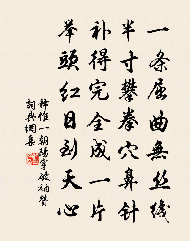 詩詞名句歷史字典書法欣賞書法字典國語詞典說文解字康熙字典古漢語字典標 題 作 者 詩 句 朝陽穿破衲贊作者:釋惟一 朝代:宋代朝陽穿破衲贊原文一條屈曲無絲線,半寸攀拳穴鼻針。補得完全成一片,舉頭紅日到天心。詩詞問答問:朝陽穿破衲贊的作者是誰?答:釋惟一問:朝陽穿破衲贊寫於哪個朝代?答:宋代釋惟一朝陽穿破衲贊書法欣賞朝陽穿破衲贊書法作品詩詞推薦朝中措 蘭詞 百畝余香沈禧〔元代〕芳皋百畝長蓀蘭。竹石共檀欒。風泛國香冉冉,霞滋幽艷**。芽抽紫玉,花垂月穗,葉綴香纓。堪羨也宜劍佩,又賡吳哲韻朱元璋〔明代〕時近清和氣愈濃,雨催花實喜晴風。籬邊點點如錢大,儘是青青間綠紅。陳漕生辰代楊文作仲並〔宋代〕六管陽初復,前宵月尚圓。長庚俄夢李,崧岳故興宣。國使新恩數,忠臣夙眷偏。節龍開遠目,衣繡聳華年。日月夏日閒居張籍〔唐代〕無事門多閉,偏知夏日長。早蟬聲寂寞,新竹氣清涼。閒對臨書案,看移曬藥床。自憐歸未得,猶寄在班行。次韻楊梅方岳〔宋代〕筠籠帶雨摘初殘,粟粟生寒鶴項殷。眾口但便甜似蜜,寧知奇處是微酸。買太湖石姚合〔唐代〕我嘗游太湖,愛石青嵯峨。波瀾取不得,自後長咨嗟。奇哉賣石翁,不傍豪貴家。負石聽苦吟,雖貧亦來過。貴我九日上懷古堂徐璣〔宋代〕山前事跡古來多,風雨塵埃竟若何。惟有白衣秦處士,數篇佳句不曾磨。張儀徐夤〔唐代〕荊楚南來又北歸,分明舌在不應違。懷王本是無心者,籠得蒼蠅卻放飛。冷泉堂宋孝宗〔宋代〕山中秀色何佳哉,一峰獨立名飛來。參差翠麓儼如畫,石骨蒼潤神所開。忽開彷像來宮囿,指顧已驚成列岫。規模送劉貢父赴秦州清水王安石〔宋代〕劉郎高論坐噓枯,幕府調胹用緒餘。筆下能當萬人敵,腹中嘗記五車書。聞多望士登天祿,知有名臣薦子虛。且復晚泊桃源驛奉懷幕府諸公黃公度〔宋代〕鞍馬泊孤亭,人煙接古城。半村留晚照,萬壑送秋聲。風月思玄度,文章愧長卿。桃源何處在,山驛至今名。題司空圖壁盧攜〔唐代〕姓氏司空貴,官班御史卑。老夫如且在,不用嘆屯奇。和邱提刑寄湖南賈度支蔡襄〔宋代〕何處多離感,山郵霽野光。清吟貫騷雅,遠意屬荊湘。霜樹呈秋色,風蘭生晚香。使軺偏倚望,摛藻寄迴腸。次韻和丹陽裴如晦學士寄示與蔡子直陳述古唱蘇頌〔宋代〕惠愛昔曾留二浙,能聲行復表三河。更傳騷雅聯編富,可是江山助思多。頌古七首釋道謙〔宋代〕太平時節歲豐盈,旅不齎糧戶不扃。官路無人夜無月,唱歌歸去恰三更。春暮李時〔宋代〕小園泥滑又妨行,破曉東風始放晴。九十日春將解印,兩三杯灑自尋盟。花依好竹如年少,人對青山俱老成。俗容禪人並化主寫真求贊釋正覺〔宋代〕山光寒點雪,水色冷磨秋。肝膽古鑒淨,身世浮萍流。罔象而珠得,亡牛而刃游。瑞鳳入網兮連鰲上鉤,個般手段豫章行苦相篇傅玄〔魏晉〕苦相身為女,卑陋難再陳。男兒當門戶,墮地自生神。雄心志四海,萬里望風塵。女育無欣愛,不為家所珍。長大鷓鴣天(七夕)周紫芝〔宋代〕烏鵲橋邊河漢流。洗車微雨濕清秋。相逢不似長相憶,一度相逢一度愁。雲卻靜,月垂鉤。金針穿得喜回頭。只應折山道中六言寄涌翠道人朱槔〔宋代〕既有女名靈照,何妨自作維摩。要見諸天辦供,問他風月山河。名句推薦獨夜憶秦關,聽鍾未眠客。韋應物《夕次盱眙縣》 九月九日眺山川,歸心歸望積風煙。盧照鄰《九月九日玄武山旅眺》 醉者之墜於車也,雖疾不死。骨節與人同,而犯害與人異,其神全也。列子及其弟子《列子·黃帝》 聲一無聽,物一無文左丘明《國語·鄭語·史伯為桓公論興衰》 言極則怒,怒則說者危。呂不韋《呂氏春秋·論·貴直論》 深知身在情長在,悵望江頭江水聲。李商隱《暮秋獨游曲江》 隨意春芳歇,王孫自可留。王維《山居秋暝》 但將千歲葉,常奉萬年杯。趙彥昭《奉和元日賜群臣柏葉應制》 寒雨連江夜入吳,平明送客楚山孤。王昌齡《芙蓉樓送辛漸》 梅子青,梅子黃,菜肥麥熟養蠶忙。祝允明《首夏山中行吟》