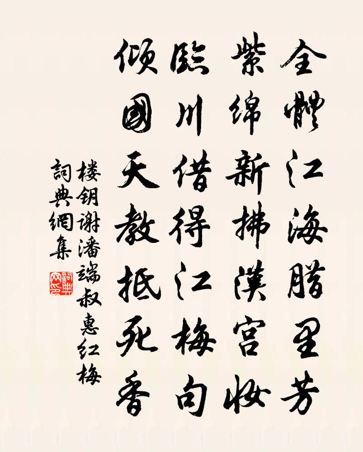 詩詞名句歷史字典書法欣賞書法字典國語詞典說文解字康熙字典古漢語字典標 題 作 者 詩 句 謝潘端叔惠紅梅作者:樓鑰 朝代:宋代謝潘端叔惠紅梅原文全體江海臘里芳,紫綿新拂漢宮妝。臨川借得江梅句,傾國天教抵死香。詩詞問答問:謝潘端叔惠紅梅的作者是誰?答:樓鑰問:謝潘端叔惠紅梅寫於哪個朝代?答:宋代樓鑰謝潘端叔惠紅梅書法欣賞謝潘端叔惠紅梅書法作品詩詞推薦清貧軒白玉蟾〔宋代〕一味逍遙不管天,日高丈五尚閒眠。溪魚村酒別般味,野蔌山餚不用錢。翁牖蓽門關小逕,乾柴白米煮清泉。有時丫頭岩喻良能〔宋代〕自有宇宙有此山,萬八千歲須臾間。亭亭造天屹石壁,雨淋日爍逾堅頑。且無泉瀑美裙帨,肯以草木媚容顏。丫頭洞仙歌佚名〔宋代〕六尺湘漪簟冷。痛恨晁說之〔宋代〕胡兒直犯洛陽宮,藹藹園陵指點中。殄滅四夷心不遂,裕陵蕭瑟獨悲風。戲題稚春杜少陵詩集林亦之〔宋代〕十年蕭蕭去武林,橐中唯有謫仙吟。君今失意還山窟,少陵詩集如明月。自怪平生每相似,窮愁嗜好亦如許。飯顆後天易吟三十首方回〔宋代〕易經之下卷,何以始恆鹹。貞女家人得,如詩有二南。又次韻子云春日絕句三首韓元吉〔宋代〕亂離誰意有新春,共醉春盤能幾人。但道少場無匹馬,便驚羅綺總爭新。一叢花·溪堂玩月作陳亮〔宋代〕冰輪斜輾鏡天長。江練隱寒光。危闌醉倚人如畫,隔煙村、何處鳴根。烏鵲倦棲,魚龍驚起,星斗掛垂楊。 蘆花竹溪直院盛稱起予草堂詩之善暇日覽之多有可劉克莊〔宋代〕種蠡功名士,吾評蠡最優。五湖足春水,一葉寄扁舟。變姓乘單舸,翻身退急流。千金徒鑄象,萬里孰馴鷗。震澤句陳韡〔宋代〕寄語園丁勤劃草,有時病叟出看花。酬薛奉禮見贈之作姚合〔唐代〕棲棲滄海一耕人,詔遣江邊作使君。山頂雨餘青到地,濤頭風起白連雲。詩成客見書牆和,藥熟僧來就鼎分。珍重奉酬於中丞登越王樓見寄之什楊牢〔唐代〕劍外書來日,驚忙自折封。丹青得山水,強健慰心胸。事少勝諸郡,江回見幾重。寧悲久作別,且似一相逢。詩合題郭季寬曉耕宿釣二圖楊冠卿〔宋代〕牛角橫素書,春犁破朝雨。鴻鵠志安知,功名心自許。送建康知錄操襟兄馬廷鸞〔宋代〕虎韉尚落諸賢后,雁塔誰知幾榜前。儘向心田寬地步,卻將官職信天緣。難忘舊日鐘山閣,易趁東風上水船。王謝秋江四絕滕岑〔宋代〕風色蕭蕭日色晴,晚潮未到水波平。系槎艇子關蓬睡,不管溪南喚渡聲。太常樂章三十首其二十七第二楊億〔宋代〕偃伯靈台,功成作樂。以昭德容,以清戎索。萬邦會同,群慝簫勺。盡善盡美,侔彼韶箾。東軒即事喻良能〔宋代〕嘯傲東軒得此生,平章物理憶淵明。晴塘灩灩起萍浪,夏木陰陰求友聲。聊欲庶幾三不惑,誰能復較四難並。旋燒緋桃花歌李鹹用〔唐代〕上帝 * 思麗絕,夭桃變態求新悅。便是花中傾國容,牡丹露泣長門月。野樹滴殘龍戰血,曦車碾下朝霞屑。惆悵頌古三十一首釋梵琮〔宋代〕一回見面不相瞞,便把當台古鏡看。暗裡照君還照我,清光一片逼人寒。首夏俞桂〔宋代〕槐幄陰陰蔽綠扉,池抽荷葉落薔薇。梁間紫燕新雛弱,來傍檐前旋學飛。名句推薦岸柳垂金線,雨晴鶯百囀。顧敻《醉公子·岸柳垂金線》 違山十里,蟪蛄之聲,猶在於佚名《孔子家語·子路初見》 勇於敢則殺,勇於不敢則活。文子《文子·卷五·道德》 翠鈿曉寒輕,獨倚鞦韆無力。楊冠卿《如夢令·滿院落花春寂》 君王遊樂萬機輕,一曲霓裳四海兵。李約《過華清宮》 金槳木蘭船,戲采江南蓮。劉孝威《採蓮曲·金槳木蘭船》 澗影見松竹,潭香聞芰荷。孟浩然《夏日浮舟過陳大水亭 / 浮舟過滕逸人別業》 愁煩中具瀟灑襟懷,滿抱皆春風和氣王永彬《圍爐夜話·第七八則》 銅鑄金鏞振紀綱,聲傳海外播戎羌。曹雪芹《交趾懷古》 治則衍及百姓,亂則不足及王公。荀子《荀子·君道》