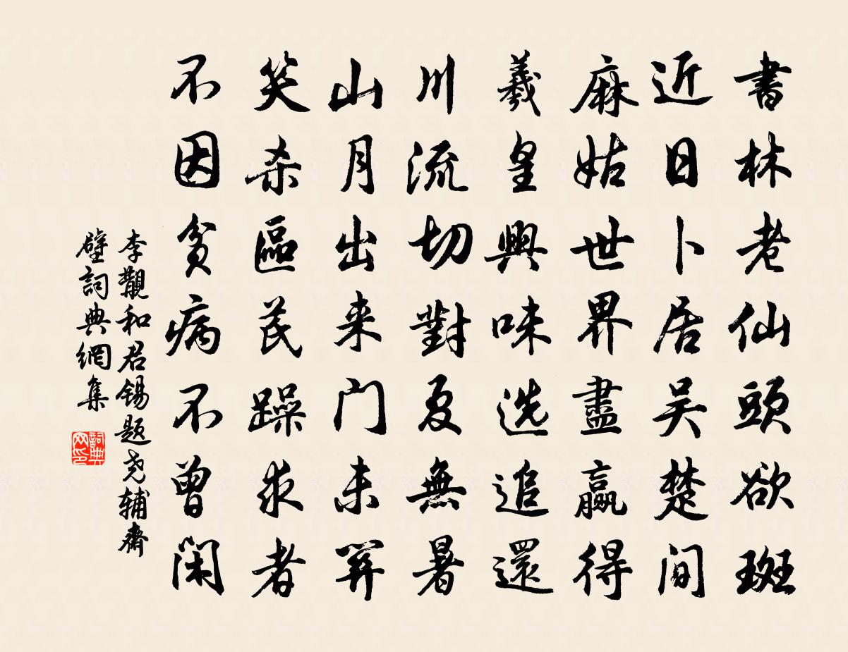 詩詞名句歷史字典書法欣賞書法字典國語詞典說文解字康熙字典古漢語字典標 題 作 者 詩 句 和君錫題堯輔齋壁作者:李覯 朝代:宋代和君錫題堯輔齋壁原文書林老仙頭欲斑,近日卜居吳楚間。麻姑世界盡贏得,羲皇興味選追還。川流切對夏無暑,山月出來門未關。笑殺區芪躁求者,不因貧病不曾閒。詩詞問答問:和君錫題堯輔齋壁的作者是誰?答:李覯問:和君錫題堯輔齋壁寫於哪個朝代?答:宋代李覯和君錫題堯輔齋壁書法欣賞和君錫題堯輔齋壁書法作品詩詞推薦遣吏約同官弈棋議事知有蘇山之游不果來晚使曹彥約〔宋代〕索居誰復共前籌,坐想蘇山最上頭。並轡水兼天共遠,孤吟棋與酒皆愁。熟令客里擠老老,不分軍前斷送秋。卻有濱州道中四首晁補之〔宋代〕月墮孤村露合,日出高原霧開。道逐故河西去,人將新雁南來。題趙大年小影趙孟堅〔宋代〕一行白鷺過前山,飛去沙鷗半復還。更有精能君見否,黃鸝兩兩綠楊間。送綽侄住庵吳興山中陸游〔宋代〕湖海相從十日留,頗哀老子鬢驚秋。目光猶射車牛背,不用殷勤舉話頭。書事投所知杜荀鶴〔唐代〕古陌寒風來去吹,馬蹄塵旋上 * 。雖然乾祿無休意,爭奈趨時不見機。詩思趁雲從岳涌,鄉心隨雁繞湖飛。肯將東平留贈狄司馬(曾與田安西充判官)高適〔唐代〕古人無宿諾,茲道以為難。萬里赴知己,一言誠可嘆。馬蹄經月窟,劍術指樓蘭。地出北庭盡,城臨西海寒。森然別昭德第愴然傷懷晃沖之〔宋代〕吾廬去汝到何期。四十年間此別離。合抱樹元從舊種,幾叢菊始自新移。老無兄弟飄零日,遠有公卿曠絕時。努力送李子永赴調改秩韓元吉〔宋代〕逸驥騫騰十二閒,追風那復駐轅間。向來官況誠留滯,此去詩情記往還。會譚未妨更美秩,趣班聊喜近天顏。割雞生查子(獨游西岩)辛棄疾〔宋代〕青山非不佳,未解留儂住。赤腳踏滄浪,為愛清溪故。朝來山鳥啼,勸上山高處。我意不關渠,自要尋蘭去。次韻仁近九日予病不出方回〔宋代〕炎涼飄忽嘆如流,久客仍逢歲不秋。高處未應堪著眼,悶中惟可獨搔頭。市酤太惡難沾醉,晴色良佳竟倦遊。戲馬水調歌頭夏元鼎〔宋代〕其胎息注想之迷,因與酬唱水調歌頭於後。採取鉛須密,誠意辨妍媸。休教錯認,奪來鼎內及其時。二物分明真偽月卿大師以書抵予言到自永嘉今將還杭因索詩強至〔宋代〕京洛多年作意游,撇然歸思滿林丘。塵衣才洗吳中水,吟錫還尋海畔州。獨夜揮弦泣山鬼,幾旬談妙動藩侯。孤雲喜觀即到,復題短篇二首杜甫〔唐代〕巫峽千山暗,終南萬里春。病中吾見弟,書到汝為人。意答兒童問,來經戰伐新。泊船悲喜後,款款話歸秦。待爾河陽道中李洞〔唐代〕衝風仍躡凍,提轡手頻呵。得事應須早,愁人不在多。雪田平入塞,煙郭曲隨河。翻憶江濤里,船中睡蓋蓑。臨別成都帳飲萬里橋贈譚德稱陸游〔宋代〕成都城南萬里橋,蘆根苹末風蕭蕭。映花碾草鈿車小,駐坡驀澗青驄驕。入門翠徑絕窈窕,臨水飛觀何迢嶢。判無夜雪偶書李處權〔宋代〕歲晚山雲合,窗鳴霰雪飛。方欣樽有酒,未嘆篋無衣。谷杳青松健,林空綠萼肥。月明溪上醉,應是夜深歸。中書寓直白居易〔唐代〕繚繞宮牆圍禁林,半開閶闔曉沉沉。天晴更覺南山近,月出方知西掖深。病對詞頭慚彩筆,老看鏡面愧華簪。自嫌除夕陸游〔宋代〕六聖涵濡作幸民,明朝七十八年身。門前西走都城道,臥看無窮來往人。挽寧宗皇帝詞二首曹彥約〔宋代〕混一開群策,憂勤損萬年。衣冠藏禹穴,歷數襲堯天。密定詒謀議,難留厭世仙,烏號攀莫及,有淚徹淵泉。滿江紅·代王夫人作文天祥〔宋代〕試問琵琶,胡沙外、怎生風色。最苦是、姚黃一朵,移根仙闕。王母歡闌瓊宴罷,仙人淚滿金盤側。聽行宮、半夜名句推薦聽於無聲,視於無形。戴聖《禮記·曲禮上》 傷心千古,秦淮一片明月!薩都剌《念奴嬌·登石頭城次東坡韻》 別院深深夏席清,石榴開遍透簾明。蘇舜欽《夏意》 山抹微雲,天連衰草,畫角聲斷譙門。秦觀《滿庭芳·山抹微雲》 金柳搖風樹樹,系彩舫龍舟遙岸。柳永《破陣樂·露花倒影》 意長翻恨遊絲短。盡日相思羅帶緩。嚴仁《玉樓春·春思》 胡風吹代馬,北擁魯陽關。李白《豫章行》 橫眉冷對千夫指,俯首甘為孺子牛。魯迅《自嘲》 君子而詐善,無異小人之肆惡;君子而改節,不若小人之自新。洪應明《菜根譚·概論》 恩宜自淡而濃,先濃後淡者人忘其惠洪應明《菜根譚·概論》
