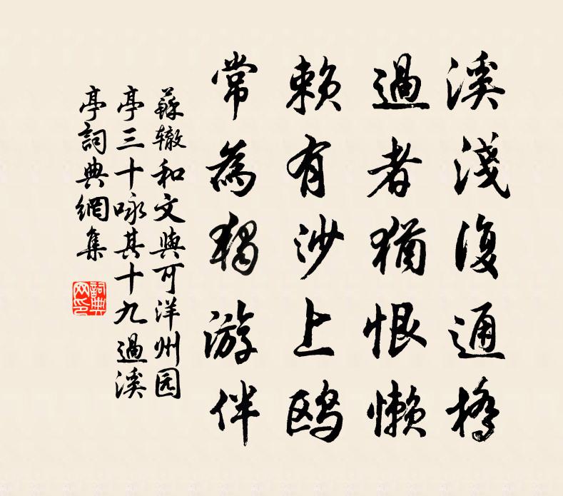 詩詞名句歷史字典書法欣賞書法字典國語詞典說文解字康熙字典古漢語字典標 題 作 者 詩 句 和文與可洋州園亭三十詠其十九過溪亭作者:蘇轍 朝代:宋代原文溪淺復通橋,過者猶恨懶。賴有沙上鷗,常為獨遊伴。詩詞問答問:《和文與可洋州園亭三十詠其十九過溪亭》的作者是誰?答:蘇轍問:該詩寫於哪個朝代?答:宋代問:蘇轍的名句有哪些?答:蘇轍名句大全書法欣賞和文與可洋州園亭三十詠其十九過溪亭書法作品詩詞推薦喜雨示兒侄丘葵〔宋代〕維天降靈雨,豈不雨石田。我自磽且確,枯悴莫怨天。鼓笛慢(甲申五月仙源試新水。雨過絲生荷香襲人,因感而賦此詞。時病眼)趙長卿〔宋代〕暑風吹雨仙源過,深院靜,涼於水。蓮花郎面,翠幢紅粉,烘人香細。別院新番,曲成初按,詞清聲脆。奈難堪羞春雨陸游〔宋代〕湖上新春柳,搖搖欲喚人。多情今夜雨,先洗馬蹄塵。正蒙主文教授大著寵示佳章輒繼嚴韻仰酬盛意度正〔宋代〕少省風雷亦壯哉,曾將科目放顏回。因尋俊秀傳衣缽,笑指凌雲得得來。如夢令馮延巳〔唐代〕塵拂玉台鸞鏡,鳳髻不堪重整。綃帳泣流蘇,愁掩玉屏人靜。多病,多病,自是行雲無定。瑤花汪元量〔宋代〕天中樹木,高聳玲瓏,向濯纓亭曲。繁枝綴玉。開朵朵九出。飛瓊環簇。唐昌曾見,有玉女、來送春目,更月夜、送松麓李應龍彝甫攜阿潁鵬升參學姚勉〔宋代〕老龍本自天門出,躍入璧池聊換骨。鵬雛夭矯更不凡,平視南溟渺東渤。玉京道上五年前,曾見鱗翮雙飛天。只今涼棚黃敏求〔宋代〕未庚赫日已焚空,亭午西齋坐甑同。橫竹旋排蒼葉密,小窗移在綠陰中。情知瑣碎妨新月,稍喜牽得暑中風。分我和子瞻鐵拄杖蘇轍〔宋代〕截竹為杖瘦且輕,石壑竹破誤汝行。削木為杖輕且好,道遠木折恐不到。閩君鐵杖七尺長,色如黑蛇氣如霜。提攜奉使設宴戲擲籠籌朱灣〔唐代〕今日陪樽俎,良籌復在茲。獻酬君有禮,賞罰我無私。莫怪斜相向,還將正自持。一朝權入手,看取令行時。順陽歌劉禹錫〔唐代〕朝辭官軍驛,前望順陽路。野水齧荒墳,秋蟲鏤宮樹。曾聞天寶末,胡馬西南騖。城守魯將軍,拔城從此去。游石門詩文同〔宋代〕凌城走馬過花村,朱玩玉盆到石門。細想張良燒斷處,岩前佇立欲銷魂。晚春宴韋道遜〔唐代〕日斜賓館晚,春輕麥候初。檐暄巢幕燕,池躍戲蓮魚。石聲隨流響,桐影傍岩疏。誰能千里外,獨寄八行書。和子瞻新居欲成二首蘇轍〔宋代〕山連上帝朱明府,心是南宗無盡燈。過此欹危空比夢,年來瘴毒冷如冰。圖書一笑寧勞客,音信頻來尚有僧。梨棗和石學士直舍晨興宋祁〔宋代〕高閣休殘暝,層梁逼早暾。芳風萬年樹,殘月九重閽。枕歇淵魚夢,裘貪睡貉溫。星杓壓城角,天漢落河源。肅唱柳陸游〔宋代〕春來無處不春風,偏在湖橋柳色中。看得淺黃成嫩綠,始知造物有全功。春風李鹹用〔唐代〕青帝使和氣,吹噓萬國中。發生寧有異,先後自難同。輦草不消力,岩花應費功。年年三十騎,飄入玉蟾宮。初喪崔兒報微之晦叔白居易〔唐代〕書報微之晦叔知,欲題崔字淚先垂。世間此恨偏敦我,天下何人不哭兒。[音堆,見詩注。]蟬老悲鳴拋蛻後,龍春晚喜晴楊載〔元代〕積雨俄經月,新晴始見春。蒼苔侵別墅,綠水過比鄰。性僻居宜遠,身閒景易親。無詩排世累,有酒縱天真。循圃臥疾走筆酬韓愈書問賈島〔唐代〕一臥三四旬,數書惟獨君。願為出海月,不作歸山雲。身上衣頻寄,甌中物亦分。欲知強健否,病鶴未離群。名句推薦微雨靄芳原,春鳩鳴何處。韋應物《東郊》 士雖有學,而行為本焉。墨子《墨子·02章 修身》 丈夫不能再辱。班固《漢書·傳·李廣蘇建傳》 青山一道同雲雨,明月何曾是兩鄉。王昌齡《送柴侍御》 相顧無言,惟有淚千行。蘇軾《江城子·乙卯正月二十日夜記夢》 又酒趁哀弦,燈照離席。梨花榆火催寒食。周邦彥《蘭陵王·柳》 鴻羽難憑芳信短,長安猶近歸期遠。盧祖皋《倦尋芳·香泥壘燕》 通則驕而偏,窮則棄而儑。荀子《荀子·不苟》 萬里中原烽火北,一尊濁酒戍樓東。張孝祥《浣溪沙·霜日明霄水蘸空》 蠶娘洗繭前溪淥,牧童吹笛和衣浴。貫休《春晚書山家屋壁二首》