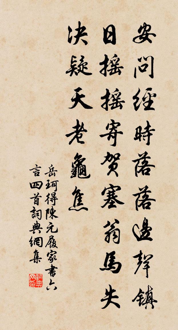 詩詞名句歷史字典書法欣賞書法字典國語詞典說文解字康熙字典古漢語字典標 題 作 者 詩 句 得陳元履家書六言四首作者:岳珂 朝代:宋代得陳元履家書六言四首原文安問經時落落,邊聲鎮日搖搖。寄賀塞翁馬失,決疑天老龜焦。詩詞問答問:得陳元履家書六言四首的作者是誰?答:岳珂問:得陳元履家書六言四首寫於哪個朝代?答:宋代岳珂得陳元履家書六言四首書法欣賞得陳元履家書六言四首書法作品詩詞推薦黃尚書輓詩二首項安世〔宋代〕嗣對膺圖日,群生望治時。忽聞公已病,相顧事堪疑。竟作堂堂去,空書咄咄詞。眼中衰淚盡,持底送靈輀。掃地周南〔宋代〕滑幾懸游氣,磨磚出寸光。及時須敝帚,措影見胡床。拱揖延書入,澄收得慮莊。蒼頭擁箕袂,持禮老夫旁。謝元道惠桂樹子韓維〔宋代〕洛陽奇卉兼四方,妖姿冶艷爭春陽。蔚然幽佳獨凌霜,中岩無人閟寒芳。山翁軍搜劚青蒼,名園得之為輝光。護以秋思張玉孃〔宋代〕秋入銀壯老井梧,能言鸚鵡日相呼。蘭閨半月間鍼綿,學得崔徽一鏡圖。長興里夏日南鄰避暑許渾〔唐代〕侯門大道傍,蟬噪樹蒼蒼。開鎖洞門遠,下簾賓館涼。欄圍紅藥盛,架引綠蘿長。永日一欹枕,故山雲水鄉。次韻和不疑假書鄰幾知方酣寢為詩通意司馬光〔宋代〕江翁琴順天和,琴心跡兩夷簡。雖如邊韶寢,且異宰予懶。平居無進間,經史自課限。高歌慕翰林,鳴琴寫中散。晚涼散策二首楊萬里〔宋代〕飯余浴罷趁涼行,偶憩池頭最小亭。醉倚胡床便成睡,夢聞荷氣忽然醒。癸巳夏秋旱七月十月得雨喜雨有作吳芾〔宋代〕旱魃為災害有秋,焦枯滿目使人憂。片雲忽向天邊合,一雨俄驚地上流。盡道槁苗須半活,如雲晚稻可全收。老農鷓鴣天佚名〔宋代〕紫禁菸光一萬重。五門金碧射晴空。梨園羯鼓三千面,陸海鰲山十二峰。香霧重,月華濃。露台仙仗彩雲中。朱欄水龍吟(壽嗣榮王)吳文英〔宋代〕望中璇海波新,泛槎又匝銀河轉。金風細裊,龍枝聲奏,鈞簫秋遠。南極飛仙,夜來催駕,祥光重見,紫霄承露掌天長節梁鍠〔唐代〕日月生天久,年年慶一回。時平祥不去,壽遠節長來。連吹千家笛,同朝百郡杯。願持金殿鏡,處處照遺才。好事近朱敦儒〔宋代〕綠泛一甌雲,留住欲飛胡蝶。相對夜深花下,洗蕭蕭風月。從容言笑醉還醒,爭忍便輕別。只願主人留客,更重斟題天平壽老方丈范成大〔宋代〕二十三年再入山,此山於我有前緣。時人不用憐衰病,天與丹房一線泉。次曹近山見寄林景熙〔宋代〕扣角歌殘夜正長,懶將龜夾卜行藏。風煙萬里別離夢,草木一溪文字香。仙泣銅盤辭渭水,鶴歸華表認遼陽。愁來溪庵放言十首劉克莊〔宋代〕市朝易得虛誇,鄉井難諱實年。還笏殿前已晚,飾巾牖下差賢。魚石二首孔武仲〔宋代〕鬐鬣真可辨,精研真入神。得非造化境,亦有雕鎪人。頗疑著妄想,歲久積成真。茲理不足怪,方屏藏月輪。次韻黃夷仲茶磨蘇軾〔宋代〕前人初用茗飲時,煮之無問葉與骨。浸窮厥味臼始用,復計其初碾方出。計盡功極至於磨,信哉智者能創物。破槽地藏塔陳岩〔宋代〕八十四級山頭石,五百餘年地藏墳。風撼塔鈴天半語,眾人都向夢中聞。部役書懷張舜民〔宋代〕近市銅章泊近郊,炯無塵慮掛秋毫。含宏品彙知天大,照鑒容光仰日高。市舍柔桑圍幄幙,弄風新麥泛波濤。巷歌題畫四首唐寅〔明代〕東崦荷花西崦菱,大船漁網小船罨。我依住處真堪畫,借問旁人到未曾。名句推薦宜有詞仙,擁素雲黃鶴,與君遊戲。姜夔《翠樓吟·淳熙丙午冬》 任憑弱水三千,我只取一瓢飲。曹雪芹《紅樓夢·第九十一回》 養備而動時,則天不能病;修道而不貳,則天不能禍。荀子《荀子·天論》 責人勿厲,小惠或有大得。來俊臣《羅織經·保身卷第七》 山色遙連秦樹晚,砧聲近報漢宮秋。韓翃《同題仙遊觀》 玉樹歌殘王氣終,景陽兵合戍樓空。許渾《金陵懷古》 天下者非一人之天下,唯有道者處之。姜子牙《六韜·武韜·順啟》 若耶溪傍採蓮女,笑隔荷花共人語。李白《採蓮曲》 自誠明,謂之性;自明誠,謂之教。子思《中庸·第二十一章》 歸雁橫秋,倦客思家。張可久《折桂令·九日》