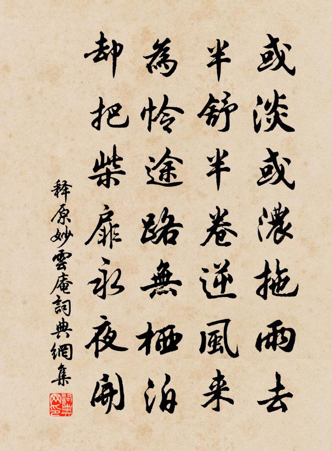 詩詞名句歷史字典書法欣賞書法字典國語詞典說文解字康熙字典古漢語字典標 題 作 者 詩 句 雲庵作者:釋原妙 朝代:宋代雲庵原文或淡或濃拖雨去,半舒半卷逆風來。為憐途路無棲泊,卻把柴扉永夜開。詩詞問答問:雲庵的作者是誰?答:釋原妙問:雲庵寫於哪個朝代?答:宋代釋原妙雲庵書法欣賞雲庵書法作品詩詞推薦庚戌冬乘浣隙謁西林寺漸老二首曾豐〔宋代〕傳衣今北秀,駐錫小西林。握手鼎相別,敲門踵見尋。溫顏塵外禮,軟語法中音。從此利名垢,那容點我降,凝雲榭晚興文同〔宋代〕晚策倚危榭,群峰天際橫。雲陰下斜谷,雨勢落褒城。遠渡孤煙起,前村夕照明。遙懷寄新月,又見一棱生。遊仙四首王績〔唐代〕暫出東陂路,過訪北岩前。蔡經新學道,王烈舊成仙。駕鶴來無日,乘龍去幾年。三山銀作地,八洞玉為天。金精湖湄閒適二首孫銳〔宋代〕推窗笑指浣溪紗,點點飛鷗拍浪沙。儂自有心禽解語,拋磚水激落天涯。句釋淨照〔宋代〕雲歸大似諳風勢,水咽多應恨世情。次回仙韻文及翁〔宋代〕開山鑿石天無際,釣水耕雲地有餘。金鼎莫傳添汞法,墨池且問太玄書。宋江三十六贊龔開〔宋代〕風有大小,黑惡則懼。一噫之微,香滿太虛。杜母陳造〔宋代〕杜母遺芳豈遠求,田功誰比此邦優。麥疄桑隴疑淮左,近水遙山似秀州。樓識景疏知俗美,亭因思孟各風流。我來南園賞花邵雍〔宋代〕三月初三花正開,閒同親舊上春台。尋常不醉此時醉,更醉猶能舉大杯。游九龍潭武則天〔唐代〕山窗游玉女,澗戶對瓊峰。岩頂翔雙鳳,潭心倒九龍。酒中浮竹葉,杯上寫芙蓉。故驗家山賞,惟有風入松。齊雲嶺陳岩〔宋代〕金闕瑤階路不迷,白雲翠嶺一般齊。我今要達參寥境,借作凌虛萬丈梯。毛女楊維楨〔元代〕沙丘腥風吹腐化,華 * 女藏雙魚。宮中雨露不可食,餐松啖柏留春容。桃花流水迷紅霧,十二峰頭度朝暮。自是念奴嬌佚名〔宋代〕歲華漸杪,又還是春也,難禁愁寂。欲探疏梅,獨自個、尋訪山村水驛。路轉溪斜,竹低牆短,應是瑤姬宅。玉蕤和吳警齋侍郎二首劉克莊〔宋代〕帝憫龍鍾許放還,夢魂尚記侍威顏。難陪貢禹王陽後,猶在申公轅固間。昔領群仙上蓬島,今為居士老香山。痴年憶浮家洞林亦之〔宋代〕萬竹蒼蒼烏鳥啼,一江渺渺薜蘿西。幽懷動處蘭初長,好句來時月已低。年歲卻從為客盡,家書長是倩人題。疎鍾滿江紅佚名〔宋代〕在昔嘗聞,老彭祖、壽齡八百。試屈指、我公今歲,才方八八。乙百更添三十六,算來總是公年月。對梅花、時候和崇安壁間陳宓〔宋代〕人人盡道為貧驅,出不高車食不魚。陋巷最貧誰氏子,藜羹淪飯味詩書。巧松華岳〔宋代〕萬折千蟠去不回,不知處士為誰栽。錢塘九里空蕭瑟,得似天孫送種來。洋州三十景蓼嶼鮮于侁〔宋代〕盈枝紅欲滴,照水色更好。朝暮幾回新,何用催秋老。送荀道士歸廬山李端〔唐代〕先生歸有處,欲別笑無言。綠水到山口,青林連洞門。月明尋石路,雲霽望花源。早晚還乘鶴,悲歌向故園。名句推薦寒鴉飛數點,流水繞孤村。楊廣《失題》 群峭碧摩天,逍遙不記年李白《尋雍尊師隱居》 百囀千聲隨意移,山花紅紫樹高低。歐陽修《畫眉鳥》 清江一曲柳千條,二十年前舊板橋。劉禹錫《楊柳枝 / 柳枝詞》 女大不中留。馮夢龍《警世通言·卷三十八》 君使臣以禮,臣事君以忠。孔子弟子《論語·八佾篇》 寒波淡淡起,白鳥悠悠下。元好問《潁亭留別》 還背垂虹秋去,四橋煙雨,一宵歌酒。吳文英《瑞龍吟·送梅津》 回首暮雲遠,飛絮攪青冥。蘇軾《水調歌頭·昵昵兒女語》 薄倖郎君何日到,想自當初,莫要相逢好。施耐庵《蝶戀花·一別家山音信杳》