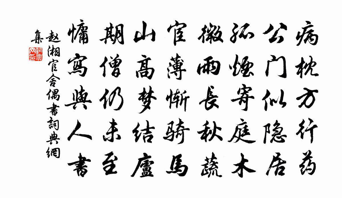 詩詞名句歷史字典書法欣賞書法字典國語詞典說文解字康熙字典古漢語字典標 題 作 者 詩 句 官舍偶書作者:趙湘 朝代:唐代官舍偶書原文病枕方行藥,公門似隱居。孤煙寄庭木,微雨長秋蔬,宦薄慚騎馬,山高夢結廬。期僧仍未至,慵寫與人書。詩詞問答問:官舍偶書的作者是誰?答:趙湘問:官舍偶書寫於哪個朝代?答:唐代趙湘官舍偶書書法欣賞官舍偶書書法作品詩詞推薦暇日邀王天任諸公游南坡天任有詩因次韻虞儔〔宋代〕君家有西園,望我南山巔。觴詠繼曲水,花石希平泉。長溝流砌下,遠岫列楹前。春風一披拂,百卉為渠妍。迨茲題耕織圖二十四首奉懿旨撰趙孟頫〔元代〕五月夏以半,谷鶯先弄晨。老蠶成雪繭,吐絲亂紛紜。伐葦作薄曲,束縛齊榛榛。黃者黃如金,白者白如銀。爛然桂林鹿鳴宴樂語口號李曾伯〔宋代〕玉帳宏開會眾英,嶄嶄頭角露崢嶸。人才數半凌煙贊,姓氏推先月旦評。桂子風前鵬翮健,梅花雪外馬蹄輕。兩魁乾道別廟樂歌三首真宗〔宋代〕涓選休辰,於秋之杪。既齊既武,爰假祖廟。有侐們坤,舊章是俲。享祀奚為,天子純孝。挽徐郎中王柏〔宋代〕郎潛不復坦衿期,留得清名舉世知。老矣空還新虎節,歸來只是舊鴻禧。危言寧免班行忌,已死猶聞海內推。病里西江月·遣興辛棄疾〔宋代〕醉里且貪歡笑,要愁那得工夫。近來始覺古人書。信著全無是處。(著 通:著)昨夜松邊醉倒,問松我醉何如。舞曲歌辭。白紵歌二首王建〔唐代〕天河漫漫北斗粲,宮中烏啼知夜半。新縫白紵舞衣成,來遲邀得吳王迎。低鬟轉面掩雙袖,玉釵浮動秋風生。酒多書事四首高斯得〔宋代〕兩月竄荊棘,愁生祗自憐。屈盤茅屋底,擎跽野人前。盡室逾百指,看囊無一錢。長安望不見,何日靜戈鋋。客舟鄭獬〔宋代〕滄江落日動,宿鳥歸故山。托巢在高木,朝去夕必還。客舟逐南風,大雪留楚關。何日掃吾廬,種秫鄖溪間。迓黃守再來二首胡寅〔宋代〕舊治重臨寵渥新,聖朝因任慰斯民。芾棠不拜陰如幄,騎竹爭迎氣似春。金重百斤兼賜爵,車高一丈更施茵。能名陪江州李使君重陽宴百花亭朱慶餘〔唐代〕閒攜九日酒,共到百花亭。醉里求詩境,回看島嶼青。臨江仙曹勛〔宋代〕連夜陰雲開曉景,中秋勝事偏饒。十分晴瑩碧天高。台升吳岫頂,樂振海門潮。桂影一庭香漸遠,四並都向今朝。別離情所鍾十二章章四句送定叟弟之官嚴陵張栻〔宋代〕嚴之水淪漪,其山復蒼蒼。子陵釣游地,草木有餘光。幽居雜題陸游〔宋代〕雅意元知止,遄歸喜遂初。久閒棋格長,多病釣徒疏。漬藥三升酒,支頭一束書。兒曹看翁嬾,切勿厭蝸廬。木蘭花/玉樓春晏殊〔宋代〕紫薇朱槿繁開後。枕簟微涼生玉漏。玳筵初啟日穿簾,檀板欲開香滿袖。紅衫侍女頻傾酒。龜鶴仙人來獻壽。歡聲經略龍圖開拓曾公岩景物一新遂為諸岩之冠因楊損〔唐代〕陽岩高敞納晨曦,鶴駕雲軿或可期。神物雕鐫元入妙,人工開闢更增奇。須知水石清涼處,絕勝塵沙熱惱時。紅旆讀孟信州和方亨道六月雨時當雪天改為欲作雪方回〔宋代〕十月墐戶入室處。東作豐登未可期,南方瘴癘已堪御。去年雪不及臘間,霜天桃杏敷紅顏。今年夏竟無冰賣,富屋橙子四首劉子翬〔宋代〕自從天籞守吏散,老樹零落煙雲淒。今朝我為作知已,小摘秋風黃欲齊。詠史下荀彧陳普〔宋代〕河濟太山猶是漢,匆匆把作賊關中。久知天下無劉氏,不料人間有孔融。偈頌一百零二首釋慧遠〔宋代〕兩陣交鋒出戰時,旗鑰倒卓鼓無槌。絲毫不犯將軍令,獨腳機關各自提。名句推薦田家占氣候,共說此年豐。孟浩然《田家元日》 關西老將不勝愁,駐馬聽之雙淚流。王維《隴頭吟》 獨立小橋風滿袖,平林新月人歸後。馮延巳《鵲踏枝·誰道閒情拋擲久》 三更燈火五更雞,正是男兒讀書時。顏真卿《勸學詩》 白日放歌須縱酒,青春作伴好還鄉。杜甫《聞官軍收河南河北》 故聲聞過情,君子恥之。孟子《孟子·離婁章句下·第十八節》 敵者,利害相衝,死生弗容;未察之無以辨友,非制之無以成業。來俊臣《羅織經·制敵卷第五》 春去花還在,人來鳥不驚。王維《畫》 停車數行日,勸酒問回期。王建《送人游塞》 知其雄,守其雌,為天下谿。老子《老子·道經·第二十八章》