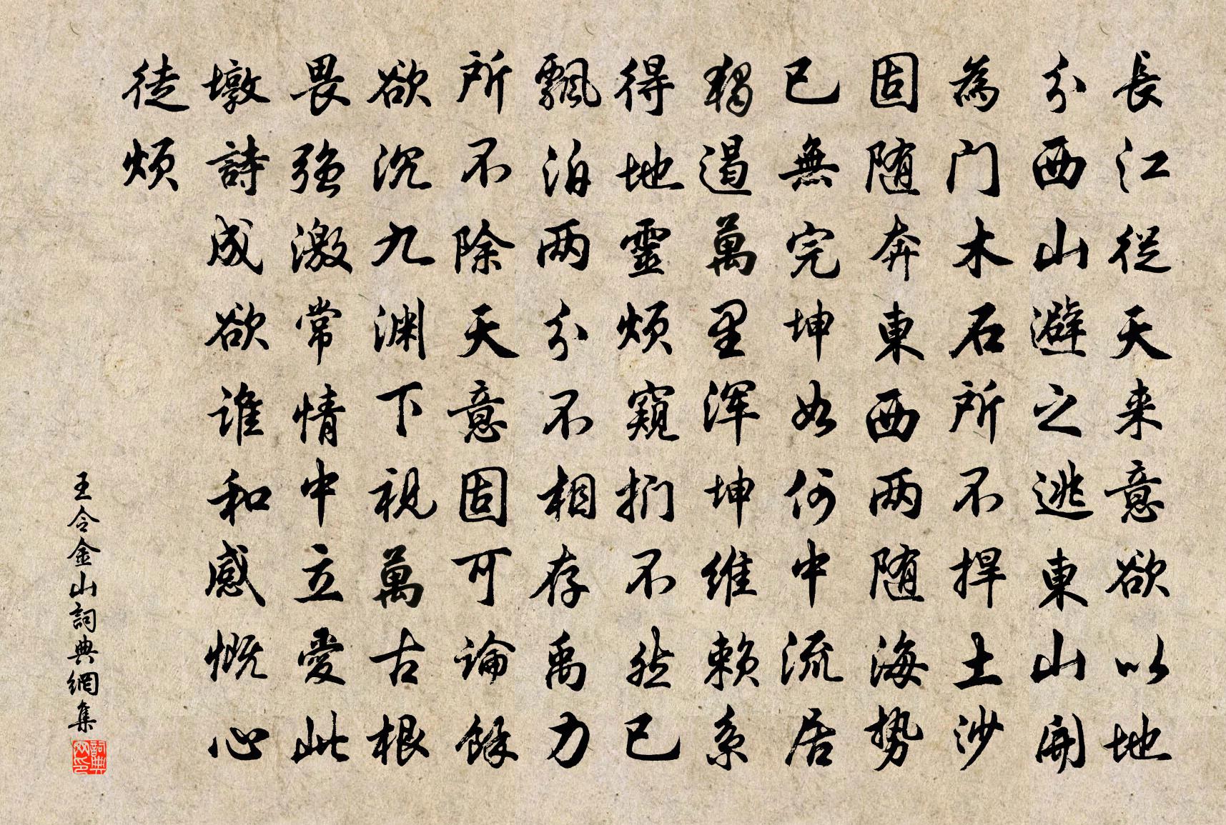 詩詞名句歷史字典書法欣賞書法字典國語詞典說文解字康熙字典古漢語字典標 題 作 者 詩 句 金山作者:王令 朝代:宋代金山原文長江從天來,意欲以地分。西山避之逃,東山開為門。木石所不捍,土沙固隨奔。東西兩隨海,勢已無完坤。如何中流居,獨遏萬里渾。坤維賴系得,地靈煩窺捫。不然已飄泊,兩分不相存。禹力所不除,天意固可論。余欲沉九淵,下視萬古根。畏強激常情,中立愛此墩。詩成欲誰和,感慨心徒煩。詩詞問答問:金山的作者是誰?答:王令問:金山寫於哪個朝代?答:宋代王令金山書法欣賞金山書法作品詩詞推薦詠物陳杰〔宋代〕天成不挫節根完,底是園工出相端。花面索回銀鳳舞,苔身宛轉翠虬蟠。由來疏散林壑性,稍就規繩廊廟看。至竟寄鄭州曾資政韓維〔宋代〕魯公旌旆鎮茲邦,曾奉樽罍佚老堂。彩服過庭聞政術,緇衣傳世見詩章。鬥龍門外波光綠,集鳳台邊柳色黃。應感減字木蘭花朱淑真〔宋代〕獨行獨坐,獨唱獨酬還獨臥。佇立傷神,無奈輕寒著摸人。此情誰見,淚洗殘妝無一半。愁病相仍,剔盡寒燈夢不感事三首晁公溯〔宋代〕常恐東南驛騎疏,每逢人至問揚都。深知白虜心輕漢,終倚黃旗運在吳。黃氏三層樓華岳〔宋代〕瘦筇支我上高寒,風露淒清酒力慳。千里人邀千里月,一重樓見一重山。筵前飛雪噴焦遂,檻外行雲遏小蠻。便好驀山溪(臘日游堯山)黃裳〔宋代〕春前信息,到處歡聲滿。旌旆出西郊,擁笙歌、嬋娟兩畔。東巡事往,空有雪中山,仙馭悄,古風間,謾動吟人嘆和韓子云見寄四首吳芾〔宋代〕當時邂逅已心傾,別後逢人問去程。顧我拙疏非世用,喜君明悟自天成。十年不見懷芝宇,一笑相逢付曲生。暫爾秋興陸游〔宋代〕天遣幽人盡放狂,醉眠無復客為妨。墨蛟飛下剡藤滑,蒼璧碾成官焙香。老境雖深身更健,清秋欲半日猶長。閉門對雪二首毛滂〔宋代〕空庭白鳳舞毰毸,撲帟窺簾去卻回。柳絮似將春色到,梅梢不認月華來。輕盈舞殿三千女,縹緲飛天十二台。定有山行劉應時〔宋代〕春光淡心目,乘興聊躋攀。頗識造物意,長容我輩閒。橫拖拄杖去,笑折梅花還。彼哉鐘鼎樂,不在山林間。從軍行王貞白〔唐代〕從軍朔方久,未省用干戈。只以恩信及,自然戎虜和。邊聲動白草,燒色入枯河。每度因看獵,令人勇氣多。繩金寺黎良知〔宋代〕懸崖結屋層層閣,眺遠開窗面面峰。雲起半天齊碧瓦,風生萬壑響長松。又和洪咨夔〔宋代〕天時人事共流通,何用將冰語夏蟲。判為梅花多釀酒,春風裹著蜜翁翁。送杜審言宋之問〔唐代〕臥病人事絕,嗟君萬里行。河橋不相送,江樹遠含情。別路追孫楚,維舟吊屈平。可惜龍泉劍,流落在豐城。古詩十九首·孟冬寒氣至佚名〔兩漢〕孟冬寒氣至,北風何慘栗。愁多知夜長,仰觀眾星列。三五明月滿,四五蟾兔缺。客從遠方來,遺我一書札。上言扇子詩李石〔宋代〕錦暖海棠欲睡,絮濃楊柳初眠。蝶老鬭高屢舞,鶯雛學語如弦。春日留別(一作惜別)張籍〔唐代〕遊人欲別離,半醉對花枝。看著春又晚,莫輕少年時。臨行記分處,回首是相思。各向天涯去,重來未可期。送人之淮西夏竦〔宋代〕五里亭前一送君,碧油紅旆駐清塵。半軒晚日淮西路,數拍離歌江上春。杜宇有情移別樹,野共無主傍行人。男兒蜀國偶題錢〔唐代〕忽憶明皇西幸時,暗傷潛恨竟誰知。佩蘭應語宮臣道,莫向金盤進荔枝。喜晴吳芾〔宋代〕我家世業本農夫,力作耕田供百需。食無魚兮出無車,但守桑梓依枌榆。中更兵火田園蕪,骨肉奔迸幾為奴。飢腸名句推薦父兄有善行,子弟學之或不肖王永彬《圍爐夜話·第三三則》 惱亂橫波秋一寸。斜陽只與黃昏近。趙令畤《蝶戀花·卷絮風頭寒欲盡》 今我來思,雨雪載途。佚名《出車》 有力者疾以助人,有財者勉以分人,有道者勸以教人。墨子《墨子·10章 尚賢(下)》 飛雪過江來,船在赤欄橋側。呂渭老《好事近·飛雪過江來》 一壺酒,一竿身,快活如儂有幾人。李煜《漁父·浪花有意千里雪》 驚風亂颭芙蓉水,密雨斜侵薜荔牆。柳宗元《登柳州城樓寄漳汀封連四州》 霰雪紛其無垠兮,雲霏霏而承宇。屈原《九章》 夕陽閒淡秋光老,離思滿蘅皋柳永《少年游·參差煙樹灞陵橋》 脈脈花疏天淡,雲來去、數枝雪。范成大《霜天曉角·梅》