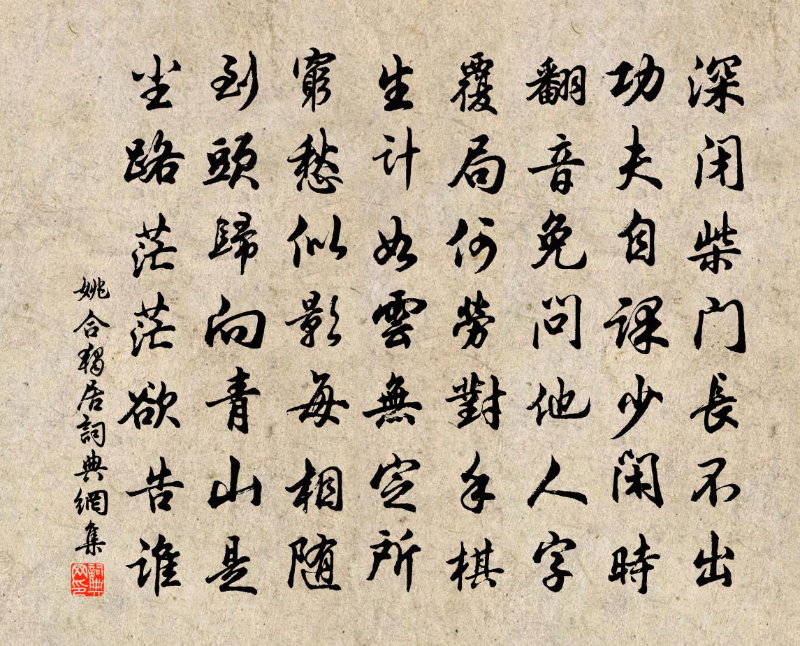 詩詞名句歷史字典書法欣賞書法字典國語詞典說文解字康熙字典古漢語字典標 題 作 者 詩 句 獨居作者:姚合 朝代:唐代獨居原文深閉柴門長不出,功夫自課少閒時。翻音免問他人字,覆局何勞對手棋。生計如雲無定所,窮愁似影每相隨。到頭歸向青山是,塵路茫茫欲告誰。詩詞問答問:獨居的作者是誰?答:姚合問:獨居寫於哪個朝代?答:唐代問:獨居是什麼體裁?答:七律姚合獨居書法欣賞獨居書法作品注釋全唐詩:卷498-13詩詞推薦從馮黎州飲梅林以山谷舊時愛酒陶彭澤今日梅李流謙〔宋代〕巾冠熊墮城府,熊桔槔無休時。胸脾貯黃埃,非復林壑姿。涎流方外勝,秦人望軒羲。萬金買閒日,駕言一紓眉。頌古一百首釋智愚〔宋代〕火爐頭話幾多船,自己同時作魔觀,直下起來呈兩指,山河大地黑漫漫。薔薇倪龍輔〔宋代〕洛本空藏畫牡丹,海棠出蜀近應難。莫嫌村巷薔薇野,春晚猶堪取次看。過華山潘閬〔宋代〕高愛三峰插太虛,掉頭吟望倒騎驢。旁人大笑從他笑,終擬移家向此居。舟次吳興二首林景熙〔宋代〕釣舟遠隔菰蒲雨,酒幔輕飄菡萏風。彷佛層城鰲背上,萬家簾幕水晶宮。清閒口號乾隆〔清代〕人言難得是清閒,我略清閒輒赧顏。設使樂斯更何慮,滿招憂亦在其間。閒題鄭谷〔唐代〕舉世何人肯自知,須逢精鑑定妍媸。若教嫫母臨明鏡,也道不勞紅粉施。送前東陽於明府由鄂渚歸故林張元乾〔宋代〕老舒古君子,送客皆善類。觴行頗軒渠,一斗輒徑醉。涼颸生白苹,落日照紫翠。驪駒雖在門,不下兒女淚。儻復有所思聯句孟郊〔唐代〕相思繞我心,日夕千萬重。年光坐婉娩,春淚銷顏容。 ——孟郊台鏡晦舊暉,庭草滋深茸。望夫山上石,別劍水端午詞御閣晏殊〔宋代〕五彩絲長系臂初,萬年芳樹影扶疏。豈勞方士標神篆,自有真靈衛帝居。讀史蕭澥〔宋代〕何事漢庭羞噲伍,竟於鍾室起疑猜。腰間刀劍少年氣,尚出淮陰跨下來。白水池次俞山長韻楊公遠〔宋代〕石眼泉流乳,盈池永不乾。空明涵玉潤,湛徹帶雲寒。月浸知無異,鷗來訂卻難。何郎今在否,好向此憑闌。秋雨懷友生寇準〔宋代〕江城秋雨歇,孤坐役吟身。草色荒三逕,蟲聲滿四鄰。邊鴻來已近,庭葉落還頻。對此空搔首,無由面故人。偈頌一百零二首釋紹曇〔宋代〕覺城東際,小小叢林。旃檀圍繞,獅子嚬呻。蘿月四窗雲萬壑,見成一片祖師心。眼裡無筋一世貧。予以四韻記陸大夫三高圖自謂能省句矣後作絕晁說之〔宋代〕馬解馱經度碧空,便令王許伴支公。山童野仆立如石,忘卻儂曾在會中。送閏師之長安謝紫衣魏野〔宋代〕送閏師之長安謝紫衣。真宗永定陵宋祁〔宋代〕洛水縈祠外,嵩雲泊棟端。橋山何必問,只是葬衣冠。送廣東潘帥移鎮湖南十口號曾豐〔宋代〕廣州初怨失吾侯,逕入中都為借留。上詔廣人好歸去,朕心先已許潭州。齊天樂周密〔宋代〕曲屏遮斷行雲夢,西樓怕聽疏雨。研凍凝華,香寒散霧,呵筆慵題新句。長安倦旋。嘆衣染塵痕,鏡添秋縷。過盡寶陀三句釋普濟〔宋代〕寶陀一路,來來去去。撞著鰲頭,風波無數。名句推薦離堂思琴瑟,別路繞山川。陳子昂《春夜別友人二首·其一》 人之愛子,罕亦能均;自古及今,此弊多矣。顏之推《顏氏家訓·教子篇》 為奏薰琴唱,仍題寶劍名。張九齡《奉和聖制送尚書燕國公赴朔方》 看來豈是尋常色,濃淡由他冰雪中。曹雪芹《詠紅梅花得“紅”字》 入則無法家拂士,出則無敵國外患者,國恆亡。孟子及其弟子《生於憂患,死於安樂》 零落江南不自由。兩綢繆。料得吟鸞夜夜愁。姜夔《憶王孫·番陽彭氏小樓作》 坐到三更盡,歸仍萬里賒。戎昱《桂州臘夜》 晴煙漠漠柳毿毿,不那離情酒半酣。韋莊《古離別》 清鏡無雙影,窮泉有幾重。顧況《酅公合祔輓歌》 欲將輕騎逐,大雪滿弓刀。盧綸《和張僕射塞下曲·其三》