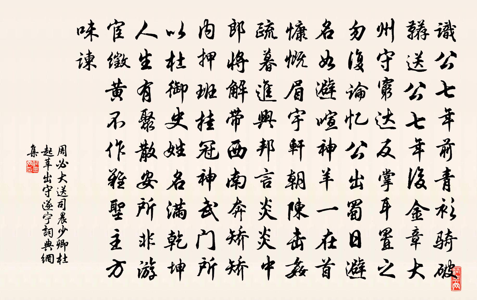 詩詞名句歷史字典書法欣賞書法字典國語詞典說文解字康熙字典古漢語字典標 題 作 者 詩 句 送司農少卿杜起莘出守遂寧作者:周必大 朝代:宋代送司農少卿杜起莘出守遂寧原文識公七年前,青衫騎破韉。送公七年後,金章大州守。窮達反掌耳,置之勿復論。憶公出蜀日,避名如避喧。神羊一在首,慷慨眉宇軒。朝陳擊奸疏,暮進興邦言。炎炎中郎將,解帶西南奔。矯矯內押班,掛冠神武門。所以杜御史,姓名滿乾坤。人生有聚散,安所非遊宦。徵黃不作難,聖主方味諫。詩詞問答問:送司農少卿杜起莘出守遂寧的作者是誰?答:周必大問:送司農少卿杜起莘出守遂寧寫於哪個朝代?答:宋代周必大送司農少卿杜起莘出守遂寧書法欣賞送司農少卿杜起莘出守遂寧書法作品詩詞推薦招王質夫 自此後詩,為周至尉時作。白居易〔唐代〕濯足雲水客,折腰簪笏身。喧閒跡相背,十里別經旬。忽因乘逸興,莫惜訪囂塵。窗前故栽竹,與君為主人。感遇之十八陳子昂〔唐代〕逶迤勢已久。骨鯁道斯窮。豈無感激者。時俗頹此風。灌園何其鄙。皎皎於陵中。世道不相容。喈喈張長公。到梅山次韻弟茝陳著〔宋代〕相對兩衰翁,此心無復童。幸叨無事坐,貧欠有錢通。菜粥琴書畫,梅花雪月風。黃塵在門外,勞隱是英雄。西山鑿池種白蓮作方信孺〔宋代〕池開新白遍天涯,未許東風擅一家。 蒼桂叢中蒼桂樹,碧蓮峰里碧蓮花。 波光分破湖子頃,瀑影斜飛水一窪。臨江仙 次仲正經歷韻三闋蒲道源〔元代〕二路滔滔方得意,從渠掉臂昂頭。崢嶸笑殺楚纍囚。功名雖自許,妻妾見應羞。吏隱羨君懷雅志,胸中自有嵩丘。馬上別單于劉評事(時太和公主還京,評事罷舉起職)劉得仁〔唐代〕廟謀宏遠人難測,公主生還帝感深。天下底平須共喜,一時閒事莫驚心。紅梅石延年〔宋代〕梅好唯傷白,今紅是絕奇。認桃無綠葉,辨杏有青枝。烘笑從人贈,酡顏任笛吹。未應嬌意急,發赤怒春遲。賦燈宋翔〔宋代〕景景照幽房,熒熒吐焰長。昔年江上女,曾向乞餘光。水調歌頭李孝光〔元代〕月來印千水,雲去露千山。乾坤一草亭耳,為我洗愁顏。東戶太湖搖碧,北戶長松立鐵,此豈是塵寰。老子樂何事避暑摩訶池上作孟昶〔唐代〕冰肌玉骨清無汗,水殿風來暗香暖。簾開明月獨窺人,欹枕釵橫雲鬢亂。起來瓊戶寂無聲,時見疏星渡河漢。屈指相州郡樓贈高秘丞四錫〔宋代〕年來歸興憶皇州,頻向花時倚郡樓。南陌春光芳樹遠,西郊山色晚雲浮。國家無事邊陲靜,風俗還淳禮讓修。吟得題方丈黃庭美〔宋代〕欲看太乙青藜火,笑領仙人綠玉杯。物外同心誰管鮑,山中清話得張裴。姑蘇台同年會次袁說友韻詹體仁〔宋代〕秋鴻社燕巧相違,從古交遊會合稀。海內弟兄今有幾,吳中賢士得相依。已不消桃李爭春,且向桑榆共夕暉。回首題半盆蘭蕊圖鄭燮〔清代〕盆畫半藏,蘭畫半含。不求發泄,不畏凋殘。黃州酒務稅宿房北窗新種竹戲題於壁張耒〔宋代〕異時小杜高眠地,幾向秋風聽楚江。身世浮雲那可計,試留雙竹守寒窗。子瞻再和前篇非惟格韻高絕而語意鄧重相與甚王詵〔宋代〕憶從南澗北山邊,慣見嶺雲和野煙。山深路僻空弔影,夢驚松竹風蕭然。杖藜芒履謝塵境,已甘老去棲林泉。春籃題趙伯驌畫楊娃〔宋代〕蓮開宮沼年年盛,香染斑衣葉葉新。願供琴音奏清雅,薰風涼殿壽雙親。聽嘉陵江水聲,寄深上人韋應物〔唐代〕鑿崖泄奔湍,稱古神禹跡。夜喧山門店,獨宿不安席。水性自雲靜,石中本無聲。如何兩相激,雷轉空山驚。貽之題屏風墨梅二首項安世〔宋代〕一段西山雪,中含太古梅。無香亦無色,免被百花猜。送皎然上人歸山李端〔唐代〕適來世上豈緣名,適去人間豈為情。古寺山中幾日到,高松月下一僧行。雲陰鳥道苔方合,雪映龍潭水更清。法主名句推薦但從今、記取楚樓風,裴台月。辛棄疾《滿江紅·漢水東流》 去年寄書報陽台,今年寄書重相催。李白《久別離》 官河水靜闌乾暖,徙倚斜陽怨晚秋。史達祖《鷓鴣天·衛縣道中有懷其人》 迴廊一寸相思地,落月成孤倚。納蘭性德《虞美人·銀床淅瀝青梧老》 驚回千里夢,已三更。起來獨自繞階行。岳飛《小重山·昨夜寒蛩不住鳴》 古木陰中系短篷,杖藜扶我過橋東。志南《絕句》 山甫歸應疾,留侯功復成。張九齡《奉和聖制送尚書燕國公赴朔方》 波光水鳥驚猶宿, 露冷流螢濕不飛。湯顯祖《江宿》 百年歌自苦,未見有知音。杜甫《南征》 往者不可諫,來者猶可追。孔子弟子《論語·微子篇》