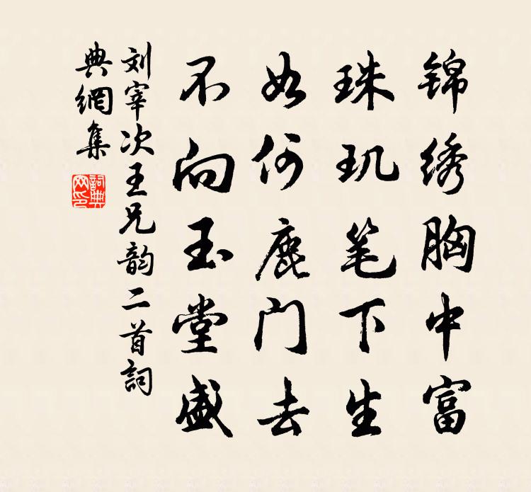 詩詞名句歷史字典書法欣賞書法字典國語詞典說文解字康熙字典古漢語字典標 題 作 者 詩 句 次王兄韻二首作者:劉宰 朝代:宋代次王兄韻二首原文錦繡胸中富,珠璣筆下生。如何鹿門去,不向玉堂盛。詩詞問答問:次王兄韻二首的作者是誰?答:劉宰問:次王兄韻二首寫於哪個朝代?答:宋代劉宰次王兄韻二首書法欣賞次王兄韻二首書法作品詩詞推薦鄭顧道招賞瑞香曾幾〔宋代〕山城底處不春風,未似留賓鄭驛中。家釀篘成玉池水,檻花移得錦薰籠。已將故事來招我,不著新詩去惱公。從此西江月馬鈺〔元代〕莫論離龍坎慮,休言赤髓黃芽。勿談搬運紫河車。不說嬰嬌女奼。絕慮忘機最妙,澄神養浩尤佳。無為無作路無差滿江紅王玠〔元代〕太極渾淪,才開口、便分仁義。把清真支離,大道已廢。世事機謀求愈遠,人情往復相牽繫。都不如、收拾早回頭【越調】柳營曲_西山即事挽張可久〔元代〕西山即事挽薛蘿,倚嗟峨,人生勝游能幾何?翠輦經過,彩筆吟喔,御墨尚岩阿。綠槐夢已南柯,蒼松老似東坡。高宗皇帝輓詞二首周必大〔宋代〕太極乾元父,清都大帝宮。宴酣忘御駿,仙去任遺弓。音遏思堯顙,旻號泣舜瞳。孤臣台閣舊,淚血灑春風。題晉祠汪藻〔宋代〕一脈泉隨天地老,悠然洗盡半生心,欲令惠及生民遠,須道仁同此水深。聖母慈靈昭住古,高題崇號重來今,登祠路中月夕登霽景台與唐英話別梅堯臣〔宋代〕風枝不動月光午,況是高台過新雨。吳客方思千里歸,不負洛陽塵與土。到時水落鱖鱸肥,香稻初炊鱠紅縷。休言次韻趙去華提乾夏日雜興七首蘇泂〔宋代〕山外情知更有山,幾多突兀共巑岏。一從夢到天壇後,轉覺丘陵不足看。賦新花竹許月卿〔宋代〕花紅竹綠兩相當,綠竹紅花在首傍。竹引花風心浪動,花含竹露面芬芳。須知竹戀花蝴蝶,喜見花貪竹鳳凰。彼此題尹真人祠郎士元〔唐代〕窅窅雲旗去不還,陰陰祠宇閉空山。我來始悟丹青妙,稽首如逢冰雪顏。淨髮釋慧開〔宋代〕鋒芒未露鬼神號,能劃群牛頂{左寧右頁}毛。四海聱頭俱按下,豈容存著一織毫。柳梢青(憶西湖)姚勉〔宋代〕長記西湖,水光山色,濃淡相宜。豐樂樓前,涌金門外,買個船兒。而今又是春時。清夢只、孤山賦詩。綠蓋芙蓉題唐興寺湘江亭張栻〔宋代〕寺廢蒼崖聳,江回遠岸明。風霜摧翰墨,歲月老絲緡。兀坐知茶味,閒行忘去程。長喔伊水句,回首右為情。一葉落朱彝尊〔清代〕淚眼注,臨當去。此時欲住已難住。下樓復上樓,樓頭風吹雨。風吹雨,草草離人語。次韻子瞻題長安王氏中隱堂五首蘇轍〔宋代〕君看原上墓,墳盡但余碑。誰見生前貴,塵生帶下龜。高堂幸有酒,一飲豈論貲。勉強行樂耳,古人良可悲。送范漕赴召八絕洪咨夔〔宋代〕走卒兒童口是碑,百年幾見好監司。浣花鏡月經行處,草木江山亦去思。秋夜雨(再和)吳潛〔宋代〕單于系頸須長索。捷書新上油幕。盡沈邊柝也,更底問、悲笳哀角。衰翁七十迎頭了,先自來、聲利都薄。歸計猶頌證道歌證道歌釋印肅〔宋代〕一月普現一切水,四處分舟同一體。多中一了一中多,莫學痴猿撈沼底。和王令尹遊園之作舒邦佐〔宋代〕官事何時了,偷忙得餉閒。清風寒食里,飛絮落花間。靈運池生草,淵明鞠見山。詩來令細讀,玉佩響珊珊。游山陽十首陳造〔宋代〕多許金釵換好辭,長巾短帊縷金泥。老來詩力知何似,細訪香羅驗舊題。名句推薦壯歲從戎,曾是氣吞殘虜。陸游《謝池春·壯歲從戎》 空山梵唄靜,水月影俱沉。納蘭性德《水調歌頭·題西山秋爽圖》 遊子乍聞征袖濕,佳人才唱翠眉低。鄭谷《鷓鴣》 長楊跨武騎,細柳接戎軒。鄭愔《奉和幸望 * 送朔方大總管張仁亶》 江南江北雪漫漫。遙知易水寒。向子諲《阮郎歸·紹興乙卯大雪行鄱陽道中》 燕子不知人去也,飛認闌乾。韓疁《浪淘沙·莫上玉樓看》 亭皋木葉下。隴首秋雲飛。柳惲《搗衣詩》 恃人不如自恃也,明於人之為己者不如己之自為也。韓非及後人《韓非子·外儲說右下》 吳台直下,緗梅無限,未放野橋香度。吳文英《永遇樂·探梅次時齋韻》 人有所優,固有所劣;人有所工,固有所拙。王充《論衡·卷二十八·書解篇》