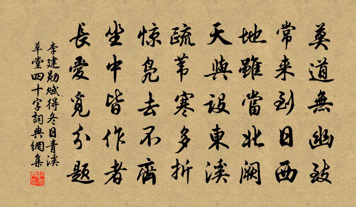 詩詞名句歷史字典書法欣賞書法字典國語詞典說文解字康熙字典古漢語字典標 題 作 者 詩 句 賦得冬日青溪草堂四十字作者:李建勛 朝代:唐代賦得冬日青溪草堂四十字原文莫道無幽致,常來到日西。地雖當北闕,天與設東溪。疏葦寒多折,驚鳧去不齊。坐中皆作者,長愛覓分題。詩詞問答問:賦得冬日青溪草堂四十字的作者是誰?答:李建勛問:賦得冬日青溪草堂四十字寫於哪個朝代?答:唐代問:賦得冬日青溪草堂四十字是什麼體裁?答:五律李建勛賦得冬日青溪草堂四十字書法欣賞賦得冬日青溪草堂四十字書法作品注釋全唐詩:卷739-23詩詞推薦詠史上廉頗藺相如陳普〔宋代〕長年霜骨白皚皚,廉藺羞顏似濕灰。白起殺心如未謝,二家隨璧獻章台。三月一日馬令送花張耒〔宋代〕未說浸陽別淚痕,江邊苹芷不勝繁。不知來歲在何處,又對新花憶故園。插帽每慚輝白髮,飛香曾伴照清尊。去年北窗睡起陸游〔宋代〕違物離人不計年,萬金難買北窗眠。高懷元在羲皇上,大事已明空劫前。樵路細盤雲外嶺,釣筒倒插水中天。此時四月十七日景靈宮奉迎仁宗皇帝御容有感歐陽修〔宋代〕行殿峨峨出綠槐,琳房芝闕聳崔嵬。管弦飄落人間去,幢節疑從天上來。基業百年傳聖子,黔黎四紀樂春台。孤臣蓬島山劉倓〔宋代〕軋軋筍輿過翠微,路經蓬島鎖雲霏。雨從半嶺岩窩出,雲在行人腳下飛。拜屺瞻墓有感馬廷鸞〔宋代〕我走金塘十五年,新年六十意悽然。扶藜策蹇趨廬下,洗盞將雛拜影前。蠹化不妨松飲露,鳳棲猶擬柏參天。微吟西山桐十詠桐根陳翥〔唐代〕吾有西山桐,密鄰桃與李。得地自行根,受芘逾高藟。上濯春雲膏,下滋醴泉髓。盤結侔循環,岐分類枝體。乘虛海會寺清心堂蘇軾〔宋代〕南郭子綦初喪我,西來達摩尚求心。此堂不說有清濁,遊客自觀隨淺深。兩歲頻為山水役,一溪長照雪霜侵。紛紛送王霖赴舉方乾〔唐代〕自古主司看薦士,明年應是不參差。須憑吉夢為先兆,必恐長才偶盛時。北闕上書沖雪早,西陵中酒趁潮遲。郄詵答權乾用命字韻見惠章甫〔宋代〕峩峩儒衣冠,昕貴知義命。大道若坦途,狂夫蹈邪徑。惟君異流俗,學古師往聖。窮居飲一瓢,輕視車千乘。粹然暮春有感歐陽修〔宋代〕幽憂無以銷,春日靜愈長。薰風入花骨,花枝午低昂。往來採花蜂,清蜜未滿房。春事已爛漫,落英漸飄揚。蛺蝶題招提院靜照堂鄭獬〔宋代〕招提去山遠,還似在山家。晚日惟歸鳥,春風自落花。空談銷劍火,醉墨灑天葩。更欲拿舟去,清溪月正華。讀秦漢間事王安石〔宋代〕秦徵天下材,入作阿房宮。宮成非一木,山谷為窮空。子羽一炬火,驪山三月紅。能令掃地盡,豈但焚人功。陪郡侯出郊勸農六絕洪咨夔〔宋代〕爭問官儂子謂誰,看來似不是農師。向人羞道閒陪涉,說與豳風七月詩。送行者妙淙往青龍謁陳七官人敖陶孫〔宋代〕三生同聽寺樓鍾,緊峭芒鞋任所從。莫向華亭覓船子,趙州橋下有青龍。詠史詩孟津胡曾〔唐代〕秋風颯颯孟津頭,立馬沙邊看水流。見說武王東渡日,戎衣曾此叱陽侯。寄題韓勉夫枝巢王洋〔宋代〕適時非履險,足分不憂貧。須信人間世,宜思物外身。榮柯堪歡蟻,飽露可憐螓。更謝東方朔,能安一老臣。柳下吟釋文珦〔宋代〕妸娜綠楊陰,深於夏屋深。居來身自在,勝與俗浮沉。坐暑堪忘箑,乘風或散襟。清閒消不盡,乞與野鶯吟。放魚 自此後詩到江州作。白居易〔唐代〕曉日提竹籃,家僮 * 蔬。青青芹蕨下,疊臥雙白魚。無聲但呀呀,以氣相煦濡。傾籃寫地上,撥剌長尺余。豈唯送春晁說之〔宋代〕雨里花開過,愁中燕到遲。一春都寂寞,不作送春詩。名句推薦欲訴奇愁無可訴,算興亡、已慣司空見。梁啓超《金縷曲·丁未五月歸國旋復東渡卻寄滬上諸君子》 春城無處不飛花,寒食東風御柳斜。韓翃《寒食 / 寒食日即事》 把酒祝東風,且莫恁、匆匆去。王安石《傷春怨·雨打江南樹》 巫峽啼猿數行淚,衡陽歸雁幾封書。高適《送李少府貶峽中王少府貶長沙》 今春香肌瘦幾分?縷頻寬三寸。王實甫《十二月過堯民歌·別情》 生有七尺之形,死唯一棺之土,唯立德揚名,可以不朽陳壽《三國志·魏書·文帝紀》 記取江湖泊船處,臥聞新雁落寒汀。陸游《夜泊水村》 忍淚不能歌,試托哀弦語晏幾道《生查子·墜雨已辭雲》 眼孔淺時無大量,心田偏處有奸謀。馮夢龍《醒世恆言·卷一》 擬把傷離情緒,待曉寒重說。納蘭性德《好事近·簾外五更風》