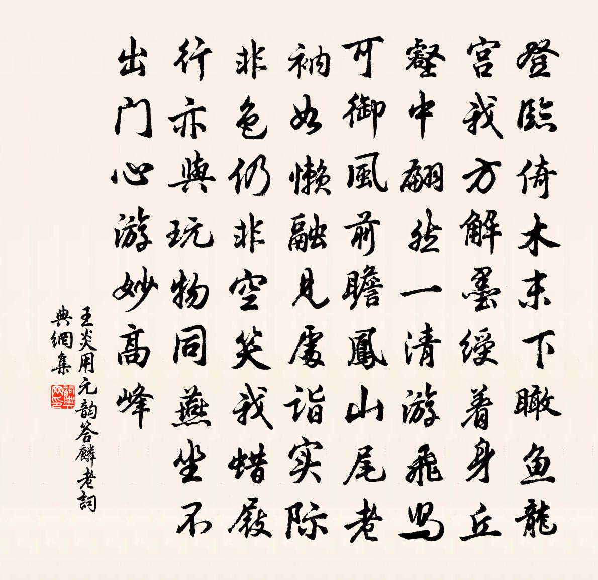 詩詞名句歷史字典書法欣賞書法字典國語詞典說文解字康熙字典古漢語字典標 題 作 者 詩 句 用元韻答麟老作者:王炎 朝代:宋代用元韻答麟老原文登臨倚木末,下瞰魚龍宮。我方解墨綬,著身丘壑中。翩然一清游,飛舄可御風。前瞻鳳山尾,老衲如懶融。見處詣實際,非色仍非空。笑我蠟屐行,亦與玩物同。燕坐不出門,心游妙高峰。詩詞問答問:用元韻答麟老的作者是誰?答:王炎問:用元韻答麟老寫於哪個朝代?答:宋代王炎用元韻答麟老書法欣賞用元韻答麟老書法作品詩詞推薦三月二十九日二首蘇軾〔宋代〕門外橘花猶的皪,牆頭荔子已斕斑。樹暗草深人靜處,捲簾攲枕臥看山。蝶戀花(和張文伯海棠)王之道〔宋代〕碧霧暗消香篆半。花影穿簾,厭浥蒼苔院。鸂鶒一雙塘水暖。浮沈時近垂楊岸。雨過不知春事晚。但怪朱唇,得酒富陽妙庭觀董雙成故宅發地得丹鼎覆以銅盤承蘇軾〔宋代〕鼎在耳二首人去山空鶴不歸,丹亡鼎在世徒悲。可憐九轉功成後,卻把飛升乞內芝。琉璃擊碎走金丹,無復神光發補樂府十篇帝宓犧氏之樂歌曹勛〔宋代〕罔兮罟兮惟田漁,時兮食兮民這須,以享以祀兮燔祭有餘。景德以後祀五方帝十六首佚名〔宋代〕坤興厚載,黃裳元吉。宅中居正,含章抱質。分王四季,其功靡秩。育此群生,首茲六律。夢江南·九曲池頭三月賀鑄〔宋代〕九曲池頭三月三,柳毿毿。香塵撲馬噴金銜,涴春衫。苦筍鰣魚鄉味美,夢江南。閶門煙水晚風恬,落歸帆。和玉汝弟甘雨應祈韓維〔宋代〕后稷明農佐有媯,恥令世有一夫飢。勤民事業能如古,閔雨精誠必應時。頓覺微涼生水際,尚思余潤浹天涯。恤人解語花(吳子云家姬,號愛菊,善歌舞,忽有朝雲之感,作此以寄。)張炎〔宋代〕行歌趁月,喚酒延秋,多買鶯鶯笑。蕊枝嬌小。渾無奈、一掬醉鄉懷抱。籌花鬥草。幾曾放、好春閒了。芳意闌,中秋月長句楊萬里〔宋代〕西山走下丹砂丸,東山飛上黃金盤。徑從碧海升青天,半濕尚帶波濤痕。初輝淡淡寒不動,月華猶輕桂華重。黃羅喜遷鶯(太蔟宮,俗名中管高宮同丁基仲過希道家看牡丹)吳文英〔宋代〕凡塵流水。正春在、絳闕瑤階十二。暖日明霞,天香盤錦,低映曉光梳洗。故苑浣花沈恨,化作妖紅斜紫。困無力偈頌一百二十三首釋普度〔宋代〕山之高,水之深,非古亦非今。老胡打失一隻履,蔥嶺那邊無處尋。松宋祁〔宋代〕冒雪虬枝密,凌空麈影勻。葉傾秦帝雨,華老宓妃塵。不見棲鸞客,多逢擊馬人。寄聲遭匠石,千尺謝輪囷。山居詩釋延壽〔宋代〕景虛情澹兩何依,抱一冥真絕萬機。松韻餘風涼竹戶,柏搖殘露濕禪衣。岩燈霧逼寒光小,石像塵昏古畫微。得趣初離山陽寄城中友人二首張耒〔宋代〕落月昏昏向水低,五更殘燭一聲雞。只應魂夢猶東去,從此扁舟日向西。雜劇·輔成王周公攝政鄭光祖〔元代〕楔子(微子一折)(駕上,宣住)(正末扮太師上,開)自家姬姓,周家嫡族,現為太師。從先考文王時,參預國至揚州文天祥〔宋代〕眼穿只候賣柴回,今日堡城門不開。糴米已無訊息至,黃昏惆悵下山來。自諸暨抵剡潘閬〔宋代〕秋渚涵空碧,秋山刷眼青。排頭煙樹老,撲面水風醒。上瀨復下瀨,長亭仍短亭。夜船明月好,客夢滿流螢。芹齋詩林光宗〔宋代〕春風芹下足遲留,白鳥平田憶舊遊。閱盡軒裳還過眼,讀殘書卷復於頭。偶逢隱几何須問,不到投簪便擬休。平世晝寢夢一客相過若有舊者夷粹可愛既覺作絕句陸游〔宋代〕夢中何許得嘉賓,對影胡床岸幅巾。石鼎烹茶火煨栗,主人坦率客情真。送三姊之鄂州張耒〔宋代〕兄弟分飛各一方,來老分袂苦多傷。兩行別淚江湖遠,五月徵車岐路長。休嘆伯鸞甘寂寞,所欣楊惲好文章。北歸名句推薦莫等閒,白了少年頭,空悲切!岳飛《滿江紅·寫懷》 極陽以殺,極陰以生佚名《黃帝四經·經法·四度》 靡靡秋已夕,淒淒風露交。陶淵明《己酉歲九月九日》 父耕原上田,子劚山下荒。聶夷中《田家》 是以聖人不期修古,不法常可,論世之事,因為之備。韓非及後人《韓非子·五蠹》 勿自暴,勿自棄。聖與賢,可馴致。李毓秀《弟子規·餘力學文》 流年莫虛擲,華發不相容。方乾《送從兄郜 / 韋郜 / 途中別孫璐》 最無端處,總把良宵,只恁孤眠卻。柳永《尾犯·夜雨滴空階》 仁不異遠,義不辭難班固《漢書·紀·武帝紀》 兩行疏柳,一絲殘照,萬點鴉棲。劉基《眼兒媚·秋思》