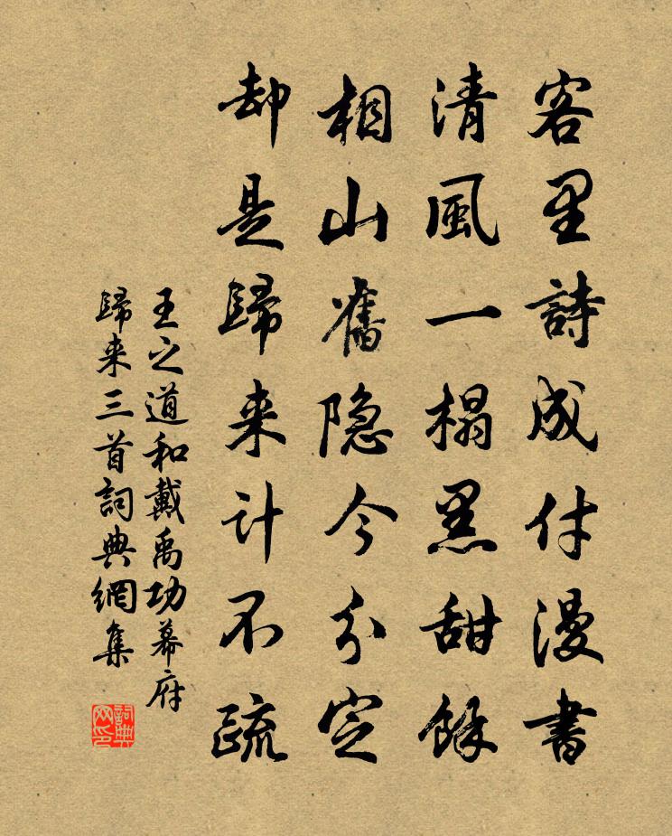 詩詞名句歷史字典書法欣賞書法字典國語詞典說文解字康熙字典古漢語字典標 題 作 者 詩 句 和戴禹功幕府歸來三首作者:王之道 朝代:宋代和戴禹功幕府歸來三首原文客里詩成付漫書,清風一榻黑甜余。相山舊隱今分定,卻是歸來計不疏。詩詞問答問:和戴禹功幕府歸來三首的作者是誰?答:王之道問:和戴禹功幕府歸來三首寫於哪個朝代?答:宋代王之道和戴禹功幕府歸來三首書法欣賞和戴禹功幕府歸來三首書法作品詩詞推薦明發戈陽縣楊萬里〔宋代〕燈市通宵沸,朝來解一空。梅邊霜似雪,霧外日如虹。句妙元非作,代窮未必工。忽驚家已遠,身在大江東。詠史上蘇武陳普〔宋代〕伏匿窮廬煖意回,子卿一夜夢陽台。歸來不與曾孫議,未必麒麟生面開。前漢門薛公周曇〔唐代〕黥布稱兵孰敢當,薛公三計為斟量。上中良策知非用,南取長沙是死鄉。喜葉謙夫歸薛師石〔宋代〕老思忽蕭爽,親朋得意歸。菊觴奉親壽,柳色上儒衣。宅旺看山勢,門清有釣磯。我來聊問字,澹坐月侵扉。題丹桂畫扇賜從臣宋高宗〔宋代〕月宮移就日宮栽,引得輕紅入面來。好向煙霄承雨露,丹心一一為君開。夏至日衡陽郡齋書懷令狐楚〔唐代〕一來江城守,七見江月圓。齒髮將六十,鄉關越三千。褰帷罕游觀,閉閤多沉眠。新節還復至,故交盡相捐。何時野興陸游〔宋代〕涉澗穿林信意行,翠崖朱棧愜幽情。關關幽鳥將雛語,簌簌幽皇解籜聲。藉草一壺消永日,出門幾屐了平生。川雲江行四首陳造〔宋代〕帆桅飛去東空明,人倚東風兩翼生。世事快人如此否,日斜三百不留行。傳神悅躬上人陳舜俞〔宋代〕倦轡曾投林下宿,短篷重見越江邊。人歸河嶽儀型在,事隔桑溟特色傳。弟子共談庭際柏,公卿多識社中蓮。高風次韻茂恭見寄喻良能〔宋代〕中書一揮千萬言,有如水懸呂梁間。奔逸絕塵不可及,蹇欲從之良獨難。如君文字可 * ,胡為猶在南湖側。樊川過嚴關有感李師中〔宋代〕四年嶺外得生還,自顧無功但愧顏。欲識群恩至深處,嚴關便是玉門關。人愛九日多以靖節之故仆以邠老七字為可以益趙蕃〔宋代〕東籬滿把菊,柯山一句詩。四時皆有節,九日獨如斯。潘子夙所尚,陶翁何敢師。是故逢此日,愛慕仍淒悲。所願送毛君致仕還鄉蘇轍〔宋代〕古人避世事,豈問家有無。但言鴻鵠性,不受樊籠拘。公家昔盛時,阡陌連三衢。食廩濟寒餓,婚嫁營羈孤。千金詩一首張斗南〔宋代〕辭得官來性又便,恰如病馬解韁牽。雖無白日三聲喏,贏得清宵一枕眠。秋懷汪炎昶〔宋代〕白露洗空河漢浹,耳目瑩淨無牽埃。秋聲溢出潤谷外,野色迸入軒窗來。多感間吟亦淒婉,自謀和策常迂迴。傲然游西湖五首滕岑〔宋代〕林君廬不存已久,蘇公堤比舊尤佳。絕憐夾堤柳漸暗,誰見傍廬梅正花。和思老夏日山居鄭剛中〔宋代〕世俗佛如湯,公於靜處藏。忘機身不老,無事日偏長。地僻松篁密,僧疏殿閣涼。何須有妻子,涕泣似王章。城南縣尉水亭得長字蘇軾〔宋代〕兩尉郁相望,東西百步場。插旗蒲柳市,伐鼓水雲鄉。已作觀魚檻,仍開射鴨堂。瀲瀲波頭細,疏疏雨腳長。全家鮮于大任自東南歸唐安遺予張安國所作水調歌晁公溯〔宋代〕去蜀游東吳,舉頭望赤霄。君之門九重,觚稜郁岧嶢。是中盛文物,簪筆立漢朝。規摹覺地雄,氣象知天高。計其句王琪〔宋代〕楓迷楚客傷春野,山晦荊王夢雨天。名句推薦有梅無雪不精神,有雪無詩俗了人。盧梅坡《雪梅·其二》 涼風起天末,君子意如何。杜甫《天末懷李白》 聖人不貴尺之壁,而重寸之陰劉安及其門客《淮南子·原道訓》 逐流牽荇葉,緣岸摘蘆苗。儲光羲《江南曲四首》 但得一片橘皮吃,莫便忘了洞庭湖。施耐庵《水滸傳·第二十四回》 晴雲輕漾,薰風無浪,開樽避暑爭相向。薛昂夫《西湖雜詠·夏》 江上往來人,但愛鱸魚美范仲淹《江上漁者》 風含翠篠娟娟淨,雨裛紅蕖冉冉香。杜甫《狂夫》 彼說長,此說短。不關己,莫閒管。李毓秀《弟子規·信》 塞上長城空自許,鏡中衰鬢已先斑。陸游《書憤五首·其一》