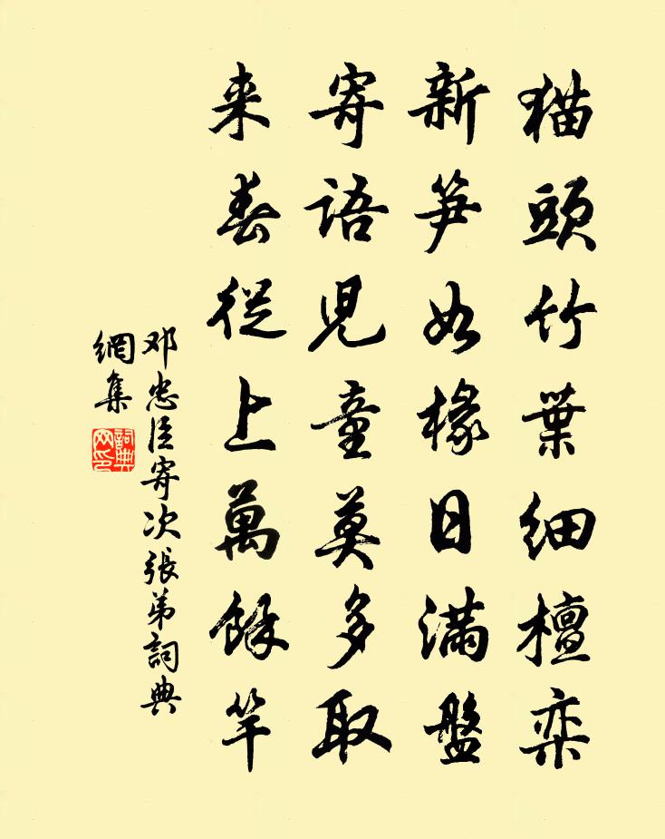 詩詞名句歷史字典書法欣賞書法字典國語詞典說文解字康熙字典古漢語字典標 題 作 者 詩 句 寄次張弟作者:鄧忠臣 朝代:宋代寄次張弟原文貓頭竹葉細檀欒,新筍如椽日滿盤。寄語兒童莫多取,來春從上萬餘竿。詩詞問答問:寄次張弟的作者是誰?答:鄧忠臣問:寄次張弟寫於哪個朝代?答:宋代鄧忠臣寄次張弟書法欣賞寄次張弟書法作品詩詞推薦酹江月(丙午螺川)趙師俠〔宋代〕飄流蹤跡,趁春來、還趁春光歸去。九十韶華能幾許,著意留他不住。趲柳催花,催紅長翠,多少風和雨。蜂閒蝶春步岳園二首董嗣杲〔宋代〕將軍墓域在杭州,如此家園入夢遊。誰惜再傳無嗣續,至今匙鑰屬官收。兩鄰家一主人郡姬歌飲至夜半一母妻哭官檢魘方回〔宋代〕歌喉弦指粉紅腮,群擁山翁醉玉頹。政恐真歡猶是假,不如鄰婦哭真哀。罷都統守鎮滑州作王鐸〔唐代〕用軍何事敢遷延,恩重才輕分使然。黜詔已聞來闕下,檄書猶未遍軍前。腰間盡解蘇秦印,波上虛迎范蠡船。正會贈趙秀才陳造〔宋代〕袞袞紅塵去,扁舟得挽回。半生障日手,一笑沃愁杯。應俗吾衰矣,論文子壯哉。明年日邊信,滿冀好懷開。羊權山黃甲〔宋代〕聞道仙人萼綠華,曾來此地訪仙家。青衣數十隨行處,環佩紛紛香霧車。千仙謠吳龍翰〔宋代〕衣縹緲,佩丁東。金莖滴香露,玉樹生涼風。衝破青冥跨黃鶴,身披星斗珍珠絡。春夜樊川竹亭陪諸同年宴項斯〔唐代〕相知皆是舊,每恨獨游頻。幸此同芳夕,寧辭倒醉身。燈光遙映燭,萼粉暗飄茵。明月分歸騎,重來更幾春。偈頌二十五首釋道璨〔宋代〕仰山撼樹,溈山良久。說體說用,互揚家醜。見雪馮時行〔宋代〕前日揮輕扇,今日御重衣。重衣御則已,仍驚朝雪飛。數峰起天末,練練生光輝。有如老大臣,正色立玉墀。風自翻經台董嗣杲〔宋代〕過門跬步入香林,七葉遺陰地尚靈。曾借東山康樂手,共翻北本湼槃經。闌腰葉擁空台赤,石罅泉通遠筧青。雲掩哀扇工歌沈作喆〔宋代〕某州竹扇名字著,織扇供官困追捕。使君開府未浹旬,欲戴綸巾揮白羽。新模巧制旋剪裁,百中無一中程度。犀革寄父王氏〔宋代〕西風不入小窗紗,秋氣應鄰我憶家。極目江南千里恨,依然如淚看黃花。北風趙蕃〔宋代〕北風故應陰,南風還當晴。占風更占雨,巢穴寄吾生。寄陳掌書兼簡閬朋先生釋雲岫〔宋代〕道士家邊夫子宅,靈龜山裹錦雲阿。燒丹果會成仙去,應笑儒冠誤已多。臨江仙山主〔元代〕得暇閒窗尋思慮,古今多少興衰。閒縈都寫色並財。寰中幾個,識破早歸來。好向白雲溪畔坐,逍遙坦蕩眉開。清柳集亡食蝦蟆詩因有作晁說之〔宋代〕我讀柳侯詩,不見蝦蟆篇。所亡諒非一,撫卷為慨然。不應流落人,吟詠亦不前。問爾胸中奇,何以能棄捐。湯湯三日侍華光殿曲水宴代人應詔詩 六謝朓〔南北朝〕文教已肅。武節即馳。榮光可照。合璧如規。載懷姑射。尚想瑤池。濯龍乃飾。天淵在斯。登慈恩塔范智聞〔宋代〕獨上慈恩塔,疏懷亦慨然。異朝多少事,不改舊山川。柳枝詞十三首司馬光〔宋代〕依依高村出宮牆,搖曳青絲百尺長。願與宣溫萬年樹,年年歲歲奉君王。名句推薦遺廟丹青落,空山草木長。杜甫《武侯廟》 輕解羅裳,獨上蘭舟。李清照《一剪梅·紅藕香殘玉簟秋》 去年燕子天涯,今年燕子誰家?張炎《清平樂·采芳人杳》 林斷山明竹隱牆。亂蟬衰草小池塘。蘇軾《鷓鴣天·林斷山明竹隱牆》 清風徐來,水波不興。蘇軾《前赤壁賦》 嘆息老來交舊盡,睡來誰共午甌茶。陸游《幽居初夏》 覆巢之下,復有完卵劉義慶《世說新語·言語》 莫道讒言如浪深,莫言遷客似沙沉。劉禹錫《浪淘沙九首》 我當二十不得意,一心愁謝如枯蘭。李賀《開愁歌》 及時當勉勵,歲月不待人。陶淵明《雜詩·人生無根蒂》