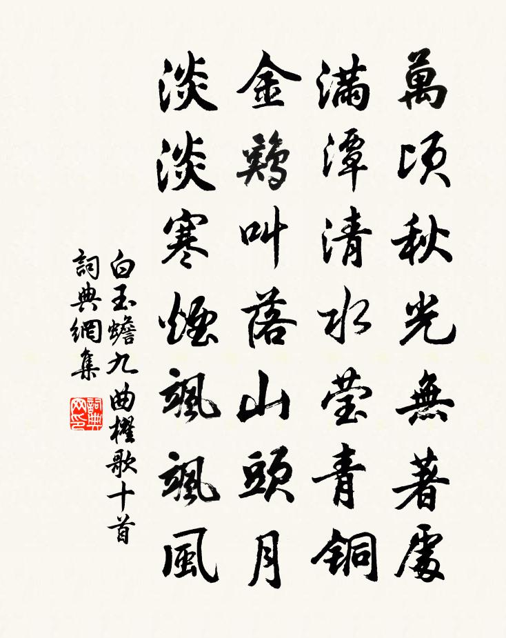 詩詞名句歷史字典書法欣賞書法字典國語詞典說文解字康熙字典古漢語字典標 題 作 者 詩 句 九曲櫂歌十首作者:白玉蟾 朝代:宋代九曲櫂歌十首原文萬頃秋光無著處,滿潭清水瑩青銅。金雞叫落山頭月,淡淡寒煙颯颯風。詩詞問答問:九曲櫂歌十首的作者是誰?答:白玉蟾問:九曲櫂歌十首寫於哪個朝代?答:宋代問:九曲櫂歌十首是什麼體裁?答:樂府白玉蟾九曲櫂歌十首書法欣賞九曲櫂歌十首書法作品詩詞推薦明月曲白玉蟾〔宋代〕月色一何明,不堪顧孤影。倚樓暮風寒,舉手挈衣領。行雲若相憐,徘徊西風頂。強飲不成醉,幽情默自省。莫道和劉後村梅花百詠方蒙仲〔宋代〕玉英瑤圃美人家,寶璐瓊芳興絕佳。此是梅花真實相,誰雲騷不品梅花。海口三首劉克莊〔宋代〕暫游不得久婆娑,柰此龍江景物何。天勢去隨帆際盡,海聲來傍枕邊多。昏窗微見燈明嶼,霽閣遙看日浴波。定有送王推官宰上洛先歸關中梅堯臣〔宋代〕跨馬獨歸日,春風隨度關。客裘將欲綻,社燕亦同還。洛水源邊邑,秦人隱處山。君家有鳧舄,切莫向雲間。留別傅安道韓元吉〔宋代〕華發相看四十年,飽諳世事欲忘言。一春離別當寒食,再歲追隨作上元。湖外溪山明小檻,雨余花柳暗西園。極知題江君天澤古修堂三首方回〔宋代〕大虛空重片光懸,何異初開混沌天。能辦辛勤磨玉斧,不愁缺月不團圓。紀夢家鉉翁〔宋代〕天風吹我上瑤京,謁帝通明羽衛森。班退歸來清夢覺,紅雲猶自滿衣襟。裴晉公書堂黃庭堅〔宋代〕裴公入相便論兵,躍馬淮西一戰平。黃合不須金印好,卻來山下作書生。從范至能參政游石湖精舍坐間走筆二首楊萬里〔宋代〕震澤分波入,垂虹隔水看。何須小風起,生怕牡丹寒。政坐諸峰好,端令落筆難。催人理歸棹,落日許無端。將睡四首楊萬里〔宋代〕睡去非不願,熱來無奈何。蒙渠致西爽,為汝守南柯。句錢某〔宋代〕倏忽經狼尾,迴旋過虎頭。相看逢白狗,猶自見黃牛。已亥雜詩 33龔自珍〔清代〕少慕顏曾管樂非,胸中海岳夢中飛。近來不信長安隘,城曲深藏此布衣。寄謝景英丈趙蕃〔宋代〕先生豈是有監州,高興應為雁盪游。康樂當年空想望,雲孫今日慰淹留。幽人衲子應多識,妙偈多章可寄不。兜率吳府君輓詩魏了翁〔宋代〕篤信寧違俗,徐行不競時。與人交樂易,處世事平夷。甚矣古常者,傷哉今已而。龍山春夜月,長照鳳皇枝。鳳棲梧(丁宅二侍兒·五之五)張綱〔宋代〕緩帶垂紅雙侍女。彩鳳銜來,秀色生庭戶。轉蕙光風香暗度。回眸綽約神仙侶。寡和清歌聲激楚。夜飲厭厭,勸我春日書事五首韓元吉〔宋代〕憶上金華第一峰,相君官重酒樽同。夢尋絕壑誰重到,零落山桃小院風。句戴復古前〔宋代〕機番白薴和愁織,門掩黃花帶恨吟。寄陶茂安監丞陸游〔宋代〕永州太守鬢毛殘,矍鑠猶能起據鞍。徵土雖思賦松菊,隱居未可掛衣冠。功名夢境元非實,歌舞山城且自寬。也勝送彭秀才南遊徐鉉〔唐代〕問君孤棹去何之,玉笥春風楚水西。山上斷雲分翠靄,林間晴雪入澄溪。琴心酒趣神相會,道士仙童手共攜。他日再贈束孝先王令〔宋代〕玉缺見不撓,劍折佑真剛。張目不見心,人固未易量。念我未知子,徒知外觀望。安識子所懷,赤日包白光。去去名句推薦雁過也,正傷心,卻是舊時相識。李清照《聲聲慢·尋尋覓覓》 玉屏風冷愁人。醉爛漫、梅花翠雲。吳文英《柳梢青·與龜翁登研意觀雪懷癸卯歲臘朝斷橋並馬之游》 江東子弟多才俊,捲土重來未可知。杜牧《題烏江亭》 斜陽草樹,尋常巷陌,人道寄奴曾住。辛棄疾《永遇樂·京口北固亭懷古》 採蓮南塘秋,蓮花過人頭。佚名《西洲曲》 十年重見,依舊秀色照清眸。王以寧《水調歌頭·呈漢陽使君》 紅板橋空,濺裙人去,依舊曉風殘月。納蘭性德《淡黃柳·詠柳》 辛苦遭逢起一經,干戈寥落四周星。文天祥《過零丁洋》 近者不親,無務求遠墨子《墨子·02章 修身》 非知之難,行之為難;非行之難,終之斯難。吳兢《貞觀政要·卷十·論慎終》
