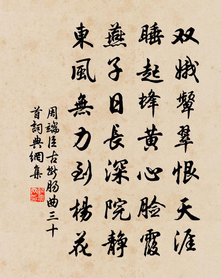 詩詞名句歷史字典書法欣賞書法字典國語詞典說文解字康熙字典古漢語字典標 題 作 者 詩 句 古斷腸曲三十首作者:周端臣 朝代:宋代古斷腸曲三十首原文雙娥顰翠恨天涯,睡起蜂黃心臉霞。燕子日長深院靜,東風無力到楊花。詩詞問答問:古斷腸曲三十首的作者是誰?答:周端臣問:古斷腸曲三十首寫於哪個朝代?答:宋代周端臣古斷腸曲三十首書法欣賞古斷腸曲三十首書法作品詩詞推薦句陶弼〔宋代〕昨夜書中得新記,夢魂飛入鏌鋣關。失調名佚名〔宋代〕便直饒、鐵作心腸,也須是淚滴。客信豐寄劉起潛鄧有功〔宋代〕嶺南咫尺莫如虔,和暖嚴寒別有天。一夜詩魂清到骨,曉霜封卻釣魚船。月夜江行權德輿〔唐代〕扣船不得寐,浩露清衣襟。彌傷孤舟夜,遠結萬里心。幽興惜瑤草,素懷寄鳴琴。三奏月初上,寂寞寒江深。柳梢青(乙丑自壽)郭應祥〔宋代〕遁齋居士。今年今日,又添一歲。鬢雪心灰,十分老懶,十分憔悴。休言富貴長年,那個是、生涯活計。茗飲一甌送盧判官南湖劉長卿〔唐代〕漾舟仍載酒,愧爾意相寬。草色南湖綠,松聲小署寒。水禽前後起,花嶼往來看。已作滄洲調,無心戀一官。次韻女淑壽兄詩陳著〔宋代〕道韞生來亦謝芝,解吟今有壽兄時。著行布字銀鉤細,鎔意成辭金薤垂。義氣流行親手足,笑風吹到老鬚眉。自家南歌子趙子發〔宋代〕人有紉蘭佩,雲無出岫心。扁舟來入碧濤深。坐見楚咻、兒女變齊音。但醉雙瓶玉,從渠六印金。此時何處可幽尋仙人隱跡吳洞明〔宋代〕長生玄牝門,目擊而道存。班班實可考,老澗生雲根。初夏遇休日園中閒賦陸游〔宋代〕青山圍女牆,細草滿球場。虛檐搖水影,曲檻吹苹香。房櫳寂無人,雙燕說曉涼。賜休無公事,蕭散寄一床。久苦側犯袁去華〔宋代〕篆銷余馥,燭堆殘蠟房櫳曉。寒峭。看杏臉羞紅、尚嬌小。游蜂靜院落,綠水搖池沼。閒繞。翠樹底、支頤聽啼鳥仙遊潭五首馬融石室蘇轍〔宋代〕扶風貴公子,早歲伴山家。吹笛墮秋葉,讀書隨曉鴉。業成心自叛,學苦我長嗟。石室非人住,窮山雪似沙。招友人鳳山觀雪姚勉〔宋代〕霜風才辦兩朝晴,怪聽敲窗又雨聲。一夜忽生虛室白,六花已與短檐平。酒斟銷帳真成俗,興盡扁舟且未清。想得次韻信守李秬二首二晁補之〔宋代〕愛山何必俟歸山,簿領忙時撥置看。閶闔自應行發軔,珊瑚終未拂垂竿。樽中屢許陪文舉,廡下猶堪寄伯鸞。便作友人山亭殷遙〔唐代〕故人雖薄宦,往往涉清溪。鑿牖對山月,褰裳拂澗霓。游魚逆水上,宿鳥向風棲。一見桃花發,能令秦漢迷。台上(得涼字)杜甫〔唐代〕改席台能迥,留門月復光。雲行遺暑濕,山谷進風涼。老去一杯足,誰憐屢舞長。何須把官燭,似惱鬢毛蒼。自若耶溪舟行杭鏡湖而歸陸游〔宋代〕換馬亭前煙火微,鬥牛橋畔行人稀。雲山慘澹少顏色,霜日青薄無光輝。新酒篘成桑正落,美人信斷雁空歸。高樓韓子溫母秦國太夫人輓詩蔡戡〔宋代〕八座太夫人,疏封大國秦。酇侯仍有子,陶母不憂貧。四紀恩光渥,三朝錫賚頻。哀榮極終始,當代更誰倫。劉忠定書簡帖贊岳珂〔宋代〕公心如鐵,萬仞壁立。聲名百年,翰墨十襲。絕景獨睨,奔塵莫及。曰誰為之,目不妄入。和重陽錫宴御製詩魏謨〔唐代〕四方無事去,宸豫杪秋來。八水寒光起,千山霽色開。名句推薦人有不及,可以情恕。房玄齡《晉書·列傳·第六章》 明月黃河夜,寒沙似戰場。李流芳《黃河夜泊》 銀鞍照白馬,颯沓如流星。李白《俠客行》 漢寢唐陵無麥飯,山溪野徑有梨花。趙鼎《寒食》 春陽如昨日,碧樹鳴黃鸝。李白《秋思》 鬢髮已甘塵路白,菊花猶送塞垣黃。齊之鸞《九日登清水營城》 鳥下綠蕪秦苑夕,蟬鳴黃葉漢宮秋。許渾《鹹陽城東樓 / 鹹陽城西樓晚眺 / 西門》 已覺逝川傷別念,復看津樹隱離舟。王勃《秋江送別二首》 扁舟去作江南客,旅雁孤雲。朱敦儒《採桑子·彭浪磯》 人不見,春在綠蕪中。祖可《小重山·誰向江頭遺恨濃》