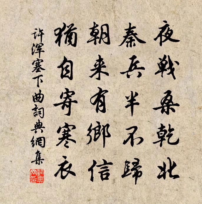 “夜戰桑乾北,秦兵半不歸。”前兩句僅用十個字描寫了發生在桑乾河北的夜戰。這次夜戰的結果,使得半數左右的戰士再沒有回來。這種情形是戰爭年代很普通、也很真實的悲劇。此詩僅用純客觀的敘事,真實地反映一場戰爭。表面看來,作者對此戰爭未附以感 * 彩,但從他描寫戰爭造成的慘重傷亡看,他是十分同情在戰爭中犧牲的戰士,是不贊成這場戰爭的。另外,詩人說的是桑乾河“北”而非“南”。倘若是在河的南岸作戰,那主要是防守;如今卻打到了河的北岸,那就是主動方了。主動出擊而被打敗,其責任在於攻方的決策者、指揮者。這便給與了上層統治者無聲的批評。由於作者許渾生活在中唐時代,唐朝已日益走下坡路,邊塞詩多染上了時代的感傷情緒。此詩基調是淒婉、哀傷的。唐代詩人寫邊塞戰爭,一般習慣於以“漢”代“唐”,但許渾在這裡用了“秦”,主要原因是考慮到用“漢”在音律方面犯了“孤平”。從另一方面,將唐王朝比做“暴秦”,或許也折射出對統治者的不滿。