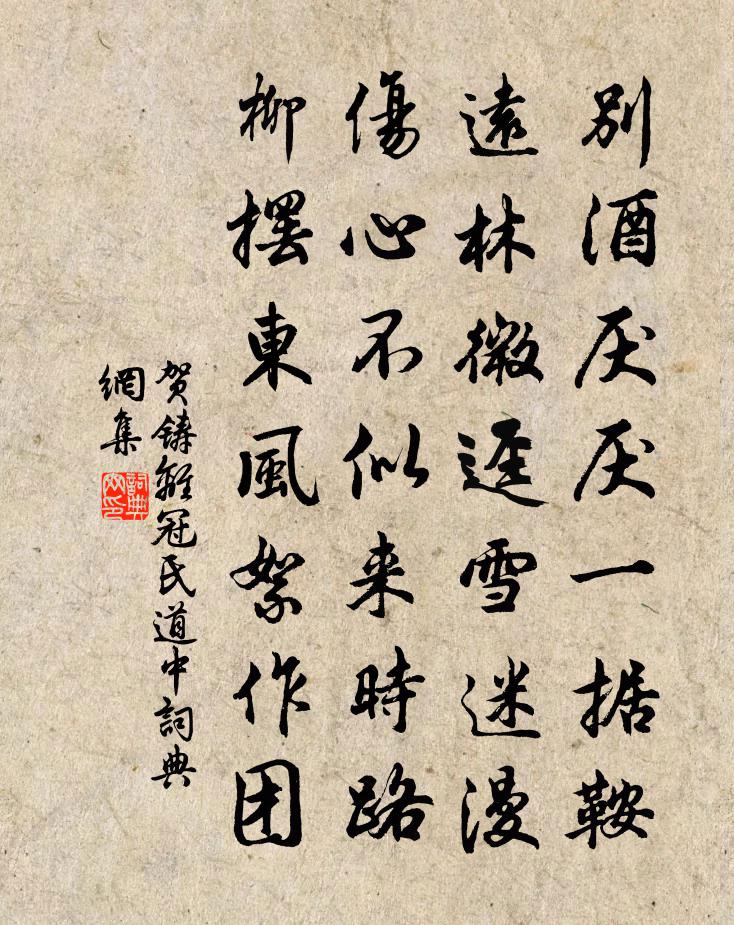 別酒厭厭一據鞍,遠林微逕雪迷漫。傷心不似來時路,柳擺東風絮作團。