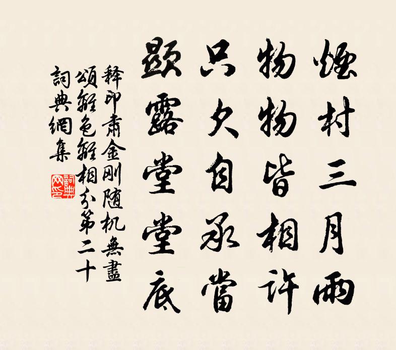 詩詞名句歷史字典書法欣賞書法字典國語詞典說文解字康熙字典古漢語字典標 題 作 者 詩 句 金剛隨機無盡頌離色離相分第二十作者:釋印肅 朝代:宋代原文煙村三月雨,物物皆相許。只欠自承當,顯露堂堂底。詩詞問答問:《金剛隨機無盡頌離色離相分第二十》的作者是誰?答:釋印肅問:該詩寫於哪個朝代?答:宋代書法欣賞金剛隨機無盡頌離色離相分第二十書法作品詩詞推薦孤凝白玉蟾〔宋代〕筠皮月靜鋪金屑,仙掌雲寒砌玉花。人在華胥初夢斷,亂山滿目一聲鴉。茅屋陽枋〔宋代〕情契居連屋,炊齋霤合煙,放懷行共出,得語坐相傳,竹哀悼雲深,蘆窗月半穿。桃源今得趣,堪賦擬前賢。題耕織圖二十四首奉懿旨撰趙孟頫〔元代〕大家饒米麵,何啻百室盈。縱復人力多,舂磨常不停。激水轉大輪,磑碾亦易成。古人有機智,用之可厚生。朝出鄴城懷古孟雲卿〔唐代〕朝發淇水南,將尋北燕路。魏家舊城闕,寥落無人住。伊昔天地屯,曹公獨中據。群臣將北面,白日忽西暮。三台次韻答應德茂雪後遠寄戴表元〔宋代〕山中不來久,何處度殘年。人悶如中酒,村荒似禁菸。將茶冰箸煮,移枕雪蓬眠。更肯狂歌否,春風雙玉船。五泄山三學院十題石鼓釋鹹潤〔宋代〕巨石平如掌,天然狀鼙鼓。擊之還有聲,分明含太古。寄僧寓題徐夤〔唐代〕佛頂抄經憶惠休,眾人皆謂我悠悠。浮生真箇醉中夢,閒事莫添身外愁。百歲付於花暗落,四時隨卻水奔流。安眠宿山館儲嗣宗〔唐代〕寂寞對衰草,地涼凝露華。蟬鳴月中樹,風落客前花。山館無宿伴,秋琴初別家。自憐千萬里,筆硯寄生涯。代放歌行鮑照〔南北朝〕蓼蟲避葵堇,習苦不言非。小人自齷齪,安知曠士懷。雞鳴洛城裡,禁門平旦開。冠蓋縱橫至,車騎四方來。素帶鷓鴣天郭應祥〔宋代〕依約灘聲雜櫓聲。波光隱映月華明。眼前好景真無盡,身外浮名盡可輕。窮勝賞,續歡盟。直饒風雨也須晴。滿頭追和元微之春餘遺興示王覺民王之道〔宋代〕物態有榮悴,時令互消長。墮身名利場,魚鳥在羅綱,豈無金屈卮,聽此石方鄉。殘花日晴陰,落絮風下上。春事月岩齋詩李廌〔宋代〕南山蠶之北,北蠶山之南蠶。環岡繞嶺,紫翠相參。奔騰蹲蹴,萬里{左馬右軍}驂。丘衍沃若,靈秀所涵。平巒夏日陸游〔宋代〕柴扉晝掩竹林幽,坐使炎天變素秋。扇月團團似初滿,簟波細細欲平流。朋儕零落關河阻,疾病沉綿歲月遒。賴有頌證道歌證道歌釋印肅〔宋代〕三毒水泡虛出沒,將無作有埋深窟。洛浦曾將喻色身,誰人解語依靈物。游南山寺題澹軒王炎〔宋代〕雲根露奇怪,上有青蓮宮。軒窗極淨麗,疑人縣壺中。憑檻俯寒流,披襟納清風。跏趺坐少定,滯念冰雪融。人生偈頌二十五首釋如淨〔宋代〕天童鐵臭老拳頭,打殺江湖水牯牛。夜深忽然生個卵,天明推出大日頭。曬{左日右良}諸人烝濕處,免教行步滑早起二首張耒〔宋代〕滄江 * 雨翻盆,將曉風聲戰亂雲。籬下寒雞鳴曉苦,老人先起自開門。張郎中籍遠寄長句開緘之日已及新秋因舉目前仰酬高韻劉禹錫〔唐代〕南宮詞客寄新篇,清似湘靈促柱弦。京邑舊遊勞夢想,歷陽秋色正澄鮮。雲銜日腳成山雨,風駕潮頭入渚田。對此鄭北山之元孫扁其樓王適莊為書北山之英四字金履祥〔宋代〕吉甫作頌,勉爾聞孫。鄭公是似,北山之英。岑使君牧襄陽受代還朝某同趙德麟謝公定潘仲李廌〔宋代〕閭閻無居人,傾城餞賢守。擁車不得前,遮拜奉卮酒。民言荷恩勤,拊育踰父母。公不鄙我邦,端能再來不。名句推薦權勢之徒,雖至親亦作威福,豈知煙雲過眼,已立見其消亡王永彬《圍爐夜話·第二二則》 故園東望路漫漫,雙袖龍鍾淚不乾。岑參《逢入京使》 水漲魚天拍柳橋。雲鳩拖雨過江皋。周邦彥《浣溪沙·水漲魚天拍柳橋》 簫鼓追隨春社近,衣冠簡樸古風存。陸游《游山西村》 芰荷迭映蔚,蒲稗相因依。謝靈運《石壁精舍還湖中作》 故園書動經年絕,華發春唯滿鏡生。崔塗《春夕》 譬猶練絲,染之藍則青,染之丹則赤。王充《論衡·卷二·率性篇》 傷心闊別三千里,屈指思量四五年。韓偓《寒食日重遊李氏園亭有懷》 寒燈思舊事,斷雁警愁眠。杜牧《旅宿》 造物無言卻有情,每於寒盡覺春生。張維屏《新雷》