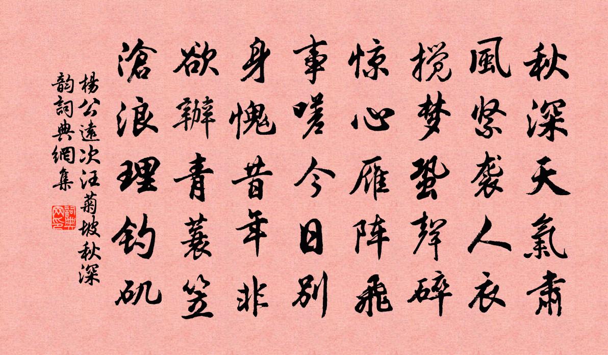 詩詞名句歷史字典書法欣賞書法字典國語詞典說文解字康熙字典古漢語字典標 題 作 者 詩 句 次汪菊坡秋深韻作者:楊公遠 朝代:宋代次汪菊坡秋深韻原文秋深天氣肅,風緊襲人衣。攪夢蛩聲碎,驚心雁陣飛。事嗟今日別,身愧昔年非。欲辦青蓑笠,滄浪理釣磯。詩詞問答問:次汪菊坡秋深韻的作者是誰?答:楊公遠問:次汪菊坡秋深韻寫於哪個朝代?答:宋代楊公遠次汪菊坡秋深韻書法欣賞次汪菊坡秋深韻書法作品詩詞推薦相思曲戴叔倫〔唐代〕高樓重重閉明月,腸斷仙郎隔年別。紫蕭橫笛寂無聲,獨向瑤窗坐愁絕。魚沈雁杳天涯路,始信人間別離苦。恨滿小室陸游〔宋代〕窗幾窮幽致,圖書發古香。尺池魚鱍鱍,拳石樹蒼蒼。老去身猶健,秋來日自長。養生吾豈解,嬾或似嵇康。酬樂天寄蘄州簟元稹〔唐代〕蘄簟未經春,君先拭翠筠。知為熱時物,預與瘴中人。碾玉連心潤,編牙小片珍。霜凝青汗簡,冰透碧游鱗。水魄送張鬷嘏李覯〔宋代〕人意皆懷土,嗟君無故園。欲行須盡室,此去又他門。靜里文章好,貧來節行存。振淹知有日,倚伏豈虛言。題汪水雲詩卷黃居仁〔宋代〕馬上琵琶不復琴,龍荒弔古獨遺音。西風金掌吹清淚,落日銅駝折寸心。杜子但傷鵑血化,蘇卿豈料雁書沉。當時西明寺威公盆池新稻唐彥謙〔唐代〕為笑江南種稻時,露蟬鳴後雨霏霏。蓮盆積潤分畦小,藻井垂陰擢秀稀。得地又生金象界,結根仍對水田衣。支公濠上宋祁〔宋代〕惠非蒙叟叟非魚,濠上全知魚樂無。春水未深魚易樂,要須真樂是江湖。在伯用銅字韻作詩複次韻二首趙蕃〔宋代〕凍筆題詩我故窮,憐君嗜好有同風。政如之越資章甫,何異當冰語夏蟲。既欲紛紛視兒子,可須袞袞羨諸公。雖然夜熱趙孟堅〔宋代〕夜熱寢復起,獨行池上亭。欹荷傾泫露,高柳掛疏星。秋蛩已啼草,咽魚時唼萍。無雲那有雨,湛湛一天青。次分宜趙文〔宋代〕分得宜春地,東偏一畫屏。洪陽仙洞古,龍姥故祠靈。雨過溪痕長,春回草意青。道傍聊下馬,剔蘚讀碑銘。荻蒲蘇軾〔宋代〕雨折霜乾不耐秋,白花黃葉使人愁。月明小艇湖邊宿,便是江南鸚鵡洲。紹興祀太社太稷十七首佚名〔宋代〕[姑洗為徽]彀資土養,民賴彀生。功利之博,莫之興京。式嚴祠壇,因物薦誠。禮具樂奏,惟神顧歆。答友人勸酒吟邵雍〔宋代〕人人誰不願封侯,及至封侯未肯休。大得卻須防大失,多憂元只為多求。規模焉敢比才士,度量自知非飲流。少日高宗皇帝輓詞五首陳居仁〔宋代〕聖略如天大,仁心亘古無。神兵勝淝水,鳴劍罷伊吾。宵旰逾三紀,歌謠遍八區。耆龐聽遺誥,號絕更嗟呼。鶴李嶠〔唐代〕黃鶴遠聯翩,從鸞下紫煙。翱翔一萬里,來去幾千年。已憩青田側,時游丹禁前。莫言空警露,猶冀一聞天。送薛大夫和蕃佚名〔宋代〕戎王歸漢命,魏絳諭皇恩。旌旆辭雙闕,風沙上五原。往途遵塞道,出祖耀都門。策令天文盛,宣威使者尊。澄波館中春值偶題王禹偁〔宋代〕御柳差差拂禁牆,菲才何事直仙鄉。坐聞雞唱皇宮近,睡枕魚須白日長。簾掛蘚庭微雨霽,研添桐井落花香。春風歲晚許昌城隅登樓作宋庠〔宋代〕孤城何巑岏,西北有層構。我來一長眺,正迫歲陰候。嚴風挫萬物,霜雪復交寇。冬日苦易頹,羲車劇馳驟。宵月次韻前人重陽陳著〔宋代〕說道貧閒亦自忙,誰知碩果自存陽。堪憐凍病如無己,不復狂游似季常。過眼世情多逐臭,閉門家話自生香。重陽莆田石記佚名〔唐代〕石敢當,鎮百鬼,壓災殃。官吏福,百姓康。風教盛,禮樂昌。名句推薦涓涓不塞,將為江河。熒熒不救,炎炎奈何姜子牙《六韜·文韜·守土》 聽其言,跡其行,察其所能而慎予官。墨子《墨子·09章 尚賢(中)》 衰蘭送客鹹陽道,天若有情天亦老。李賀《金銅仙人辭漢歌》 隔座送鉤春酒暖,分曹射覆蠟燈紅。李商隱《無題·昨夜星辰昨夜風》 柳下繫舟猶未穩,能幾日、又中秋。劉過《唐多令·蘆葉滿汀洲》 海畔尖山似劍鋩,秋來處處割愁腸。柳宗元《與浩初上人同看山寄京華親故》 三更月。中庭恰照梨花雪。賀鑄《子夜歌·三更月》 布帛尋常,庸人不釋。韓非及後人《韓非子·五蠹》 長安大雪天,鳥雀難相覓。張孜《雪詩》 晚來風起花如雪,飛入宮牆不見人。劉禹錫《楊柳枝詞九首》