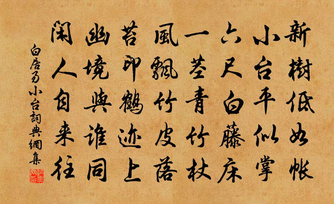新樹低如帳,小台平似掌。六尺白藤床,一莖青竹杖。