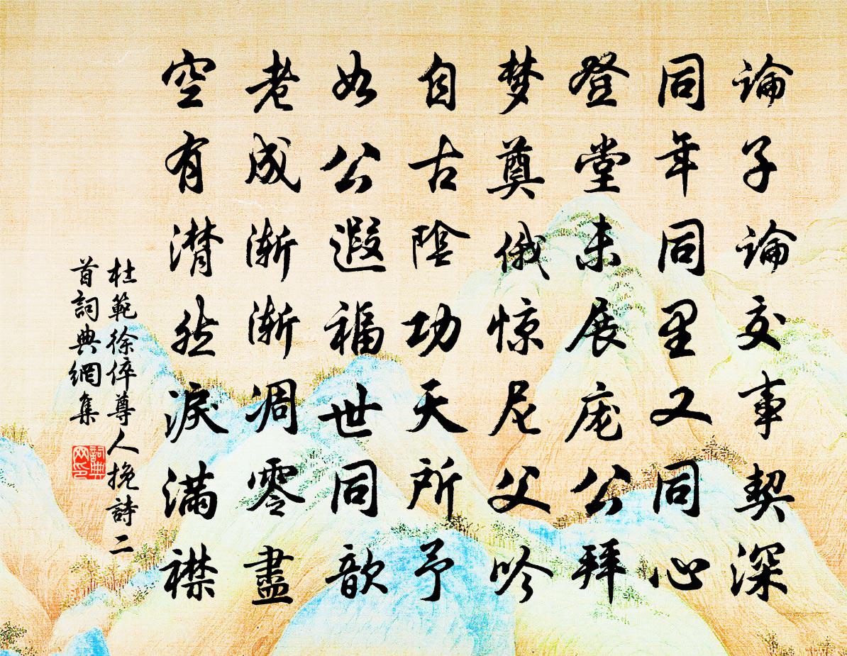 詩詞名句歷史字典書法欣賞書法字典國語詞典說文解字康熙字典古漢語字典標 題 作 者 詩 句 徐倅尊人輓詩二首作者:杜范 朝代:宋代徐倅尊人輓詩二首原文論子論交事契深,同年同里又同心。登堂未展龐公拜,夢奠俄驚尼父吟。自古陰功天所予,如公遐福世同歆。老成漸漸凋零盡,空有潸然淚滿襟。詩詞問答問:徐倅尊人輓詩二首的作者是誰?答:杜范問:徐倅尊人輓詩二首寫於哪個朝代?答:宋代杜范徐倅尊人輓詩二首書法欣賞徐倅尊人輓詩二首書法作品詩詞推薦不寐陸游〔宋代〕麗譙聽盡短長更,幽夢無端故不成。寒雨似從心上滴,孤燈偏向枕邊明。讀書有味身忘老,報國無期涕每傾。敢為楊柳枝薛師石〔宋代〕汴水堤邊薪可束,永豐巷口綠成堆。盛衰到底皆惆悵,何不移根種馬嵬。從宋憲登萬景樓晁公溯〔宋代〕勝地熊開傑觀,熊大川壯重關。使者領我來,共此須臾閒。玉節照綠野,銀熊落青綸。酒酣望八極,氣豪吞百蠻。漁父吳鎮〔元代〕月移山影照漁船。船載山行月在前。山突兀,月嬋娟。一曲漁歌山月送新除國博徐員外知婺州徐鉉〔唐代〕憐君盡室泛安流,職重官新未白頭。楚老歡迎歸舊里,春風留戀過揚州。逢時肯更嗟庭樹,屬詠還應上郡樓。宗黨讀書樓作王琮〔宋代〕近來閒過日,幽事頗相關。遠樹開晴書,歸雲當晚山。宦情隨處薄,詩稿逐時刪。骨若無仙分,何因住此間。宮詞楊皇后〔宋代〕天申聖節禮非常,躬率群臣上壽觴。天子捧盤仍再拜,侍中宣過近龍床。李謫仙金朋說〔宋代〕筆端文彩輝星斗,懷抱詩豪泣鬼神。超邁英才貫絕世,明皇寵異貴無倫。瓶蕉花董嗣杲〔宋代〕鵝項窯壺翠乾是,就中瓊卉裊清寒。暑天流影澄方沼,塵眼迷叢倚曲欄。幾葉但知青尾掉,數蕤易覺粉香殘。西風藍田溪雜詠二十二首潺湲聲錢起〔唐代〕亂石跳素波,寒聲聞幾處。颼颼暝風引,散出空林去。樂府曹植〔魏晉〕市肉取肥。酤酒取醇。交觴接杯。以致殷懃。與寶覺宿龍華院三絕句王安石〔宋代〕老於陳跡倦追攀,但見幽人數往還。憶我小詩成悵望,鍾山只隔數重山。次韻晁美叔游山見奇蘇頌〔宋代〕已踐修塗到急流,暫回俗駕喜同游。名為外物知難必,學悟無生信若浮。騷雅深情追李杜,林泉高興拉巢由。遲留八檜圖王令〔宋代〕客有要我八檜吟,手攜八檜圖來懸。掛張滿壁惕可駭,盼顧左右同嗟嘆。旁摹石刻署名狀,各有憑附相黃緣。或高寧考神御奉安原廟王遂〔宋代〕太室裸將嚴體薦,景靈朝獻薦牙盤。九重黼坐盤盂固,四海蒼生奠枕安。【雙調】沉醉東風關漢卿〔元代〕面比花枝解語,眉橫柳葉長疏。想著雨和雲,朝還暮,但開口只是長吁。紙鷂兒休將人廝應付,肯不肯懷兒里便許上曾安撫二首郭印〔宋代〕萬口爭稱好使君,攜持踴躍看朱輪。入門便灑隨車雨,到處真成有腳春。魚鳥一時生意氣,江山千里有精神。大賢高士詠混元皇帝吳筠〔唐代〕玄元九仙主,道冠三氣初。應物方佐命,棲真亦歸居。貽篇訓終古,駕景還太虛。孔父嘆猶龍,誰能知所如。夕次壽陽驛題吳郎中詩後韓愈〔唐代〕風光欲動別長安,春半城邊特地寒。不見園花兼巷柳,馬頭惟有月團團。自笑於石〔宋代〕歸來更讀十年書,自笑今吾即故吾。栗里溪山晉處士,桐江風月漢狂奴。種梅添得詩多少,愛菊何拘酒有無。隨分名句推薦窮巷多怪,曲學多辯。商鞅《商君書·更法》 謝公宿處今尚在,淥水蕩漾清猿啼李白《夢遊天姥吟留別/夢遊天姥山別東魯諸公》 霜殞蘆花淚濕衣,白頭無復倚柴扉。與恭《思母》 大道如青天,我獨不得出。李白《行路難三首》 弱柳青槐拂地垂,佳氣紅塵暗天起。盧照鄰《長安古意》 耐寒唯有東籬菊,金粟初開曉更清。白居易《詠菊》 書痴者文必工,藝痴者技必良。蒲松齡《聊齋志異·卷二·阿寶》 妾本秦羅敷,玉顏艷名都。李白《陌上桑》 王者不令人放生,而無故卻不殺生,則物命可惜也王永彬《圍爐夜話·第二四則》 望天王降詔,早招安,心方足。宋江《滿江紅·喜遇重陽》