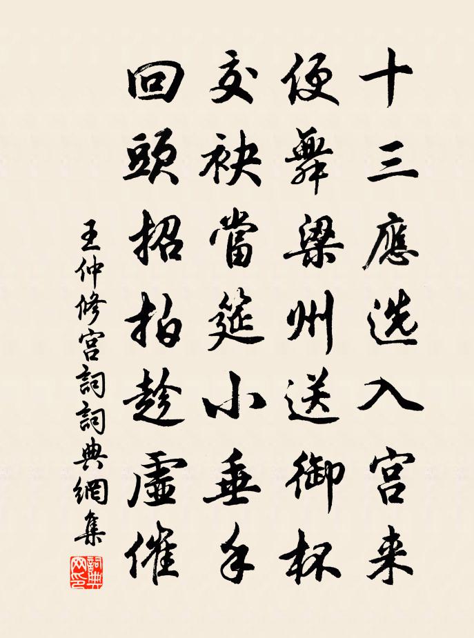 詩詞名句歷史字典書法欣賞書法字典國語詞典說文解字康熙字典古漢語字典標 題 作 者 詩 句 宮詞作者:王仲修 朝代:宋代宮詞原文十三應選入宮來,便舞梁州送御杯。交袂當筵小垂手,回頭招拍趁虛催。詩詞問答問:宮詞的作者是誰?答:王仲修問:宮詞寫於哪個朝代?答:宋代王仲修宮詞書法欣賞宮詞書法作品詩詞推薦次韻彭景貺陳造〔宋代〕紫燕穿簾若有求,不人端作置書郵。詩翁別後猶能酒,妄尉歸來亦未侯。江合香溫留語笑,花樓月好記從游。即今柳含煙·河橋柳毛文錫〔唐代〕河橋柳,占芳春,映水含煙拂路。幾回攀折贈行人,暗傷神。樂府吹為橫笛曲,能使離腸斷續。不如移植在金門,峨眉山廨趙汝回〔宋代〕褐衣蔬食苦吟身,肌骨雖清鬢雪新。栗里未營三畝宅,桃源已過一年春。也知官職難痴望,化得妻兒不誶貧。別寫寄郭德順劉過〔宋代〕玉弟金昆共七人,典刑惟有此公存。一區未盡揚雄宅,滿座常傾北海樽。人品細看真第一,詩篇遠寄不辭頻。筍輿和答任仲微贈別黃庭堅〔宋代〕任君灑墨即成詩,萬物生愁困品題。清似釣船聞夜雨,壯如軍壘動秋鼙。寒花籬腳飄金鈿,新月天涯掛玉篦。更欲西湖懷古張志道〔宋代〕荷花桂子不勝悲,江介繁華異昔時。天目山來孤鳳歇,海門潮去六龍移。賈充誤國終無策,庾信哀時尚有詞。莫向過龜山蘇轍〔宋代〕再涉長淮水,驚呼十四年。龜山老僧在,相見一茫然。僧老不自知,我老私自憐。驅馳定何獲,少壯空已捐。掉頭辯疑贈獻甫梅堯臣〔宋代〕一客逢吠狗,無箠制狗狂。一客叱狗吠,一客言狗良。良狗豈妄吠,好言已莫詳。言乃仁之趨,叱乃義所當。趨仁南安寓止韓偓〔唐代〕此地三年偶寄家,枳籬茅廠共桑麻。蝶矜翅暖徐窺草,蜂倚身輕凝看花。天近函關屯瑞氣,水侵吳甸浸晴霞。豈知書任村馬鋪王安石〔宋代〕兒童系馬黃河曲,近岸河流如可掬。任村炊米朝食魚,日暮滎陽驛中宿。投老經過身獨在,當時洲渚今平陸。秫黍與魏梅墅謝枋得〔宋代〕義熙陶令書甲子,春秋仲尼尊天王。孔明漢賊不兩立,梁公十念臣而皇。送程公明李新〔宋代〕自憐瘦骨飲冰寒,惆悵相逢下眼看。閒想顯人應笑我,道傍初試折腰官。三閭祠查慎行〔清代〕平遠江山極目回,古祠漠漠背城開。莫嫌舉世無知己,未有庸人不忌才。放逐肯消亡國恨?歲時猶動楚人哀!湘蘭喜遷鶯俞文豹〔宋代〕小梅幽絕。向冰谷深深,雲陰冪冪。飽閱年華,慣諳冷淡,只恁清臞風骨。任他萬紅千紫,句引狂蜂游蝶。惟只共冬夜宿仙遊寺南涼堂,呈謙道人岑參〔唐代〕太乙連太白,兩山知幾重。路盤石門窄,匹馬行才通。日西倒山寺,林下逢支公。昨夜山北時,星星聞此鍾。秦女依韻和胡舍人見唁梅堯臣〔宋代〕西垣閣老號文雄,辭體能兼兩漢風。絳帳舊生雖授學,灞陵歸將已無功。校文豈論居三上,賦分由來本下中。不恨浣溪沙·半夜銀山上積蘇軾〔宋代〕半夜銀山上積蘇。朝來九陌帶隨車。濤江煙渚一時無。空腹有詩衣有結,濕薪如桂米如珠。凍吟誰伴拈髭鬚。水心即事六乎兼謝吳民表宣義葉適〔宋代〕聽唱三更囉里論,白旁單槳水心村。潮回再入家家浦,月上遠當處處門。次韻米黻二王書跋尾二首蘇軾〔宋代〕三館曝書防蠹毀,得見來禽與青李。秋蛇春蚓久相雜,野鶩家雞定誰美。玉函金鑰天上來,紫衣敕使親臨啟。紛綸公孫孝子韓維〔宋代〕喪期著常數,在古固有之。嗟嗟三季後,禮讓俗亦衰。親亡有不葬,況問功與期。公孫布衣士,未免寒與飢。生兮名句推薦元宵佳節,融和天氣,次第豈無風雨。李清照《永遇樂·落日熔金》 幾時能命駕,對酒落花前。賈島《清明日園林寄友人》 日光下澈,影布石上,佁然不動;柳宗元《小石潭記》 一聲已動物皆靜,四座無言星欲稀。李頎《琴歌》 前村深雪裡,昨夜一枝開。齊己《早梅》 與朋友交,言而有信。孔子弟子《論語·學而篇》 美人卷珠簾,深坐顰蛾眉。李白《怨情》 萬物靜觀皆自得,四時佳興與人同。程顥《秋日》 蓮朝開而暮合,至不能合,則將落矣王永彬《圍爐夜話·第六九則》 讀書法,有三到。心眼口,信皆要。李毓秀《弟子規·餘力學文》
