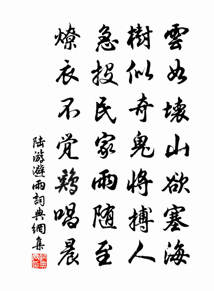 詩詞名句歷史字典書法欣賞書法字典國語詞典說文解字康熙字典古漢語字典標 題 作 者 詩 句 避雨作者:陸游 朝代:宋代避雨原文雲如壞山欲塞海,樹似奇鬼將搏人。急投民家雨隨至,燎衣不覺雞唱晨。詩詞問答問:避雨的作者是誰?答:陸游問:避雨寫於哪個朝代?答:宋代問:陸游的名句有哪些?答:陸游名句大全陸游避雨書法欣賞避雨書法作品詩詞推薦頌古一百則釋正覺〔宋代〕弦筈相銜,網珠相對。發百中而箭箭不虛,攝眾景而光光無礙。得言句之總,持住遊戲之三昧。妙其間也宛轉偏圓次韻范參政書懷陸游〔宋代〕芋栗多儲煮復煨,一塵那許到靈台。虹穿道室爐丹熟,龍吼空山匣劍開。躡屩未成游地肺,掩扉聊欲隱天台。桃花和頓主簿起見贈二首蘇轍〔宋代〕聲病消磨只古文,諸儒經術斗紛紜。不知舊學都無用,猶把新書強欲分。老病心情愁見敵,少年詞氣動乾雲。搜賢古意題徐令壁(一作題著作令壁)陳子昂〔唐代〕白雲蒼梧來。氛氳萬里色。聞君太平世。棲泊靈台側。滄浪亭有感二首錢時〔宋代〕莫倚危欄學凍吟,英雄到此淚沾襟。紛紛只解毛錐子,畢竟何人辦赤心。歲晚書事十首劉克莊〔宋代〕荒苔野蔓上籬笆,客至多疑不在家。病眼看人殊草草,隔林迢遞見梅花。雪晴二首白玉蟾〔宋代〕早上新鶯語尚蠻,花無氣力倚雕欄。幸蒙殘雪回頭早,又遣東風薄倖寒。香橘二首李石〔宋代〕千林獨覺一林芳,稼碧攙先送曉光。魯酒未妨杯雪冷,麝蘭半雜袖風香。顏闔蘇軾〔宋代〕顏闔古有道,躬耕自衣食。區區魯小邦,不足隱明德。軺軒來我門,聘幣繼金璧。山門應使者,耕稼不謀國。但疑送成都卒黎德升赴召崔侍郎薦士召者五人三首程公許〔宋代〕憶侍西征幕,叢談夜達晨。別來青鬢換,喜見此泥新。宸極拱朝幘,曉星看蜀珍。一朝樓五鳳,積憤洗峨岷。和簡叔孫應時〔宋代〕綠陰庭戶自生香,燕子飛來話日長。正有清風便午枕,更無塵夢到禪房。寄題程元成紛事山居三詠葵心堂楊萬里〔宋代〕人笑戎葵定自痴,不愁曦景蠶兼遲。便令隔霧光難到,也則傾心苦為誰。衛足平生非我志,向陽一點只天知。話頭溪館二首蔣堂〔宋代〕年來納組去,林下得身還。泚泚清流處,重重碧樹間。淵魚樂且靜,庭鶴壽而間。粗有淮安趣,誰同賦小山。問天皎然〔唐代〕天公何時有,談者皆不經。誰道賢人死,今為傅說星。和東林湛堂禪師喜雪韻五首袁燮〔宋代〕去歲寒雲久積陰,四郊雪片臘中深。今年一稔民安業,老守區區慰此心。游龍門歸韓維〔宋代〕洛浦殘芳盡,來尋關塞春。青林橫石閣,翠壁涌金人。澗草薰衣晚,松風落面新。愁驅向城騎,還踏九衢塵。人月圓 寄 源芝田禪師 北曲聊樂府前集今張可久〔元代〕龍湫山上雲屯寺,別是一乾坤。檜參百丈,雪深半尺,梅瘦三分。幾時親到,松邊弄水,月下敲門。相思無奈,煙劉侍讀見和山邸十篇重申此贈李嶠〔唐代〕神岳瑤池圃,仙宮玉樹林。乘時警天御,清暑滌宸襟。梁駕陪玄賞,淄庭掩翠岑。對岩龍岫出,分壑雁池深。檐迥太常樂章三十首其七酌獻第三室奏大順之舞曲楊億〔宋代〕明明我祖,積德累仁。居晦匿曜,邁種惟勤。帝圖天錫,輝光日新。寢廟繹繹,昭事同寅。九日無菊李新〔宋代〕芳物及時難,良辰曠野歡。古園荒草莽,秋雨禿闌乾。香桂風流減,戲萸氣味單。書紳懲淡飲,活取宿根寒。名句推薦提出西方白帝驚,嗷嗷鬼母秋郊哭。李賀《春坊正字劍子歌》 奸巧語,穢污詞。市井氣,切戒之。李毓秀《弟子規·信》 坐上別愁君未見,歸來欲斷無腸。蘇軾《臨江仙·送王緘》 淅淅西風淡淡煙,幾點疏疏雨。葛立方《卜運算元·席間再作》 鄉書不可寄,秋雁又南回。韋莊《章台夜思》 有客躊躇,古庭空自吊孤影。史達祖《齊天樂·中秋宿真定驛》 風急天高猿嘯哀,渚清沙白鳥飛回。杜甫《登高》 將軍玉帳貂鼠衣,手持酒杯看雪飛。劉基《北風行》 我未成名卿未嫁,可能俱是不如人。羅隱《贈妓雲英 / 嘲鍾陵妓雲英》 風起,雪飛炎海變清涼。蘇軾《定風波·南海歸贈王定國侍人寓娘》