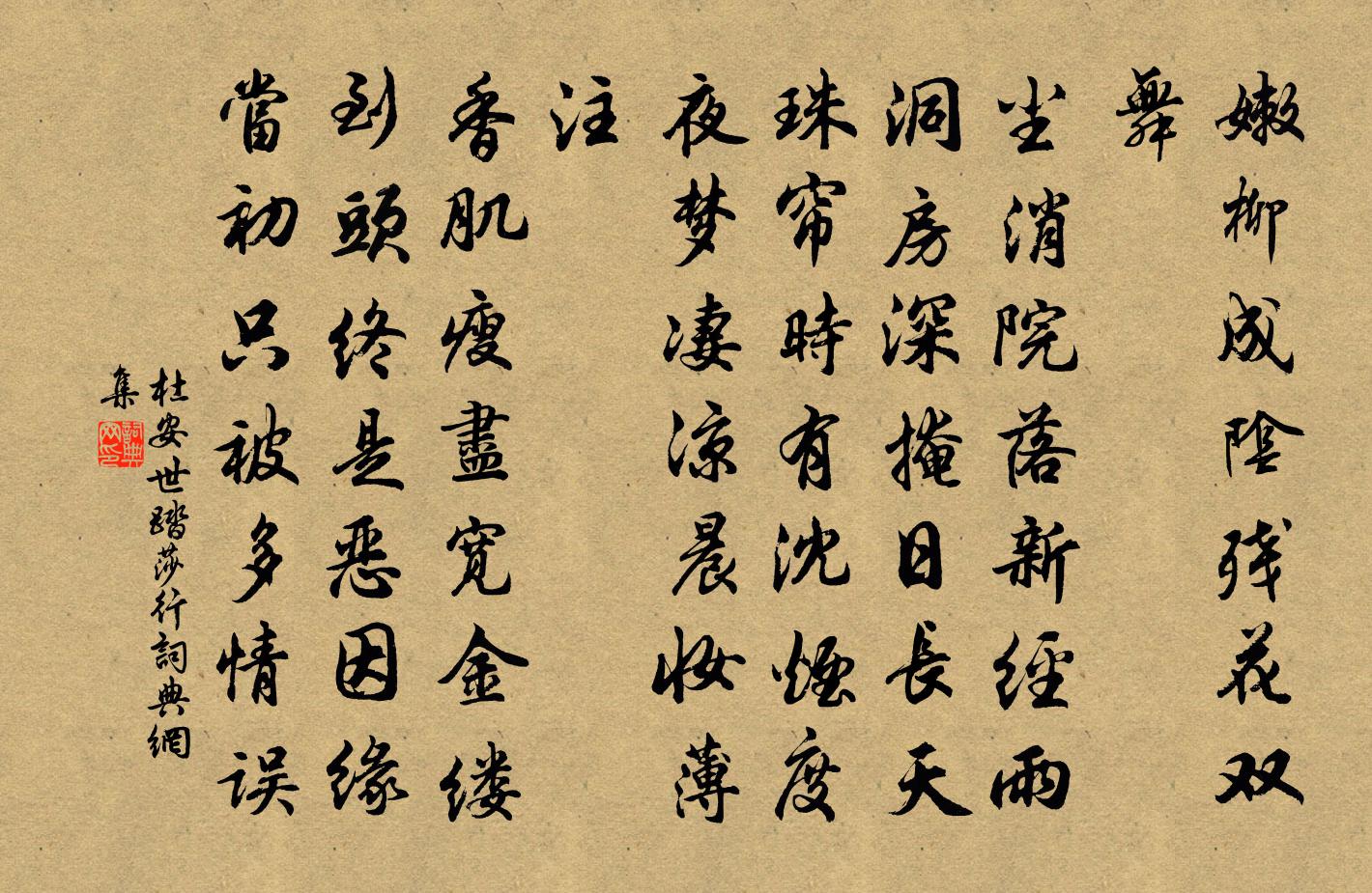 詩詞名句歷史字典書法欣賞書法字典國語詞典說文解字康熙字典古漢語字典標 題 作 者 詩 句 踏莎行作者:杜安世 朝代:宋代踏莎行原文嫩柳成陰,殘花雙舞。塵消院落新經雨。洞房深掩日長天,珠簾時有沈煙度。夜夢淒涼,晨妝薄注。香肌瘦盡寬金縷。到頭終是惡因緣,當初只被多情誤。詩詞問答問:踏莎行的作者是誰?答:杜安世問:踏莎行寫於哪個朝代?答:宋代問:踏莎行是什麼體裁?答:詞杜安世踏莎行書法欣賞踏莎行書法作品詩詞推薦秋日留題蔣亭羅鄴〔唐代〕西風才起一蟬鳴,便算關河馬上程。碧浪鷁舟從此別,丹霄鵠箭忍無成。二年芳思隨雲雨,幾日離歌戀旆旌。回首廬山雪王世懋〔明代〕朝日照積雪,廬山如白雲。始知靈境杳,不與眾山群。樹色空中斷,泉聲天半聞。千崖冰玉里,何處著匡君。 句劉應時〔宋代〕世事不復問,舊書時一首。梅雨杜甫〔唐代〕南京西浦道,四月熟黃梅。湛湛長江去,冥冥細雨來。茅茨疏易濕,雲霧密難開。竟日蛟龍喜,盤渦與岸回。思山居一十首憶葛勝木禪床李德裕〔唐代〕憶我齋中榻,寒宵幾獨眠。管寧穿亦坐,徐孺去常懸。蟲網垂應遍,苔痕染更鮮。何人及身在,歸對老僧禪。和陶讀山海經十三首韻送機簡堂自景星岩再住吳芾〔宋代〕吾邑多緇徒,浩浩若雲海。大機久已亡,賴有小機在。乃更與一岑,純全兩無悔。堂堂二老禪,海內共期待。長齋月滿,攜酒先與夢得對酌,醉中同赴令公白居易〔唐代〕齋宮前日滿三旬,酒榼今朝一拂塵。乘興還同訪戴客,解酲仍對姓劉人。病心湯沃寒灰活,老面花生朽木春。若怕和張王臣郊遊韻三首廖行之〔宋代〕山頭笑語落千家,曉入登臨引暮霞。極目未應煩笏拄,招朋端不羨魚叉。歸來皓月明於燭,睡熟黃紬臥放衙。幕府次韻魏定文王之道〔宋代〕半年去城府,寤寐溪東扉。有時得君書,想像抉石猊。豈知紀渻子,養氣如養雞。應鄉與疾視,一洗三旬非。我生奉和僕射相公送東川李支使歸使府夏侯相公薛逢〔唐代〕兩地交通布政和,上台深喜使星過。歡留白日千鍾酒,調入青雲一曲歌。寒柳翠添微雨重,臘梅香綻細枝多。平津奉酬盧端公飲後贈諸公見示之作戴叔倫〔唐代〕佐幕臨戎旌旆間,五營無事萬家閒。風吹楊柳漸拂地,日映樓台欲下山。綺席晝開留上客,朱門半掩擬重關。當時送晁殿丞鄭州簽判梅堯臣〔宋代〕朝離泌水上,夕去野亭賒。走馬日銜樹,度河風卷沙。關雲來雨腳,陂岸長蒲芽。共被方為樂,軍中莫摻撾。慶元二年恭上太皇太后皇太后太上皇帝太上皇佚名〔宋代〕宋有明德,天保佑之。以壽繼壽,以慈廣慈。聲文宣昭,福祉茂綏。神孫之休,燕及華夷。句幸夤遜〔唐代〕若教作鎮居中國,爭得泥金在泰山。用山谷上東坡韻與馮黎州李流謙〔宋代〕鼓鏞作宮庭,缶盎不能聲。仟圓起瀕死,乃欲進豨苓。 * 有痼疾,展卷自弱齡。俗學或攘之,正憂荊棘生。孔顏峽哀孟郊〔唐代〕昔多相與笑,今誰相與哀。峽哀哭幽魂,噭噭風吹來。墮魄抱空月,出沒難自裁。齏粉一閃間,春濤百丈雷。峽水喜雨黃公度〔宋代〕皇天嗇甘澤,為農生理休。哀哉桑麻瘁,得意蓬蒿稠。一夜溜檐雨,曉屋喧鳴鳩。驚濤注空壑,秀色溢平疇。田舍送僧之雙林釋心月〔宋代〕去到雙林見舊遊,眉彎新月眼橫秋。寒暄未舉宜先問,因甚橋流水不流。過王宗臣允元園廬三首趙蕃〔宋代〕大梁城裡王居士,園有江南數種梅。亂後只疑隨刼火,那知移向此間來。偈七首釋法泉〔宋代〕快人一言,快馬一夫。若便眼睛定動,未免紙裹麻纏。腳下是地,頭上是天。不信但看 * 月,紛紛黃葉滿山川。名句推薦思君若汶水,浩蕩寄南征。李白《沙丘城下寄杜甫》 惟有綠荷紅菡萏,卷舒開合任天真。李商隱《贈荷花》 老母與子別,呼天野草間。李白《豫章行》 過頭飯好吃,過頭話難聽!佚名《增廣賢文·下集》 回首暮雲遠,飛絮攪青冥。蘇軾《水調歌頭·昵昵兒女語》 今古長如白練飛,一條界破青山色。徐凝《廬山瀑布》 菡萏香銷翠葉殘,西風愁起綠波間。李璟《攤破浣溪沙·菡萏香銷翠葉殘》 反者道之動;弱者道之用。老子《老子·德經·第四十章》 言者異,則人心變矣。劉向《戰國策·趙三·秦攻趙於長平》 日射人間五色芝,鴛鴦宮瓦碧參差。元好問《浣溪沙·日射人間五色芝》