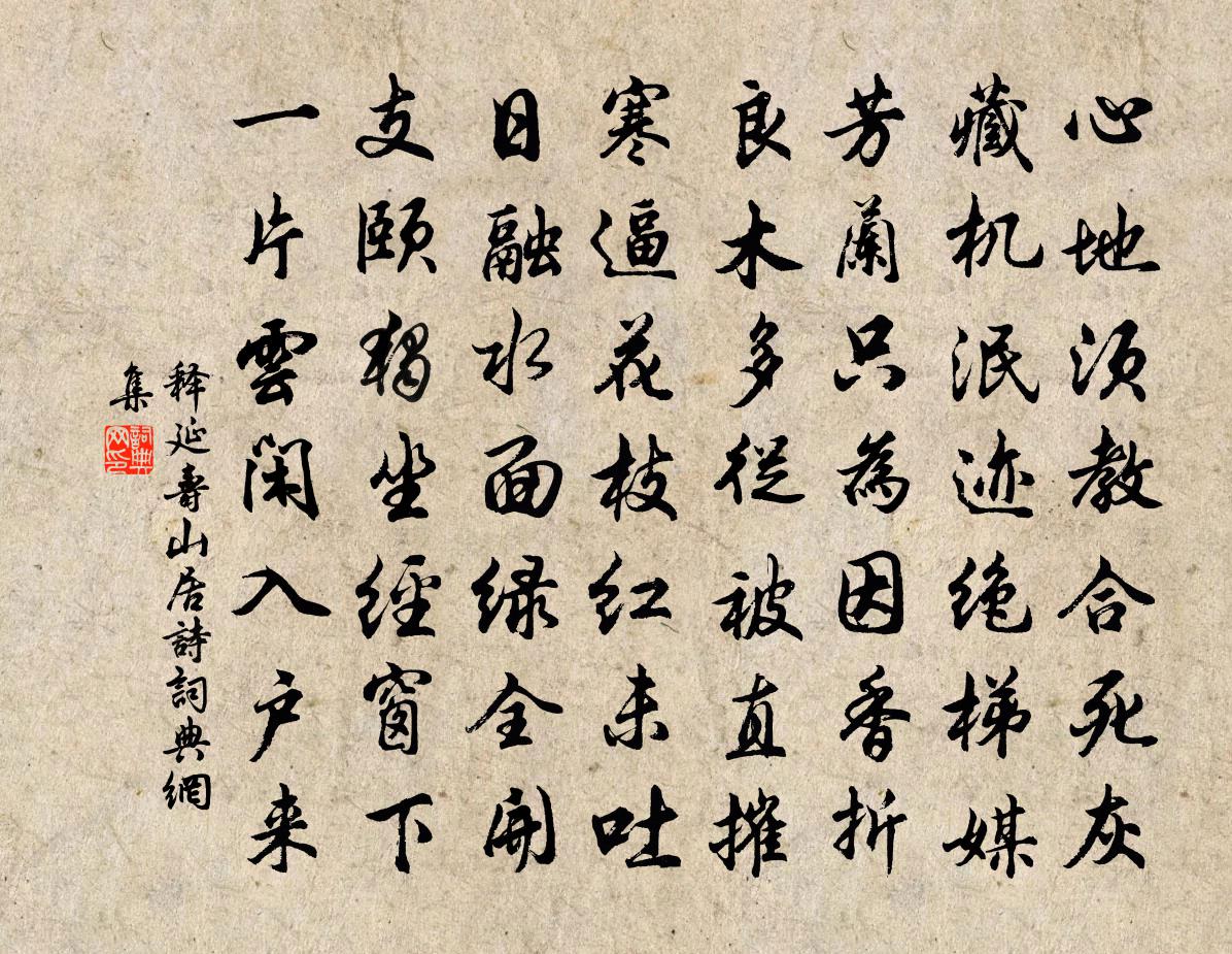 詩詞名句歷史字典書法欣賞書法字典國語詞典說文解字康熙字典古漢語字典標 題 作 者 詩 句 山居詩作者:釋延壽 朝代:宋代山居詩原文心地須教合死灰,藏機泯跡絕梯媒。芳蘭只為因香折,良木多從被直摧。寒逼花枝紅未吐,日融水面綠全開。支頤獨坐經窗下,一片雲閒入戶來。詩詞問答問:山居詩的作者是誰?答:釋延壽問:山居詩寫於哪個朝代?答:宋代釋延壽山居詩書法欣賞山居詩書法作品詩詞推薦紅梅 十五王冕〔元代〕仙子歸來逸興賒,夢中猶說舊繁華。春風轉首情何已?卻向江南認杏花。櫻桃漸熟牡丹已凋恨不同時輒題二韻王禹偁〔宋代〕紅芳落盡正無憀,吟遶空枝首重搔。最恨東君才思少,不留檀口待櫻桃。依韻馬都官宿縣齋梅堯臣〔宋代〕常愛陶潛遠世緣,阮家仍有竹◇◇娟。夜深風撼蕭蕭響,誰憶北窗人正眠。綠陰姚勉〔宋代〕紅滿芳蹊綠滿叢,未須惆悵怨東風。綠陰正耐經秋看,不比花才十日紅。九月一日稍佳演作五十六字終不及少陵牧之方回〔宋代〕少陵喔後牧之□,□□篇章可謂過。真是能專詩筆否,似應無奈菊花何。雁來秋老江湖落,病感風寒涕唾多。自古送王司馬之陝州(自太常丞授,工為詩)劉禹錫〔唐代〕暫輟清齋出太常,空攜詩卷赴甘棠。府公既有朝中舊,司馬應容酒後狂。案牘來時唯署字,風煙入興便成章。兩京早發沔縣遇雨曾國藩〔清代〕此身病起百無憂,敢為艱難一怨尤。曉霧忽飛千嶂雨,西風已作十分秋。近知地利其堪恃,早信人謀不自由。昨日詫嗟吟邵雍〔宋代〕昨日炙手,今日張羅。人間常事,何詫何嗟。和汪正夫梅鄭獬〔宋代〕好花有意似憐才,時泛清香入袂來。待得繁梢都結實,莫將細核比楊梅。祝英台/祝英台近王琪〔宋代〕可堪妒柳羞花,下床都懶,便瘦也教春知道。覽古十四首吳筠〔唐代〕聖人重周濟,明道欲救時。孔席不暇暖,墨突何嘗緇。興言振頹綱,將以有所維。君臣恣淫惑,風俗日凋衰。三代送進士高樞拱辰石介〔宋代〕韓門有李漢,柳氏得晦之。其道卒無患,二子為藩離。吾才誠駑弱,十年空孜孜。韓閫與柳閾,豈敢輒潛窺。二氏和陶淵明飲酒二十首方回〔宋代〕華鬢極老態,醜面乏妍姿。插花已不可,可插唯菊枝。□□偶有酒,此事竟大奇。連作數日飲,詩亦未暇為。小雞山樵人歌陸龜蒙〔唐代〕長其船兮利其斧,輸予薪兮勿予侮。田予登兮榖予庾,突晨煙兮蓬縷縷。窗有明兮編有古,飽而安兮惟編是伍,時沁園春(壽韋軒八十一歲·九月初二)佚名〔宋代〕 * 十翁,似嬰兒戲,漢司馬遷。記渭川垂釣,一年之長,龍山吹帽,七日之前。口角春風,襟期秋月,萬事從來秦淮劉元高〔宋代〕橫鑿南山貫北津,安知豐沛有真人。六朝不得中原土,猶使英雄欲過秦。句王隨〔宋代〕列岫縈迴青靄合,層江空闊碧天垂。神宗皇帝輓詞五首司馬光〔宋代〕式道清行馬,靈輴下陛簾。雲奔同軌集,雨泣兆民瞻。石闕蒼煙暝,松門白露沾。載弓隕絕,無計附經髯。雪後許月卿六〔宋代〕萬木未春先玉蕊,千峰非浪亦銀山。雪融畢竟無蹤跡,依舊梅花耐歲寒。寒夜呈梅深黃庚〔宋代〕空齊對孤客,寂寞似僧家。爐冷頻燒葉,燈昏不吐花。夜長添睡思,歲晚憶年華。吟倦推窗坐,梅檐月未斜。名句推薦月既不解飲,影徒隨我身。李白《月下獨酌四首·其一》 泰山嵯峨夏雲在,疑是白波漲東海。李白《早秋單父南樓酬竇公衡》 知一切法無我。得成於忍。鳩摩羅什譯《金剛經·不受不貪》 孤舟向廣武,一鳥歸成皋。岑參《鞏北秋興寄崔明允》 興國在於務農。陳壽《三國志·魏書·辛毗楊阜高堂隆傳》 莫嫌白髮不思量,也須有、思量去里。辛棄疾《鵲橋仙·送粉卿行》 對秋深,離恨苦,數夜滿庭風雨。孫光憲《更漏子·對秋深》 柳外輕雷池上雨,雨聲滴碎荷聲。歐陽修《臨江仙·柳外輕雷池上雨》 因思杜陵夢,鳧雁滿回塘。溫庭筠《商山早行》 或理在方寸而求之域表,或義在咫尺而思隔山河。劉勰《文心雕龍·神思》