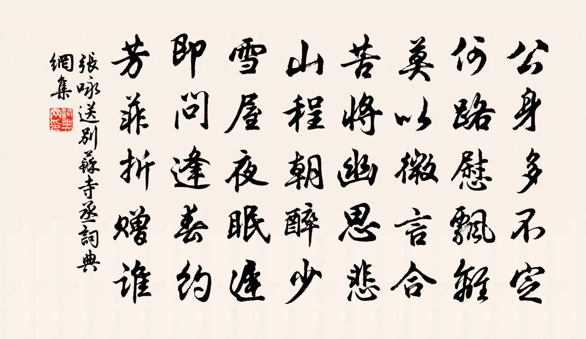詩詞名句歷史字典書法欣賞書法字典國語詞典說文解字康熙字典古漢語字典標 題 作 者 詩 句 送別蘇寺丞作者:張詠 朝代:宋代送別蘇寺丞原文公身多不定,何路慰飄離。莫以微言合,苦將幽思悲。山程朝醉少,雪屋夜眠遲。即問逢春約,芳菲折贈誰。詩詞問答問:送別蘇寺丞的作者是誰?答:張詠問:送別蘇寺丞寫於哪個朝代?答:宋代張詠送別蘇寺丞書法欣賞送別蘇寺丞書法作品詩詞推薦程顯學輓詞二首林季仲〔宋代〕憶向沙頭別,誰知地下游。祠堂只如舊,庭竹自生秋。回首山埋玉,傷心月滿樓。慎江日夜去,中有淚俱流。將入石壁山作釋智圓〔宋代〕慧遠風流廬岳隱,支公高尚沃洲棲。閒思石壁堪長往,擬躡浮雲上石梯。滿江紅 寄張藍山張之翰〔元代〕古木寒藤,高岸底、蕭然舟宿。一夜雨、朔風吹浪,浪高於屋。夢覺蓬窗無共語,此時正自憐幽獨。道藍山老子送再和四首劉克莊〔宋代〕伏閣何其壯,登舟得許哀。人多稱快者,上豈少恩哉。惡草毋留種,夭桃不待媒。九重方遠佞,寧放鄭詹來。送張著作孟侯宰上元梅堯臣〔宋代〕天衢車馬跡,急若機上梭。義雖平生篤,不越一再過。夫子累顧我,言歸泛長河。得邑美建業,風流猶可歌。依稀謝墳劉克莊〔宋代〕一月山行未有梅,曉來戲著小詩催。謝家墳寺更衣處,初見牆西半樹開。奉和襲美公齋四詠次韻鶴屏陸龜蒙〔唐代〕時人重花屏,獨即胎化狀。叢毛練分彩,疏節筇相望。曾無氃氋態,頗得連軒樣。勢擬搶高尋,身猶在函丈。如憂詠懷庾信〔南北朝〕周王逢鄭忿,楚後值秦冤。梯衝已鶴列,冀馬忽雲屯。武安檐瓦振,昆陽猛獸奔。流星夕照鏡,烽火夜燒原。古獄心月照雲溪王哲〔元代〕無常二字,說破教賢怕。百歲受區區,細思量、一場空話。*他火院,剛恁苦熬煎,早收心,采黃芽,藥就難酬價鍾陵餞送白居易〔唐代〕翠幕紅筵高在雲,歌鐘一曲萬家聞。路人指點滕王閣,看送忠州白使君。張彥容病未安卻問余病就報之曾豐〔宋代〕誤把維摩作病看,不知自欠起羸丸。殷勤浪說安心法,將取心來與汝安。客友項安世〔宋代〕君為閒客過豈朝,我車日過南湖橋。聽君論詩發幽秘,問君索酒澆岧嶢。誰將君賦告天子,武皇夜喚相如起。明朝菩薩蠻李真人〔元代〕還丹龍虎將何作。北方玄武南朱雀。朱雀變為龍。元宮養大蟲。大蟲食草木。龍愛吞金玉。交戰向滄溟。俱傷血滿水龍吟(壽游參政)李曾伯〔宋代〕岷峨壽佛東來,手移斗柄春寰宇。經綸事業,詩書流出,時為膏雨。載采三階,炳丹一念,雍容樞輔。望岩廊風範哭費拾遺征君姚合〔唐代〕服儒師道旨,糲食臥中林。誰識先生事,無身是本心。空山流水遠,故國白雲深。日夕誰來哭,唯應猿鳥吟。清平樂晏幾道〔宋代〕波紋碧皺。曲水清明後。折得疏梅香滿袖。暗喜春紅依舊。歸來紫陌東頭。金釵換酒消愁。柳影深深細路,花梢小移花孔武仲〔宋代〕春光不徘徊,忽過如插羽。匆匆陌上兒,移花急風雨。山波爛襭繡,平日誰指數。到此俱可憐,輕妍若時女。我家觀孔義甫與謝致仕詩有感鄭俠〔宋代〕人生足清閒,天下第一福。惜哉聲與利,舉世方逐逐。君子耀軒裳。小人腴口腹。霜雪滿頤頷。馳競心更速。誰如寄友王安之〔宋代〕憶昔青燈夜對床,冷猿聲里早梅香。一從去櫂沖寒雪,幾度憑闌到夕陽。秋思漸於蟬外覺,別愁空入雁邊長。梧桐送家安國赴成都教授三絕蘇轍〔宋代〕城西社下老劉君,春服舞雩今幾人。白髮弟兄驚我在,喜君遊宦亦天倫。〈微之先生門人,惟仆與子瞻兄、復禮與名句推薦秀色掩今古,荷花羞玉顏。李白《西施 / 詠薴蘿山》 時無英雄,使豎子成名!房玄齡《晉書·列傳·第十九章》 論如析薪,貴能破理。劉勰《文心雕龍·論說》 寧為太平犬,莫作亂離人!馮夢龍《醒世恆言·卷三》 淮水東邊舊時月,夜深還過女牆來。劉禹錫《金陵五題·石頭城》 又送王孫去,萋萋滿別情。白居易《草 / 賦得古原草送別》 北風其涼,雨雪其雱。佚名《北風》 穿天透地不辭勞,到底方知出處高。馮雲山《詠瀑布》 功名炊黍尋常夢,怪事書空感激人。王遜《西夏重陽》 父耕原上田,子劚山下荒。聶夷中《田家》