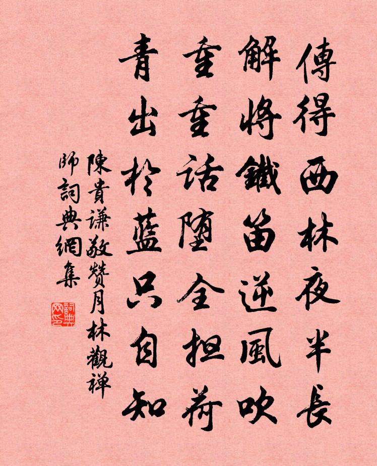 詩詞名句歷史字典書法欣賞書法字典國語詞典說文解字康熙字典古漢語字典標 題 作 者 詩 句 敬贊月林觀禪師作者:陳貴謙 朝代:宋代敬贊月林觀禪師原文傳得西林夜半長,解將鐵笛逆風吹。重重話墮全擔荷,青出於藍只自知。詩詞問答問:敬贊月林觀禪師的作者是誰?答:陳貴謙問:敬贊月林觀禪師寫於哪個朝代?答:宋代陳貴謙敬贊月林觀禪師書法欣賞敬贊月林觀禪師書法作品詩詞推薦秋夜泊舟亭山下陸游〔宋代〕逢水逢山到處留,可憐身世寄孤舟。一汀苹露漁村晚,十里荷花野店秋。羽檄未聞傳塞外,金椎先報擊衙頭。煌煌春帖子詞二十首九夫人合五首歐陽修〔宋代〕微風池沼輕澌漾,旭日樓台瑞藹浮。四海懽聲歌帝澤,萬家春色滿皇州。太常引姬翼〔元代〕道人活計要清虛。不受利名拘。囊橐一錢無。似出水、圓荷迸珠。一瓢餬口,衲衣遮體,此外更何圖。高枕及華胥予以淳熙戊戌歲自蜀歸時年五十四今三十有二陸游〔宋代〕入玉門關到酒泉,昔人想望若登天。豈知萬里西征客,歸臥家山三十年。醉歌陸游〔宋代〕老夫檣竿插蒼石,水落岸沙痕數尺。江南秋盡未搖落,槲葉離離楓葉赤。楚人自古多悲傷,道傍行歌猶感激。野花浣溪沙李元膺〔宋代〕乞與安仁掠鬢霜。不須紅線小機窗。剪刀疏下蜀羅長。縴手捻殘針縷細,金釵翻過齒痕香。同心小綰寄思量。吊柴道士馬廷鸞〔宋代〕老子猶龍不可親,莊周與蝶孰為真。補還石鼎吟邊句,飛作臨皋夢裡人。群鷗華岳〔宋代〕一聲漁笛發中流,驚起平沙萬點鷗。去盡青天回欲集,梨花無數落汀洲。東方曼倩張耒〔宋代〕軒冕功名何足為,先生聊作易農資。漢庭誅死皆卿相,猶說才能勝滑稽。清平樂·春來秋去晏殊〔宋代〕春來秋去,往事知何處。燕子歸飛蘭泣露。光景千留不住。酒闌人散忡忡。閒階獨倚梧桐。記得去年今日,依前黃和徐伯遠見寄三首王之道〔宋代〕三詩自可當尺書,得書何必須雙魚。黃花強把酬雪白,丐君捧腹聊軒渠。謝潘閬寄惠白雞魏野〔宋代〕遠惠雞同雪,應圖警臥雲。如君鳴有信,似我素無文。映樹迷蟾彩,臨流雜鷺群。朝昏可所恨,不共隔籬聞。翡翠曹組〔宋代〕窺魚潛立小荷圓,照水飛鳴更碧鮮。鬥草人歸尋墜翼,綺窗歸去補花鈿。感春三首韓愈〔唐代〕偶坐藤樹下,暮春下旬間。藤陰已可庇,落蕊還漫漫。新葉大,瓏瓏晚花乾。==青天高寥寥,兩蝶飛翻翻。時節鑿磨嶺趙蕃〔宋代〕復嶺重岡向背迷,瘦筇深與病夫宜。早禾未割尤艱食,過午人家猶未炊。還珠洞次曾宏正韻蕭桂林〔宋代〕標柱征南不記春,未應追感淚流痕。岩虛生白□心地,波洑澄清肅耳根。壯士於斯留顯跡,大夫非此賦招魂。江山【正宮】端正好_本是對美甘佚名〔元代〕本是對美甘甘錦堂歡,生紐做愁切切陽關怨。恰離了鶯花寨,早來到野水平川。急煎煎千里把程途踐,景蕭蕭宜寫從貫道求雙幅圖吳則禮〔宋代〕東郎平生筆五色,戲遣秀句為奇石。好絹自作凌亂光,萬里須論才咫尺。大兒小兒何足夸,右丞北苑有等差。孤舟去者日以疏佚名〔兩漢〕去者日以疏,來者日以親。出郭門直視,但見丘與墳。古墓犁為田,松柏摧為薪。白楊多悲風,蕭蕭愁 * 。思還分韻送胡丈歸建安汪應辰〔宋代〕先生高臥武夷巔,一旦趨朝豈偶然。報國自期如皦日,歸田曾不待來年。懷鉛共嘆楊雄老,鞭馬今輸祖逖先。冊府名句推薦將軍狐裘臥不暖,都護寶刀凍欲斷。岑參《天山雪歌送蕭治歸京》 何人解賞西湖好,佳景無時。歐陽修《採桑子·何人解賞西湖好》 天與三台座,人當萬里城。張九齡《奉和聖制送尚書燕國公赴朔方》 丁丁漏水夜何長,漫漫輕雲露月光。張仲素《秋夜曲》 花漸凋疏不耐風,畫簾垂地晚重工,墮階縈蘚舞愁紅孫光憲《浣溪沙·花漸凋疏不耐風》 出不入兮往不反,平原忽兮路超遠。屈原《國殤》 斬草除根,萌芽不發馮夢龍《警世通言·卷三十七》 啼號升斗抵千金,凍雀飢鴉共一音。范成大《雪中聞牆外鬻魚菜者求售之聲甚苦有感》 莫笑賤貧夸富貴,共成枯骨兩何如?白居易《放言五首·其四》 野徑雲俱黑,江船火獨明。杜甫《春夜喜雨》