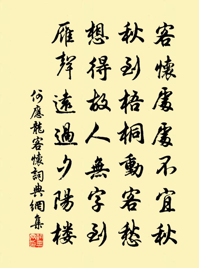 詩詞名句歷史字典書法欣賞書法字典國語詞典說文解字康熙字典古漢語字典標 題 作 者 詩 句 客懷作者:何應龍 朝代:宋代客懷原文客懷處處不宜秋,秋到梧桐動客愁。想得故人無字到,雁聲遠過夕陽樓。詩詞問答問:客懷的作者是誰?答:何應龍問:客懷寫於哪個朝代?答:宋代問:客懷是什麼體裁?答:七絕何應龍客懷書法欣賞客懷書法作品詩詞推薦相和歌辭。長門怨二首劉氏媛〔唐代〕雨滴梧桐秋夜長,愁心和雨到昭陽。淚痕不學君恩斷,拭卻千行更萬行。學畫蛾眉獨出群,當時人道便承恩。經年偈三首釋梵言〔宋代〕一生二,二生三,遏捺不住,廓周沙界。德靈直上妙峰,善財卻入樓閣。新婦騎驢阿家牽,山青水綠。桃華紅,李春晚陸游〔宋代〕寂寞又過桃李時,東園微雨草離離。破囷食外有餘粟,殘發白中生黑絲。小疾已能忘藥石,餘年寧復問蓍龜。飾巾泊羅廟魏良臣〔宋代〕清白聲華正直風,數千餘載譽增隆。侯封忠潔縉紳外,廟立汨羅煙靄中。新宇有功修已頓,舊碑無字讀難窮。他年奉謝泰亨送酒黃庭堅〔宋代〕風掃三峨山外雨,霜摧五柳宅邊花。非君送酒添秋睡,可耐東池到曉蛙。謝水福陳夢得見訪王邁〔宋代〕枝筇來訪白雲坳,絕異紅塵勢利交。把酒為君澆磊磈,攜詩就我定推敲,不曾出市曾龐老,安得為雲農盂郊。古錦大滿禪師贊釋慧開〔宋代〕再出頭來滿面塵,那堪喜舌興搖唇。松枯石爛憑誰委,累及痴呆蹈碓人。無題舒岳祥〔宋代〕豀草鴨頭相間綠,山榴雉頰一時紅。白鷗飛起無尋處,袞入梨花柳絮中。夜賦陳與義〔宋代〕泊舟華容縣,湖水終夜明。悽然不能寐,左右菰蒲聲。窮途事多違,勝處亦心驚。三更螢火鬧,萬里天河橫。阿瞞贈王伯長主簿陸游〔宋代〕學詩大略似參禪,且下功夫二十年。君要親嘗獅子吼,法須盡吐野狐涎。幾人錯會先師話,吾輩元齊古佛肩。天遣江山道中劉克莊〔宋代〕純綿未覺中年暖,薄酒難禁二月寒。可惜一溪桃李樹,貪程不得過橋看。清平樂(勸陳參政)史浩〔宋代〕吾皇睿哲。廷有真三傑。同向清時揚茂烈。掩跡皋陶夔契。聯鑣忽訪山樊。涼生花底清尊。太史明朝日奏,台星皆登懸瓠城感吳季子王珪〔唐代〕將軍戈甲從天下,丞相旌旗匝地來。堪笑怒螳猶強臂,不知蟄戶欲驚雷。咄嗟武相深冤洗,指顧山東治境開。吏部登鄱江樓黎廷瑞〔宋代〕江城一登眺,寒色有無間。帆拂沙頭樹,僧歸雲外山。樓高西照急,葉盡北風閒。世事何時足,悠悠飛鳥還。蝶戀花趙令畤〔宋代〕一夢行雲還暫阻。盡把深誠,綴作新詩句。幸有青鸞堪密付。良宵從此無虛度。兩意相歡朝又暮。爭奈郎鞭,暫指宿溧陽靈泉精舍僧以白字韻請留詩許堅〔唐代〕近枕吳溪與越峰,前朝恩錫靈泉額。竹林晴見雁塔高,石室增棲幾禪伯。荒碑字沒秋苔深,古池香泛荷花白。客有清知宋伯仁〔宋代〕詩債學無足,家園亦倦看。客游宜致仕,午睡當之官。舌笑張儀在,心憑達摩安。清和天氣好,應免袷衣寒。柳花虞詔〔宋代〕短長亭外柳依依,念我心歸未得歸。粉蝶不知行客恨,也隨飛絮點征衣。桑生李樹佚名〔〕南頓張助,于田中種禾,見李核,欲持去,顧見空桑,中有土,因植種,以余漿溉灌。後人見桑中反覆生李,轉相偈二十七首釋守淨〔宋代〕不用立雪庭下,不用斷臂師前。須信當人分上,已與佛祖齊肩。會得朝打八百,不會暮打三千。名句推薦朝陽不再盛,白日忽西幽。阮籍《詠懷八十二首·其三十二》 谷鳥吟晴日,江猿嘯晚風。李白《江夏別宋之悌》 璇室群酣夜,璜溪獨釣時。劉基《題太公釣渭圖》 寒隨一夜去,春逐五更來。史青《應詔賦得除夜》 殘星幾點雁橫塞,長笛一聲人倚樓。趙嘏《長安晚秋 / 秋望 / 秋夕》 牛靿咤咤,田確確,旱塊敲牛蹄趵趵。元稹《田家詞 / 田家行》 去年人在鳳凰池,銀燭夜彈絲薩都剌《小闌乾·去年人在鳳凰池》 吃不了兜著走曹雪芹《紅樓夢·第二十三回》 流丸止於甌臾,流言止於知者。荀子《荀子·大略》 不知何日東瀛變,此地還成要路津。劉禹錫《漢壽城春望》