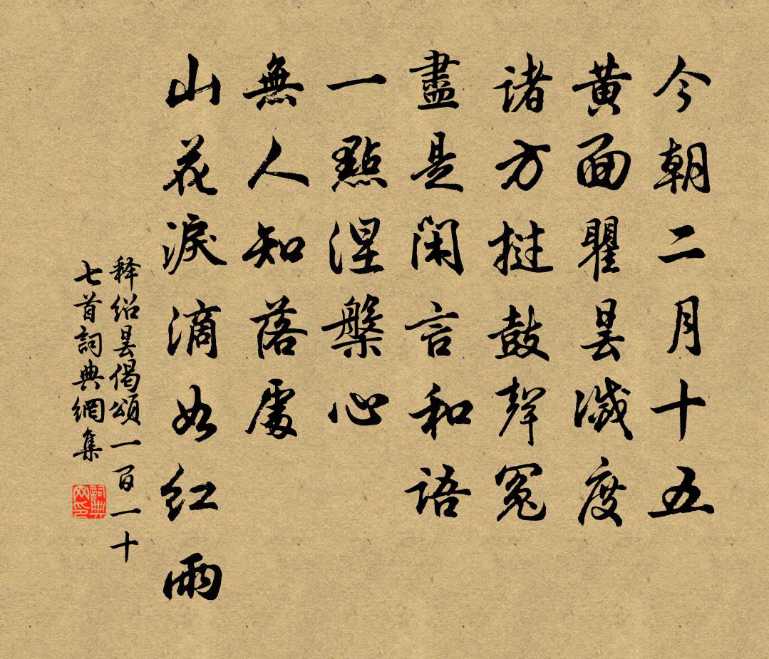 詩詞名句歷史字典書法欣賞書法字典國語詞典說文解字康熙字典古漢語字典標 題 作 者 詩 句 偈頌一百一十七首作者:釋紹曇 朝代:宋代偈頌一百一十七首原文今朝二月十五,黃面瞿曇滅度。諸方撾鼓聲冤,儘是閒言和語。一點涅槃心,無人知落處。山花淚滴如紅雨。詩詞問答問:偈頌一百一十七首的作者是誰?答:釋紹曇問:偈頌一百一十七首寫於哪個朝代?答:宋代釋紹曇偈頌一百一十七首書法欣賞偈頌一百一十七首書法作品詩詞推薦郴江百詠並序貪泉阮閱〔宋代〕玉潔冰寒徹底清,不因汲引有虧盈。廉泉讓水貪無異,空使時人惡此名。陌上花八首晁補之〔宋代〕吳歌白紵怨芳菲,腸斷懷王去不歸。陌上如今小花伴,山前山後白鷳飛。收襄陽城二首戎昱〔唐代〕悲風慘慘雨修修,峴北山低草木愁。暗發前軍連夜戰,平明旌旆入襄州。五營飛將擁霜戈,百里殭屍滿濜河。日暮慵起方回〔宋代〕慵起披衣出戶遲,今年最喜免招醫。粗容破灶炊雲子,可用芳筵佐雪兒。醉後作詩多不記,夢中讀易了無疑。雨晴孤雁嘆白玉蟾〔宋代〕孤雁聲嚘嚘,憂如司馬牛。君不見煮豆燃豆萁,斯人者斗米尺布渠豈羞。知有鶺鴒在原不,知有棠棣之華不。薌岩山居孟夏二十絕舒岳祥〔宋代〕雉子行傍叢,鹿麑下飲澗。近人固數驚,無心復遠患。凶宅白居易〔唐代〕長安多大宅,列在街西東。往往朱門內,房廊相對空。梟鳴松桂枝,狐藏蘭菊叢。蒼苔黃葉地,日暮多旋風。前主次韻種道行衙賞蓮花鄭俠〔宋代〕城中勢利如聚蛙,聒聒鼓鬧窮兩衙。忽聞攜樽命真賞,如見地涌金蓮花。況茲危亭跨高爽,極目四顧窮天涯。紅蕖詠清水岩呈郭明叔黃庭堅〔宋代〕嘗聞清水岩,空洞極明好。虎狼遷部曲,鐘鼓天擊考。雲生臥龍石,水入煉丹灶。有意攜管弦,山只應灑掃。哭虔州楊侍郎(虞卿)李商隱〔唐代〕漢網疏仍漏,齊民困未蘇。如何大丞相,翻作弛刑徒。中憲方外易,尹京終就拘。本矜能弭謗,先議取非辜。巧有頌古三十八首釋從瑾〔宋代〕無目仙人揣骨頭,暗中摸索認王侯。價高畢竟無人買,冷卻勾欄懡?休。雜興張鎡〔宋代〕伯牙善鼓琴,知音一子期。已得慰生平,絕弦勿復悲。深沉揚執戟,玄文準伏羲。各年未原賞,豈欲求當時。夏日北榭賦詩弈棋欣然有作陸游〔宋代〕異事嚴州省見稀,幅巾闌角立多時。青林白鳥自成畫,急雨好風當有詩。酷信醫方逢酒怯,強驅吏牘坐衙遲。悠然池上雙鳥薛濤〔唐代〕雙棲綠池上,朝暮共飛還。更憶將雛日,同心蓮葉間。謝虛中上人寄示題天策閣詩齊己〔唐代〕天策二首作,境幽搜亦玄。閣橫三楚上,題掛九霄邊。寺額因標勝,詩人合遇賢。他時誰倚檻,吟此豈忘筌。福先寺雪中酬別樂天劉禹錫〔唐代〕龍門賓客會龍宮,東去旌旗駐上東。二八笙歌雲幕下,三千世界雪花中。離堂未暗排紅燭,別曲含淒颺晚風。才子留別山中溫古上人兄並示舍弟縉王維〔唐代〕解薜登天朝,去師偶時哲。豈惟山中人,兼負松上月。宿昔同游止,致身雲霞末。開軒臨潁陽,臥視飛鳥沒。好依二月二十三日南雄解舟二首楊萬里〔宋代〕水沒蒲牙尚有梢,風吹屋角半無茅。急灘未到先聞浪,枯樹遙看只見巢。入界吳芾〔宋代〕日炙風吹人倦乏,山重水複路縈迴。一番行病思休息,且喜今朝入界來。閨怨王昌齡〔唐代〕閨中少婦不知愁,春日凝妝上翠樓。忽見陌頭楊柳色,悔教夫婿覓封侯。名句推薦春陰垂野草青青,時有幽花一樹明。蘇舜欽《淮中晚泊犢頭》 箴者,針也,所以攻疾防患,喻針石也。劉勰《文心雕龍·銘箴》 揚子江頭楊柳春,楊花愁殺渡江人。鄭谷《淮上與友人別》 神人之言微,聖人之言簡,賢人之言明,眾人之言多,小人之言妄。陳繼儒《小窗幽記·集醒篇》 欲將心事付瑤琴。岳飛《小重山·昨夜寒蛩不住鳴》 五月天山雪,無花只有寒。李白《塞下曲六首·其一》 卜以決疑,不疑何卜。李汝珍《鏡花緣·第十二回》 牛困人飢日已高,市南門外泥中歇。白居易《賣炭翁》 信使可覆,器欲難量。周興嗣《千字文·全文》 殘柳宮前空露葉,夕陽川上浩煙波。劉滄《經煬帝行宮》