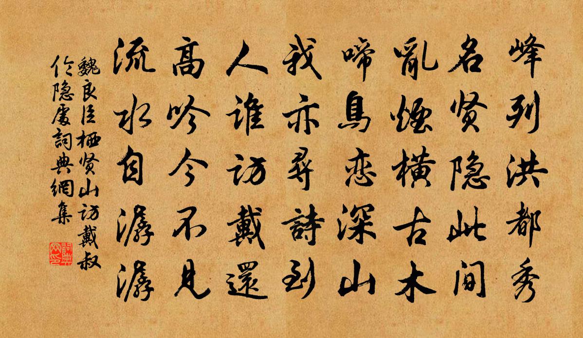 詩詞名句歷史字典書法欣賞書法字典國語詞典說文解字康熙字典古漢語字典標 題 作 者 詩 句 棲賢山訪戴叔倫隱處作者:魏良臣 朝代:宋代棲賢山訪戴叔倫隱處原文峰列洪都秀,名賢隱此間。亂煙橫古木,啼鳥戀深山。我亦尋詩到,人誰訪戴還。高吟今不見,流水自潺潺。詩詞問答問:棲賢山訪戴叔倫隱處的作者是誰?答:魏良臣問:棲賢山訪戴叔倫隱處寫於哪個朝代?答:宋代魏良臣棲賢山訪戴叔倫隱處書法欣賞棲賢山訪戴叔倫隱處書法作品詩詞推薦史致政輓詩魏了翁〔宋代〕口道先生易,躬行君子難。浮榮殘夢覺,活計一般酸。日晚烏聲急,風高雁影寒。行藏付千載,反覆要人看。水龍吟汪莘〔宋代〕當年翦彩垂髫,超然便欲為仙去。世間俗狀,人心狡計,不堪同住。每坐空山,獨臨古澗,神閒意寓。想瀛洲雞犬句趙善湘〔宋代〕正是澄清秋雨夜,空傳玉蕊發春晴。胡不歸二首高吉〔宋代〕煢煢盪子妻,空房守幽獨。 * 心緒長,吞聲忍夜哭。背燈耿孤影,香冷雲幕低。絕憐屋上烏,替人嗚嗚啼。鷓鴣天元好問〔金代〕拋卻浮名恰到閒。卻因猥懶得顢頇。從教道士夸懸解,未信禪和會熱謾。山院靜,草堂寬。一壺濁酒兩 * 。題詩贈四子二首陳造〔宋代〕交這眼亦班班,四子聲猷豈易攀。百里來羞長翁贐,片言仍解相公顏。事乖雅意疇忘嘆,我已南驅子北還。繼此開弟偁歸鄉楊億〔宋代〕吾家文雅占關西,五十年來桂兩枝。突弁後生還可畏,籯金素業未應衰。江湖去為思鱸膾,霧雨還歸養豹姿。摩厲挽饒武博二首陳元晉〔宋代〕方客戎幢右,俄旌墓道傍。堂虛空老桂,星冷落魁芒。留程文樣走,傳家奏稿香。鄉評偕李謝,雖死有幽光。夜遊宮陳允平〔宋代〕愁奈眉峰成斂。幾回皺、落花鈿點。鏡里芳容自羞見。又黃昏,聽南樓,度更箭。月引桐陰轉。珠簾動、影搖花亂浣溪沙(和仲聞對棋)舒亶〔宋代〕黑白紛紛小戰爭。幾人心手斗縱橫。誰知勝處本無情。謝傅老來思別墅,杜郎閒去憶鏖兵。何妨談笑下遼城。送少微上人游天台劉長卿〔唐代〕石橋人不到,獨往更迢迢。乞食山家少,尋鍾野路遙。松門風自掃,瀑布雪難消。秋夜聞清梵,餘音逐海潮。壬戌人日南溪暮景三首楊萬里〔宋代〕春暖溪暄出小魚,沉浮上下巧相娛。一跳一浪錢來大,開作瑤環忽丈余。次姜堯章贈詩卷中韻陳造〔宋代〕自甘謝祖風,屑屑掃一室。準擬高史來,函丈置三席。聲名絕輩行,文字追古昔。黃白馬上郎,覿面不相挹。十月葉巽齋〔宋代〕維此十月,歲聿云暮。惟月之良,是謂盈數。陰極於坎,陽比於子。陰陽消長,否泰攸寓。亶生哲人,盛世基柱。贈韓郎中愈孟郊〔唐代〕何以定交契,贈君高山石。何以保貞堅,贈君青松色。貧居過此外,無可相彩飾。聞君碩鼠詩,吟之淚空滴。碩鼠梅花十絕方岳〔宋代〕自有詩來幾許詩,玉堂吹徹又茅茨。阿誰不愛梅花句,未省梅花愛阿誰。於秀才小池方乾〔唐代〕一泓瀲灩復澄明,半日功夫劚小庭。占地未過四五尺,浸天唯入兩三星。鷁舟草際浮霜葉,漁火沙邊駐小螢。才見以王通一所畫小舟橫截春江圖為韓無咎壽章甫〔宋代〕江上春風花滿樹,春水才平舊痕處。何人笑傲一扁舟,橫截千波萬波去。王郎有句藏毫端,寫出生綃半幅間。明窗絕句楊杞〔宋代〕三間茅屋獨家村,風雨蕭蕭可斷魂。舊日相如猶有壁,如今無壁更無門。和徐徑坂衡陽使君韻題漁莊煙雨趙汝騰〔宋代〕列子御風旬五日,莊周稱壽八千秋。歸歟煙雨濛濛景,萼集班衣剩勸酬。名句推薦人生到處知何似,應似飛鴻踏雪泥。蘇軾《和子由澠池懷舊》 更可惜,雪中高樹,香篝熏素被。周邦彥《花犯·小石梅花》 身有傷,貽親憂。德有傷,貽親羞。李毓秀《弟子規·入則孝》 順天者存,逆天者亡。孟子《孟子·離婁章句上·第七節》 亂離何處見,訊息苦難真。吳偉業《遇舊友》 相知無遠近,萬里尚為鄰。張九齡《送韋城李少府》 名花傾國兩相歡,常得君王帶笑看。李白《清平調·名花傾國兩相歡》 料想故園桃李,也應怨月愁風趙崇《清平樂·懷人》 時無英雄,使豎子成名!房玄齡《晉書·列傳·第十九章》 儉則傷事,侈則傷貨管仲《管子·乘馬》