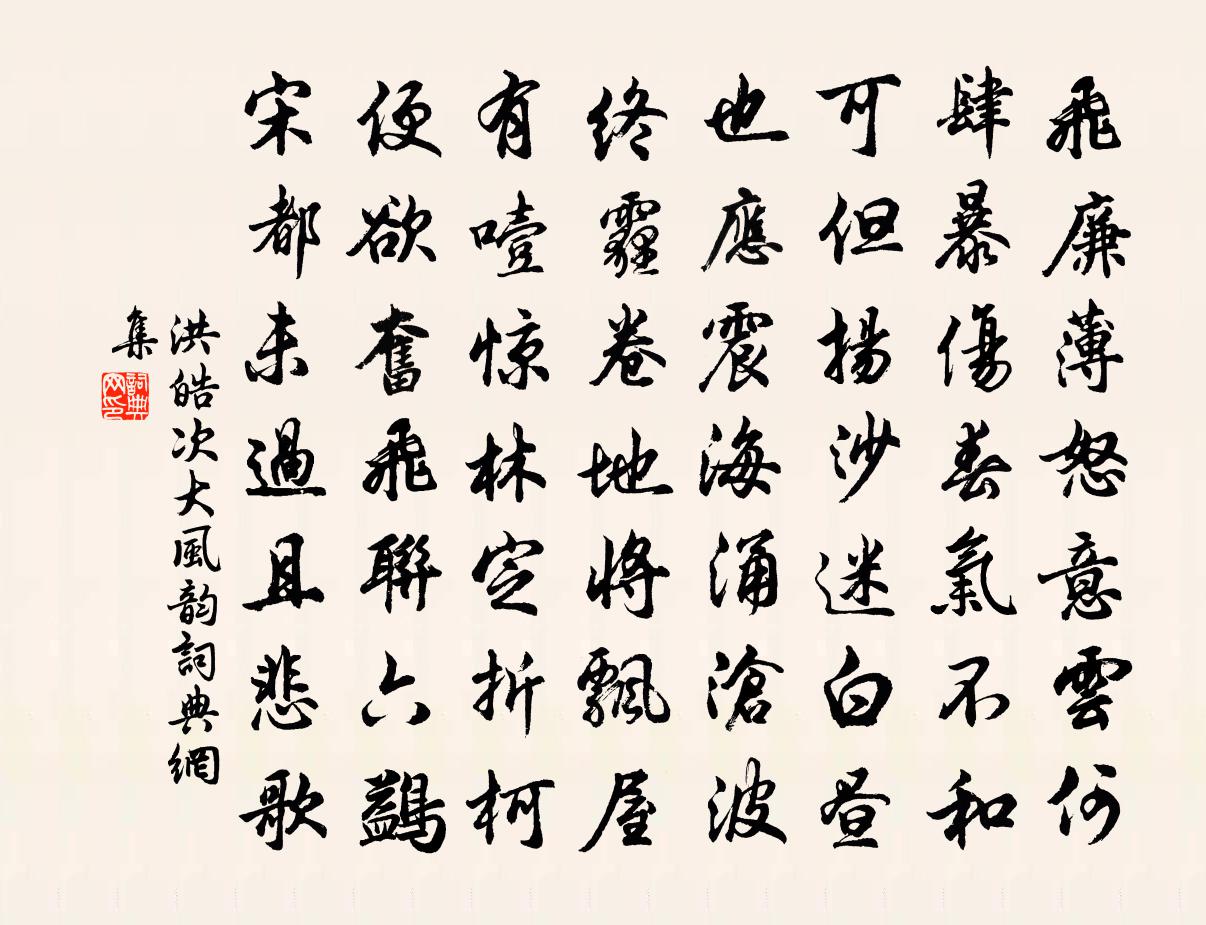 詩詞名句歷史字典書法欣賞書法字典國語詞典說文解字康熙字典古漢語字典標 題 作 者 詩 句 次大風韻作者:洪皓 朝代:宋代次大風韻原文飛廉薄怒意云何,肆暴傷春氣不和,可但揚沙迷白晝,也應震海涌滄波。終霾捲地將飄屋,有噎驚林定折柯。便欲奮飛聯六鷁,宋都未過且悲歌。詩詞問答問:次大風韻的作者是誰?答:洪皓問:次大風韻寫於哪個朝代?答:宋代洪皓次大風韻書法欣賞次大風韻書法作品詩詞推薦春日雜興胡仲弓〔宋代〕南岡北嶺對窗扉,看盡朝嵐與夕暉。社後未曾聞燕語,雨中誰不惜花飛。山醅約莫幾日熟,沙筍輪囷一尺圍。莫怨雜詩二十七首曹勛〔宋代〕飛去鶯兒黃一點,壓低梅子綠團枝。鉤窗卷箔涼生坐,但覺新陰轉影遲。得家書報敝居紫丁香盛開悵然有感吳芾〔宋代〕我家丁香大盈丈,天公靳惜非丹材。去年花開香滿屋,我方侷促纏悲哀。準擬今年必無事,盡可花下相追陪。何期水龍吟 游錢塘西山張野〔元代〕一鞭空翠煙霏,笑談已到山深處。丹崖翠壁,野猿幽鳥,冷泉高樹。兜率天中,蓬壺境內,偶成佳遇。正捫參歷井補樂府十篇帝神農氏之樂歌曹勛〔宋代〕豐年告成,百穀用合。匏籩既盈,黍稷既馨,昭假是膺。送何端卿帥瀘黃彥平〔宋代〕何侯石友平生事,傅粉風流詎可同。誰使擁旄三峽外,不留持橐五雲中。啼猿此去欺殘月,回雁因來吒便風。亦念雁來紅方岳〔宋代〕是葉青青花片紅,剪裁無巧似春風。誰將葉作花顏色,更與春風迥不同。感皇恩王庭珪〔宋代〕一葉下西風,寒生南浦。椎鼓鳴橈送君去。長亭把酒,卻倩阿誰留住。尊前人似玉,能留否。醉中暫聽,離歌幾許長郊雨餘遠樹減翠新蟬忽鳴激耳嘹唳久客孤坐寇準〔宋代〕遙山夏雨歇,遠樹涼風至。憑欄偶開襟,新蟬動秋思。沙溪潔細流,庭木驚疏翠。節候又復然,幽憂斯所萃。芳歲奔亡道中五首李白〔唐代〕蘇武天山上,田橫海島邊。萬重關塞斷,何日是歸年。亭伯去安在,李陵降未歸。愁容變海色,短服改胡衣。談笑送段九秀才歸澧州呂溫〔唐代〕湘南孤白芷,幽托在清潯。豈有馨香發,空勞知處深。摧賢路已隔,賑乏力不任。慚我一言分,貞君千里心。寸義夏日宋祁〔宋代〕六幕風輕晝刻長,地形卑濕近南方。人揮羽翣依林樾,綆續金瓶下井床。雲路飛鳶愁跕跕,玉徽流水怨湯湯。屍官懷寄樞密王左丞楊億〔宋代〕高陪七聖從軒游,帷幄深嚴日運籌。口裡雌黃歸品藻,盤中韭白想風流。珠宮地密妨趨謁,銅缽聲沉斷唱酬。獨喜句舒坦〔宋代〕沙岸金籠樹,燈汀玉涌濤。雜述林泳〔宋代〕壞事曾聞嗔怪鬼,捉囚可不畏天公。撫床衛瓘寧非醉,對策劉蕡恐是風。依韻和仲源獨夜吟梅堯臣〔宋代〕秋鴻聲澀秋弦苦,塗金博山煙夜吐。寂歷虛堂燈暈生,誰人共聽西窗雨。杪春寄友人王嵒〔宋代〕何處相逢萬事忙,卓家樓上百淘香。明朝漸近山僧寺,更為殘花醉一場。題鹿田西寺壁吳琳〔宋代〕為從吏隱招提宿,相望城中隔幾塵。雲暗雨來疑是晚,山深寒在不知春。鋤松得石添幽徑。接竹通泉隔近鄰。此去使君以十月上休日燕通判教授縣令錄參沅陵貴趙蕃〔宋代〕假日黃堂燕,窮冬白晝長。風流話前哲,翰墨出珍藏。莒國龍蛇字,西台錦繡章。東萊先理致,朱老繼顛狂。最後送子真給事出守常山蔡襄〔宋代〕安得長材護北州,暫煩儒將擁輕裘。聲名不啻一敵國,功業何須萬里侯。設館高牙延永晝,獵場飛騎入清秋。天樞名句推薦北風利如劍,布絮不蔽身。白居易《村居苦寒》 長恨春歸無覓處,不知轉入此中來。白居易《大林寺桃花》 金陵子弟來相送,欲行不行各盡觴。李白《金陵酒肆留別》 歸雁橫秋,倦客思家。張可久《折桂令·九日》 三萬里河東入海,五千仞岳上摩天。陸游《秋夜將曉出籬門迎涼有感》 曉窗移枕,酒困香殘,春陰簾卷。吳文英《燭影搖紅·元夕雨》 臣下之勸勞灼見,生民之疾苦周知。宋濂、王褘《元史·列傳·卷一》 辛苦遭逢起一經,干戈寥落四周星。文天祥《過零丁洋》 低花樹映小妝樓,春入眉心兩點愁。白居易《春詞》 五嶽尋仙不辭遠,一生好入名山游。李白《廬山謠寄盧侍御虛舟》
