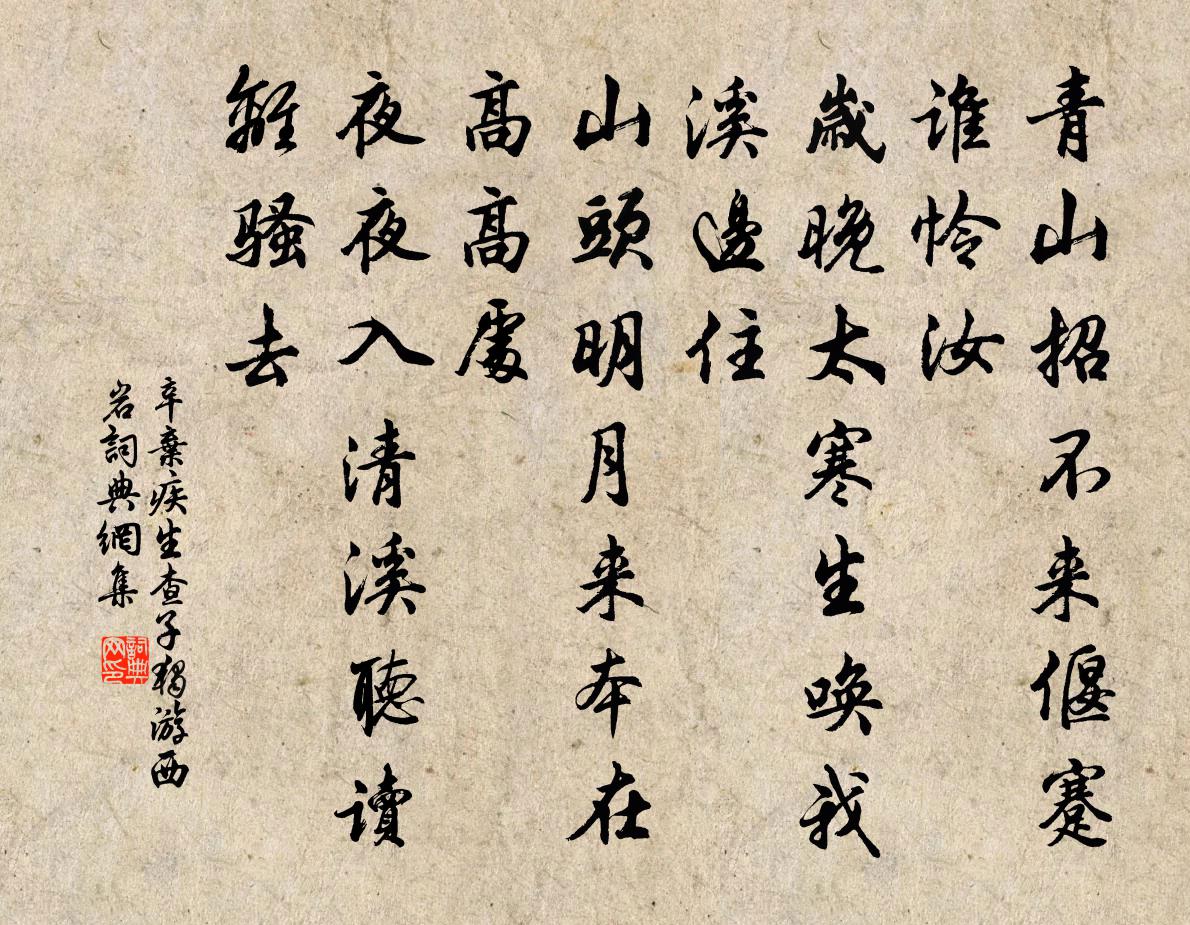 這首詞語言簡潔,內容深刻含蓄。初讀全詞,似乎作者寄情山水,與青山明月相交遊,心情輕鬆愉快。細加品味則不然。詞中描寫的是:歲暮天寒,素月清輝與澄澈的溪水相映 ,詞人孑然一身居于山中溪畔,長夜無眠,獨詠《離騷 》。這是一幅多么淒清、幽獨而又含有晶瑩色澤的圖畫!這圖畫中的主人公,不正是有志難申、懷才不遇、憂國憂民的作者形象嗎?