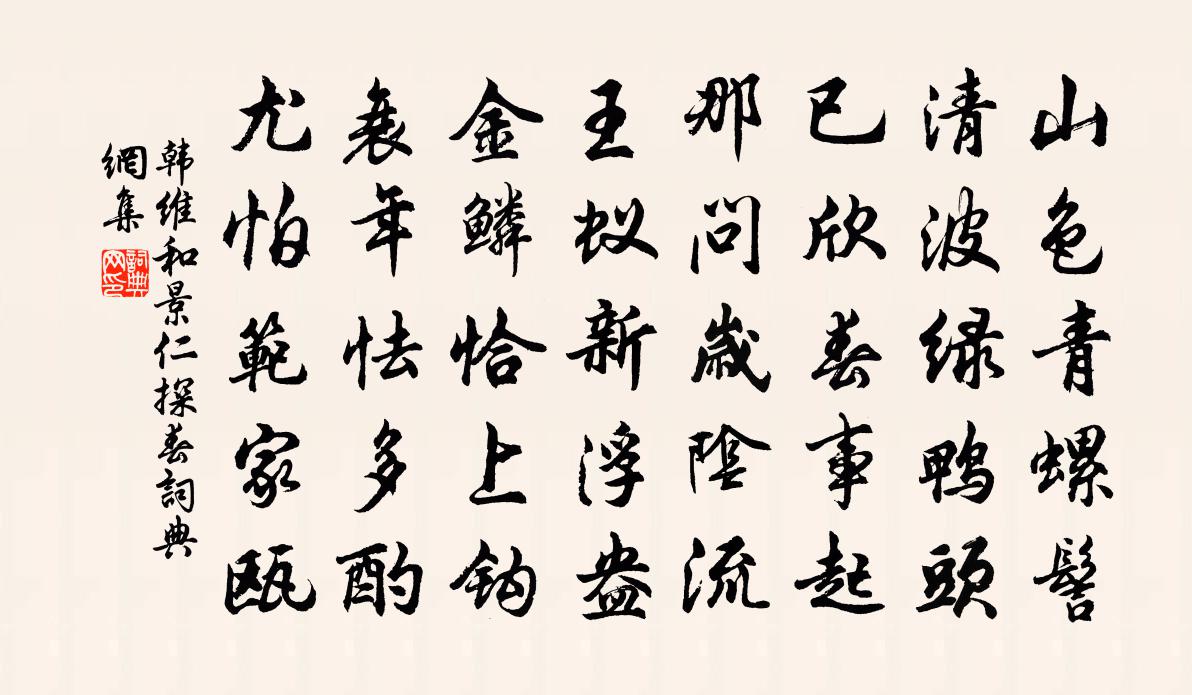 詩詞名句歷史字典書法欣賞書法字典國語詞典說文解字康熙字典古漢語字典標 題 作 者 詩 句 和景仁探春作者:韓維 朝代:宋代和景仁探春原文山色青螺髻,清波綠鴨頭。已欣春事起,那問歲陰流。王蟻新浮盎,金鱗恰上鉤。衰年怯多酌,尤怕范家甌。詩詞問答問:和景仁探春的作者是誰?答:韓維問:和景仁探春寫於哪個朝代?答:宋代韓維和景仁探春書法欣賞和景仁探春書法作品詩詞推薦舟過城門村,清曉雨止日出五首楊萬里〔宋代〕地錦花鋪地錦衣,碧茸上織紫花枝。垂楊舞罷鶯停唱,不捲華絪待阿誰。水龍吟 海蓱許氏舟名韓奕〔元代〕軟紅塵里忙人,有誰能識滄洲趣。飄然一葉,也無根蒂,御風千里。禪客蘆莖,仙翁蓮瓣,笑他方外。任浮家不繁泛舟至臨江院郭印〔宋代〕清江借篙師,津流不須問。行行鏡中天,水鳥嗔人近。絕岸得危亭,一目千里盡。山川草木妍,造物無少吝。誰知寄楊休文高士劉克莊〔宋代〕未答前書每有慚,忽收近訊自開緘。繳回玉笥山人號,換得金門羽客銜。石鼎聯詩塵滿硯,竹宮應制草盈函。可憐上張水部劉得仁〔唐代〕出入門闌久,兒童亦有情。不須將姓字,長說向公卿。每許連床坐,時容並馬行。恩深轉無語,懷抱自分明。寄胡遇賈島〔唐代〕一自殘春別,經炎復到涼。螢從枯樹出,蛩入破階藏。落葉書勝紙,閒砧坐當床。東門因送客,相訪也何妨。自嘆文天祥〔宋代〕草宿披宵露,松餐立晚風。亂離嗟我在,艱苦有誰同。祖逖關河志,程嬰社稷功。身謀百年事,宇宙浩舞窮。寄府吏張籍〔唐代〕野外尋花共作期,今朝出郭不相隨。待君公事有閒日,此地春風應過時。扇子詩李石〔宋代〕芒鞋踏破江頭路,日渴檀心猶未吐。渾教開盡不成梅,定應化作相思樹。京師阻雨二首張耒〔宋代〕深泥漫漫污后土,長安閉門三日雨。頑雲不動風伯愁,飛電更相雷師怒。陽烏力弱不自持,天漏已寬無石補。麥蛾寄致仕李洵大夫韓維〔宋代〕買得田園便退身,世間今作自由人。不爭路上風波靜,無相光中日月新。紅葉委階非異物,碧峰當戶見全真。知君雪夜趙葵〔宋代〕酒力欺寒淺,心清睡輕遲。梅花擎雪影,和月度疏籬。和元京兄賦苹花孫岩〔宋代〕一春觀物眼,紅紫厭繽紛。此水浮明玉,何人翦白雲。惠風游漢女,吉日禮湘君。地僻應無是,留花混藻芹。訪二陸故居林景熙〔宋代〕風流懷二陸,才名動三吳,期人不可作,千載空煙蕪。當時聘俊筆,萬象爭先驅。有如明月璧,美價傾鴻都。世運華清引(感舊)蘇軾〔宋代〕平時十月幸蘭湯。玉甃瓊梁。五家車馬如水,珠璣滿路旁。翠華一去掩方床。獨留煙樹蒼蒼。至今清夜月,依前過甲申四月甲子夜夢以焦坑小團及宜春新芽送隆周必大〔宋代〕達上座,惺惺著,靈根一點便通神,敗葉千林都掃卻。送裴相公赴鎮太原張籍〔唐代〕盛德雄名遠近知,功高先乞守藩維。銜恩暫遣分龍節,署敕還同在鳳池。天子親臨樓上送,朝官齊出道傍辭。明年辛酉二月十六日出暗門循城如北關登舟二首張嵲〔宋代〕城國排雲鎖病身,豈知城外物華新。非緣放逐循牆去,不見西湖萬頃春。喜鮑禪師自龍山至劉長卿〔唐代〕故居何日下,春草欲芊芊。猶對山中月,誰聽石上泉。猿聲知後夜,花發見流年。杖錫閒來往,無心到處禪。水調歌頭·九月望日與客習射西園余偶病不能射葉夢得〔宋代〕霜降碧天靜,秋事促西風。寒聲隱地,初聽中夜入梧桐。起瞰高城回望,寥落關河千里,一醉與君同。疊鼓鬧清曉名句推薦如貧得寶,如暗得燈,如飢得食,如旱得雲。馮夢龍《警世通言·卷九》 秋曉上蓮峰,高躡倚天青壁陸游《好事近·秋曉上蓮峰》 千門萬戶曈曈日,總把新桃換舊符。王安石《元日》 漢家天馬出蒲梢,苜蓿榴花遍近郊。李商隱《茂陵》 念往昔,繁華競逐,嘆門外樓頭,悲恨相續。王安石《桂枝香·登臨送目》 首夏猶清和,芳草亦未歇。謝靈運《游赤石進帆海》 越女新妝出鏡心,自知明艷更沉吟。張籍《酬朱慶餘》 遙知兄弟登高處,遍插茱萸少一人。王維《九月九日憶山東兄弟 / 九月九憶山東兄弟》 半竿落日,兩行新雁,一葉扁舟。賀鑄《眼兒媚·蕭蕭江上荻花秋》 羅襟濕未乾,又是淒涼雪。張淑芳《滿路花·冬》